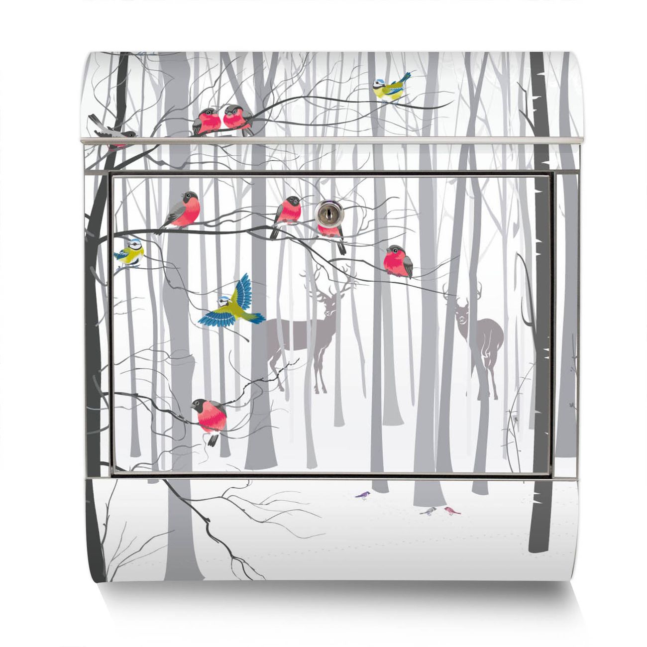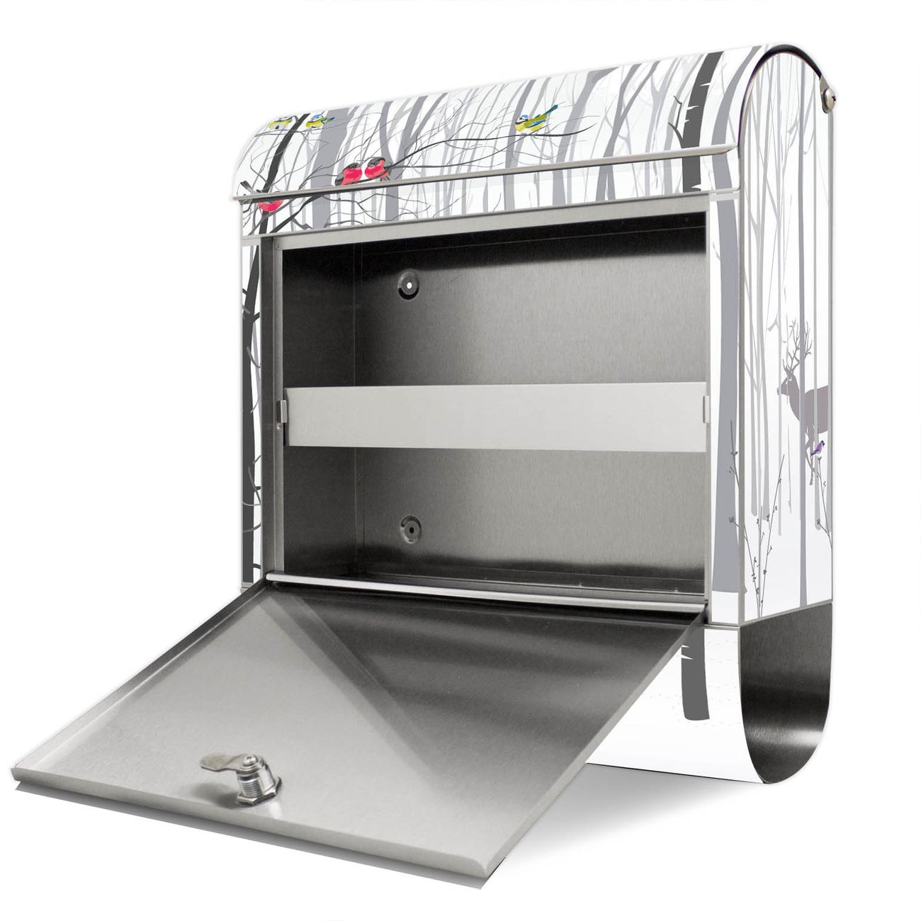 Der Motivstandbriefkasten hat ein sehr ansprechendes und ausgefallenes Design, damit entlocken Sie Ihren Nachbarn und dem Postboten ein Lächeln. Heben Sie Sich ab von der tristen grauen Masse, ohne auf Funktionalität zu verzichten. Der Briefkasten besteht aus hochwertigem 18/0 Edelstahl und die Wetter- und UV-resistenten Folie mit Winterwald Motiv ist zusätzlich mit einem Schutzlaminat überzogen. Der Standbriefkasten wird mit Montagematerial und zwei Schlüsseln geliefert.
