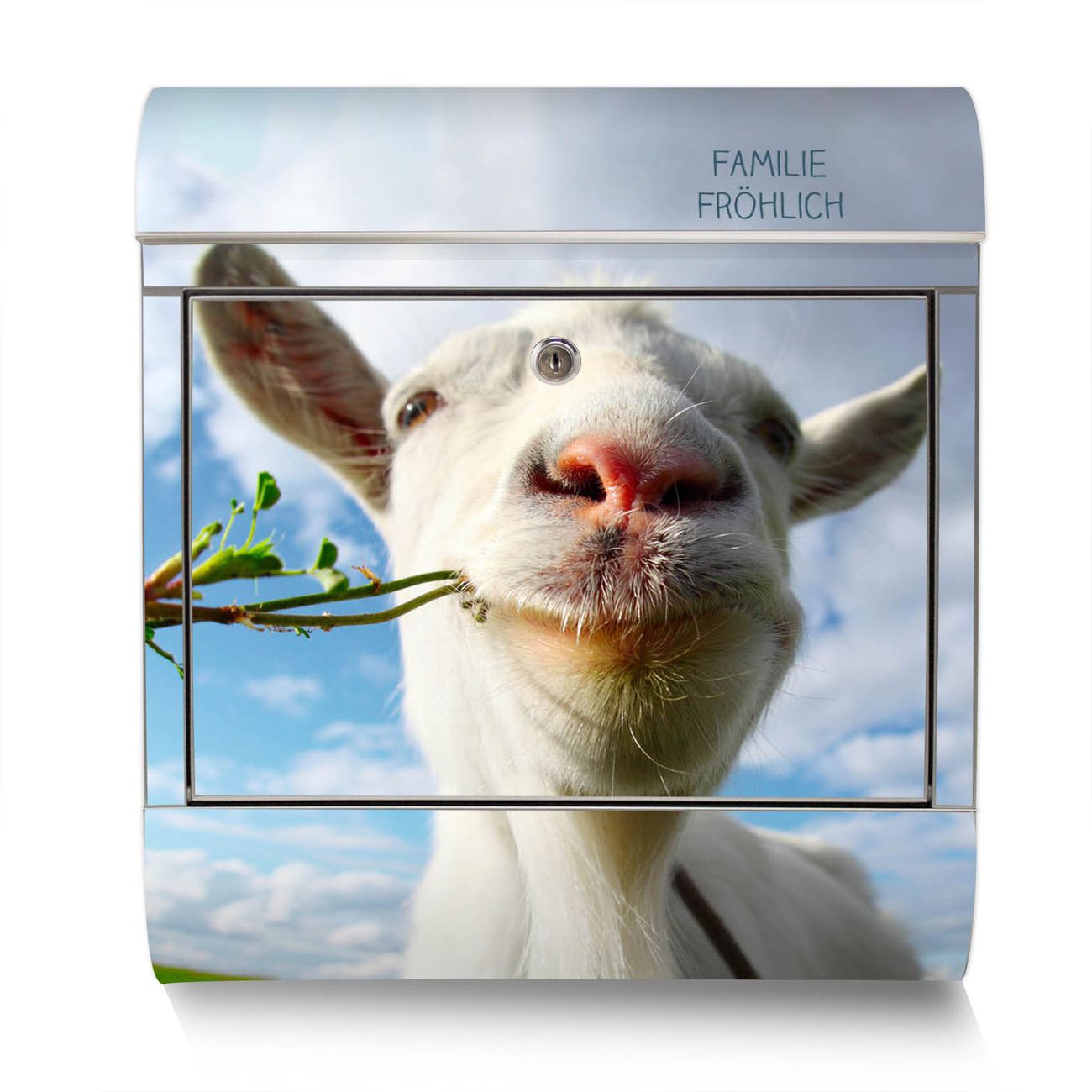 Der Motivstandbriefkasten hat ein sehr ansprechendes und ausgefallenes Design, damit entlocken Sie Ihren Nachbarn und dem Postboten ein Lächeln. Heben Sie Sich ab von der tristen grauen Masse, ohne auf Funktionalität zu verzichten. Der Briefkasten besteht aus hochwertigem 18/0 Edelstahl und die Wetter- und UV-resistenten Folie mit Ziege 2 Motiv ist zusätzlich mit einem Schutzlaminat überzogen. Der Standbriefkasten wird mit Montagematerial und zwei Schlüsseln geliefert.