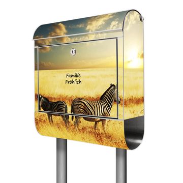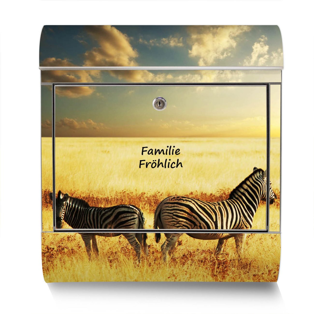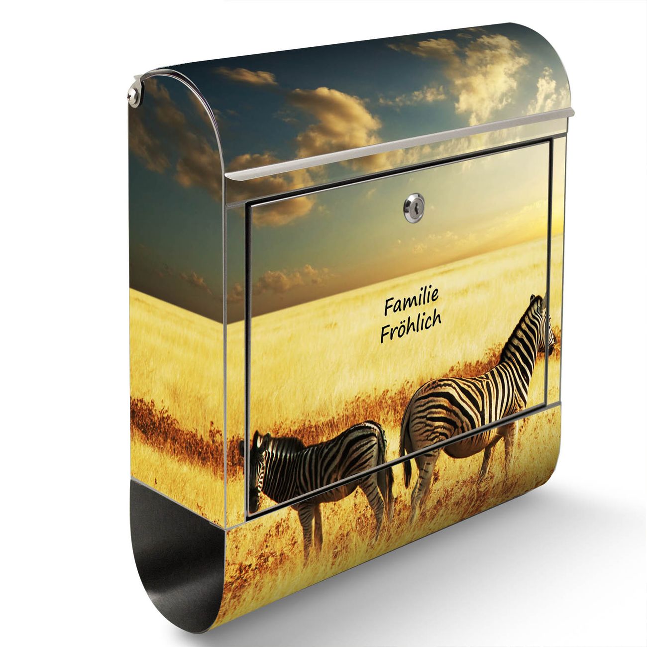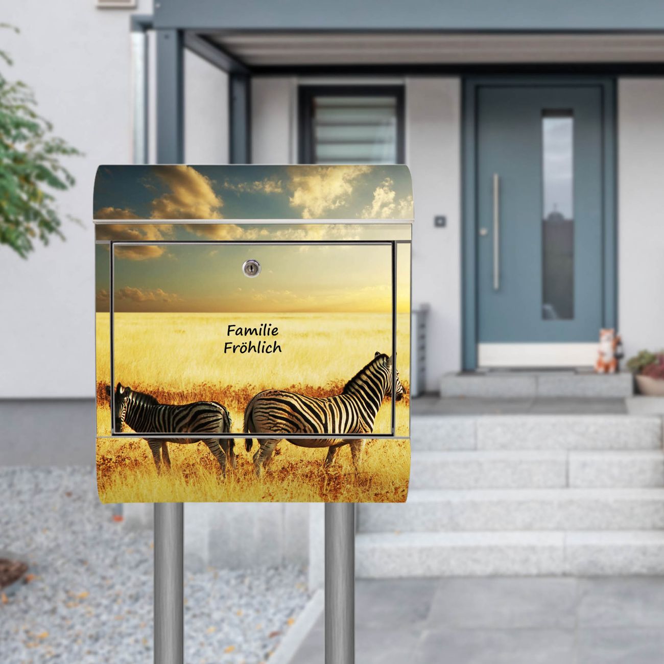 Der banjado Edelstahl Standbriefkasten mit Motiv Zwei Zebras und eigenem Wunschtext bietet Ihnen mit seinem Fassungsvermögen genügend Platz auch für große A4 Sendungen. Das integrierte Zeitungsfach eignet sich hervorragend, um unkompliziert die Tageszeitung zu fassen.