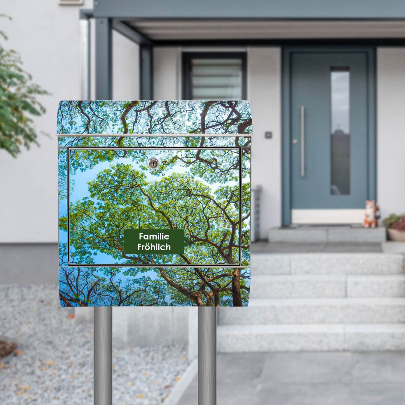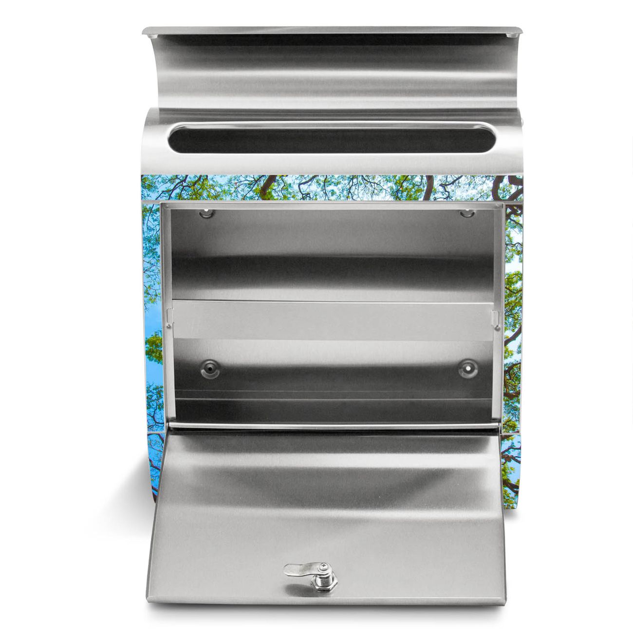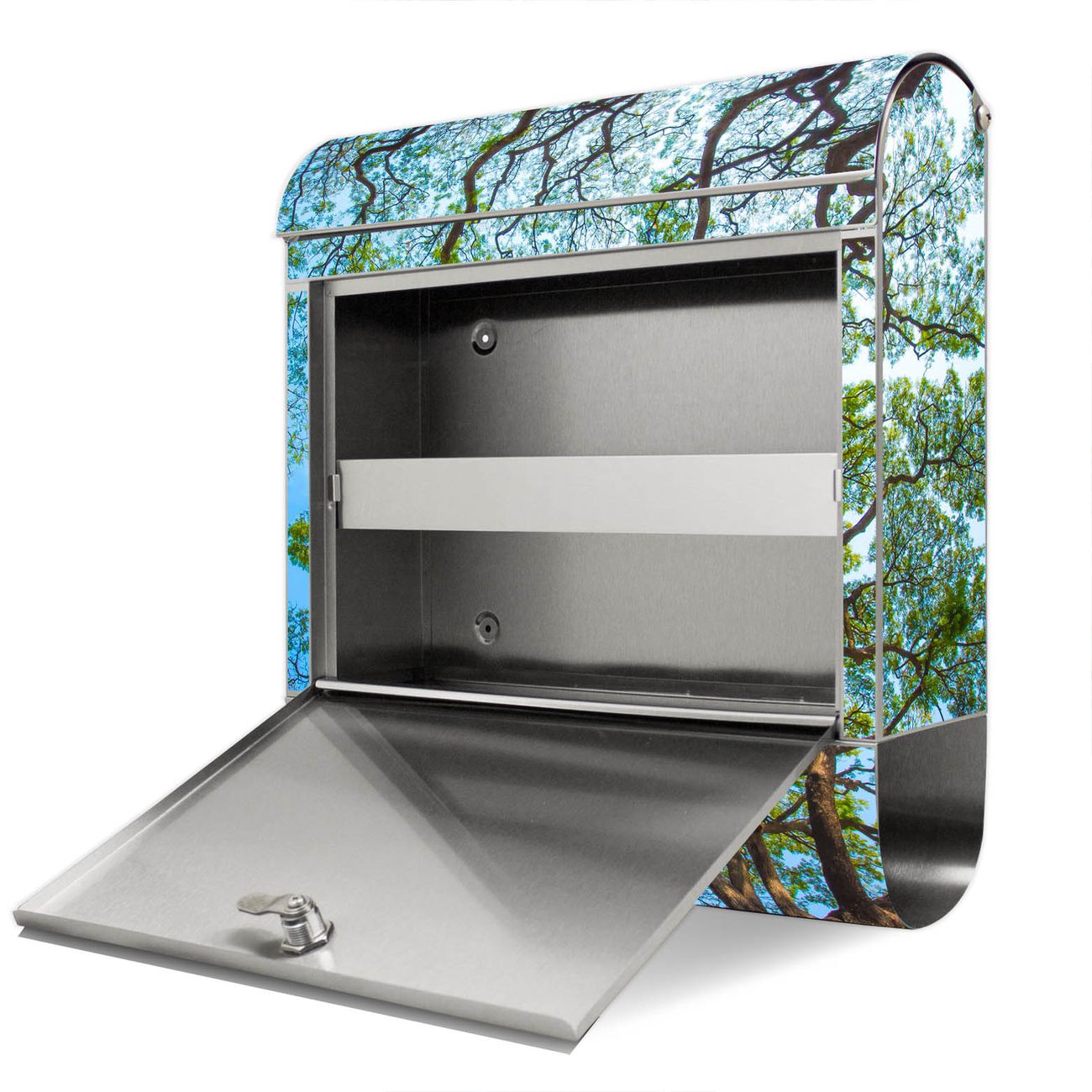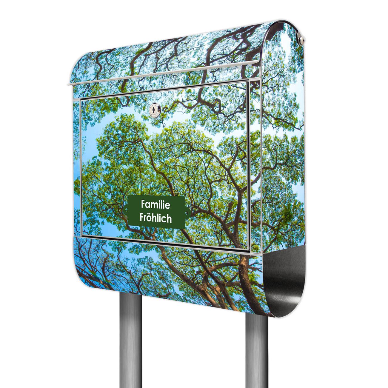 Der Motivstandbriefkasten hat ein sehr ansprechendes und ausgefallenes Design, damit entlocken Sie Ihren Nachbarn und dem Postboten ein Lächeln. Heben Sie Sich ab von der tristen grauen Masse, ohne auf Funktionalität zu verzichten. Der Briefkasten besteht aus hochwertigem 18/0 Edelstahl und die Wetter- und UV-resistenten Folie mit Zwischen Bäumen 2 Motiv ist zusätzlich mit einem Schutzlaminat überzogen. Der Standbriefkasten wird mit Montagematerial und zwei Schlüsseln geliefert.