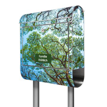 Der banjado Edelstahl Standbriefkasten mit Motiv Zwischen Bäumen 2 und eigenem Wunschtext bietet Ihnen mit seinem Fassungsvermögen genügend Platz auch für große A4 Sendungen. Das integrierte Zeitungsfach eignet sich hervorragend, um unkompliziert die Tageszeitung zu fassen.