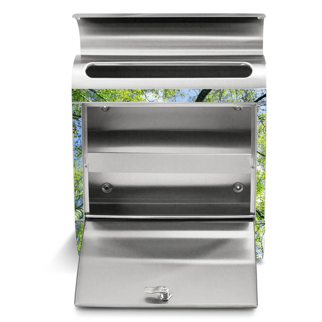 Der banjado Edelstahl Standbriefkasten mit Motiv Zwischen Bäumen 3 bietet Ihnen mit seinem Fassungsvermögen genügend Platz auch für große A4 Sendungen. Das integrierte Zeitungsfach eignet sich hervorragend, um unkompliziert die Tageszeitung zu fassen.