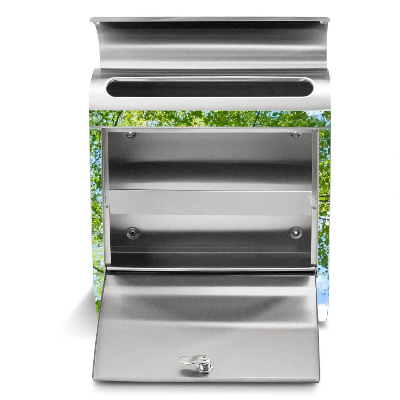 Der Motivstandbriefkasten hat ein sehr ansprechendes und ausgefallenes Design, damit entlocken Sie Ihren Nachbarn und dem Postboten ein Lächeln. Heben Sie Sich ab von der tristen grauen Masse, ohne auf Funktionalität zu verzichten. Der Briefkasten besteht aus hochwertigem 18/0 Edelstahl und die Wetter- und UV-resistenten Folie mit Zwischen Bäumen 5 Motiv ist zusätzlich mit einem Schutzlaminat überzogen. Der Standbriefkasten wird mit Montagematerial und zwei Schlüsseln geliefert.