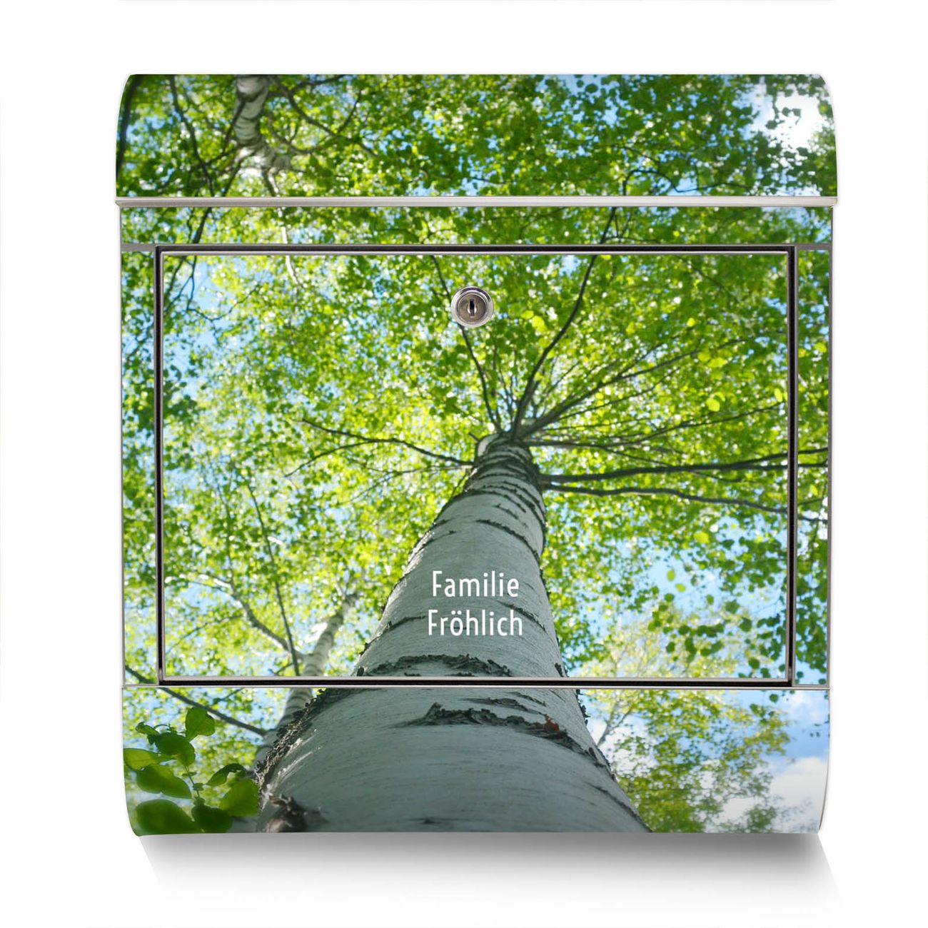 Der banjado Edelstahl Standbriefkasten mit Motiv Zwischen Bäumen 5 und eigenem Wunschtext bietet Ihnen mit seinem Fassungsvermögen genügend Platz auch für große A4 Sendungen. Das integrierte Zeitungsfach eignet sich hervorragend, um unkompliziert die Tageszeitung zu fassen.
