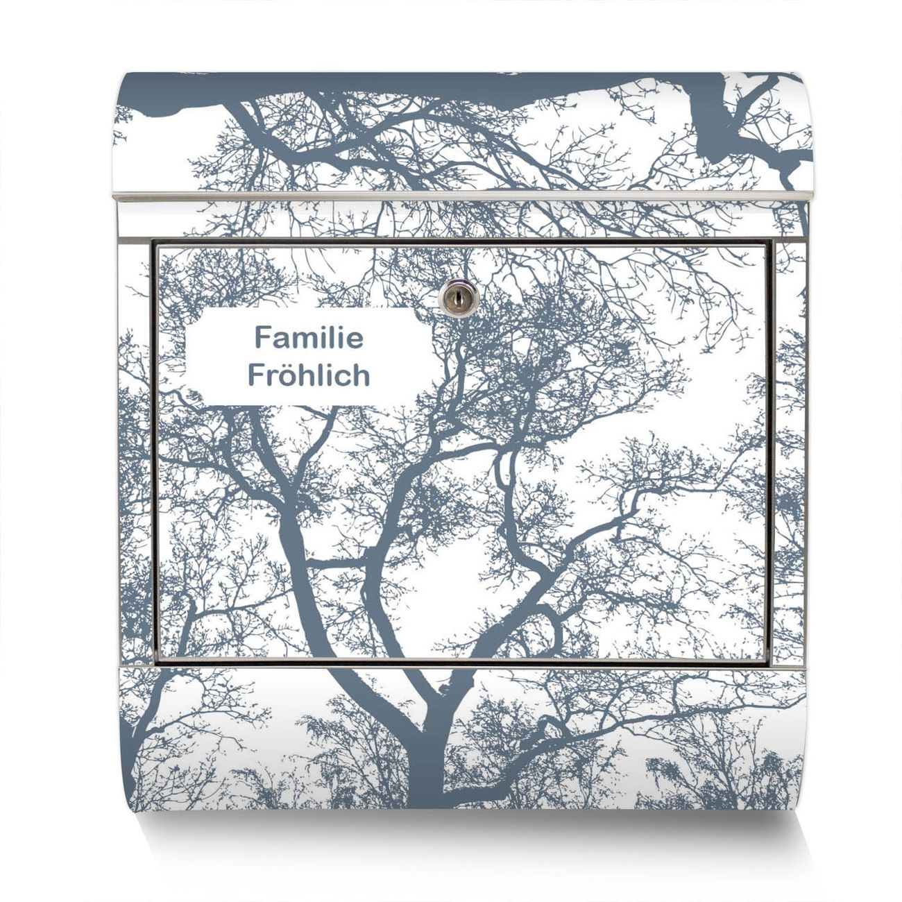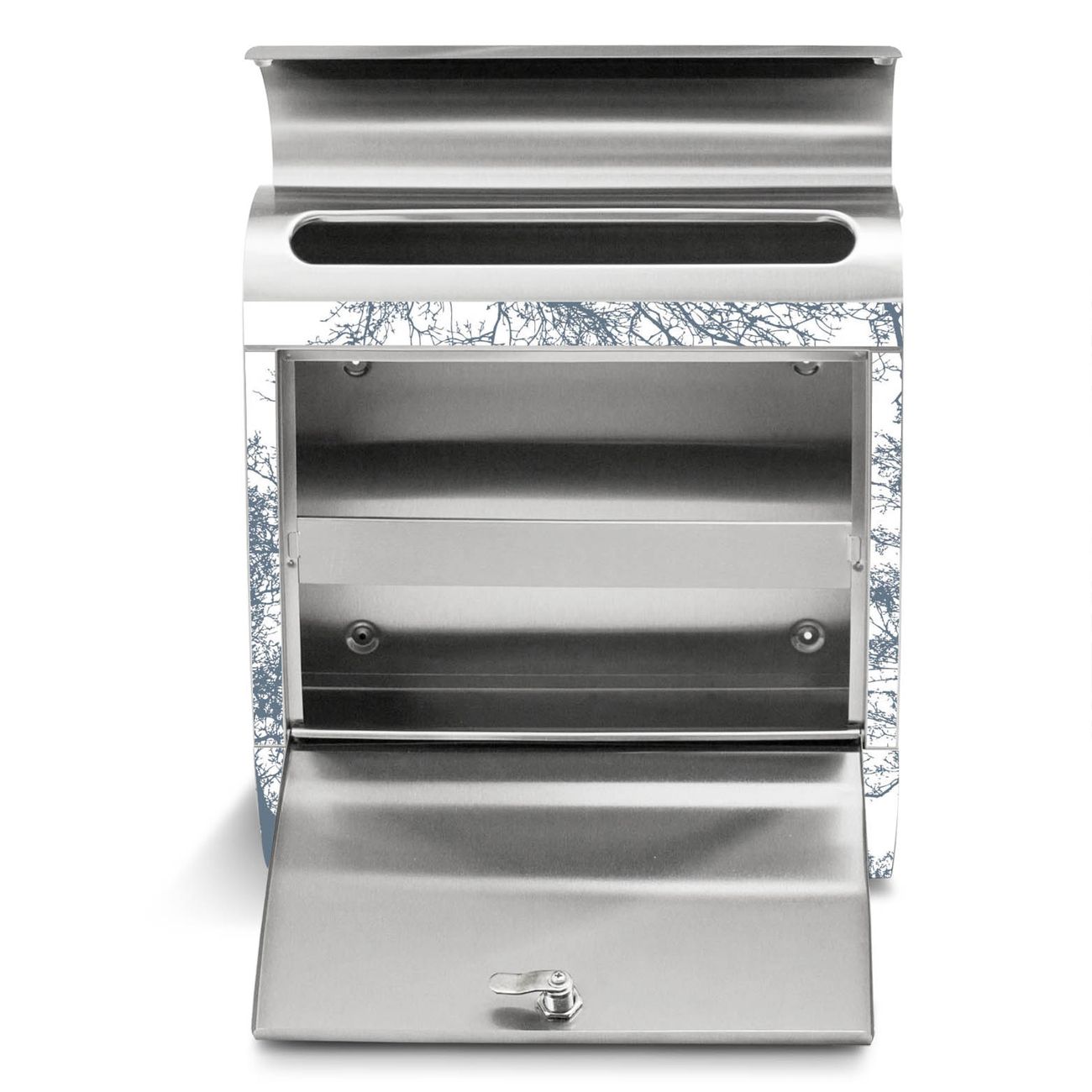 Der banjado Edelstahl Standbriefkasten mit Motiv Zwischen Bäumen 7 und eigenem Wunschtext bietet Ihnen mit seinem Fassungsvermögen genügend Platz auch für große A4 Sendungen. Das integrierte Zeitungsfach eignet sich hervorragend, um unkompliziert die Tageszeitung zu fassen.