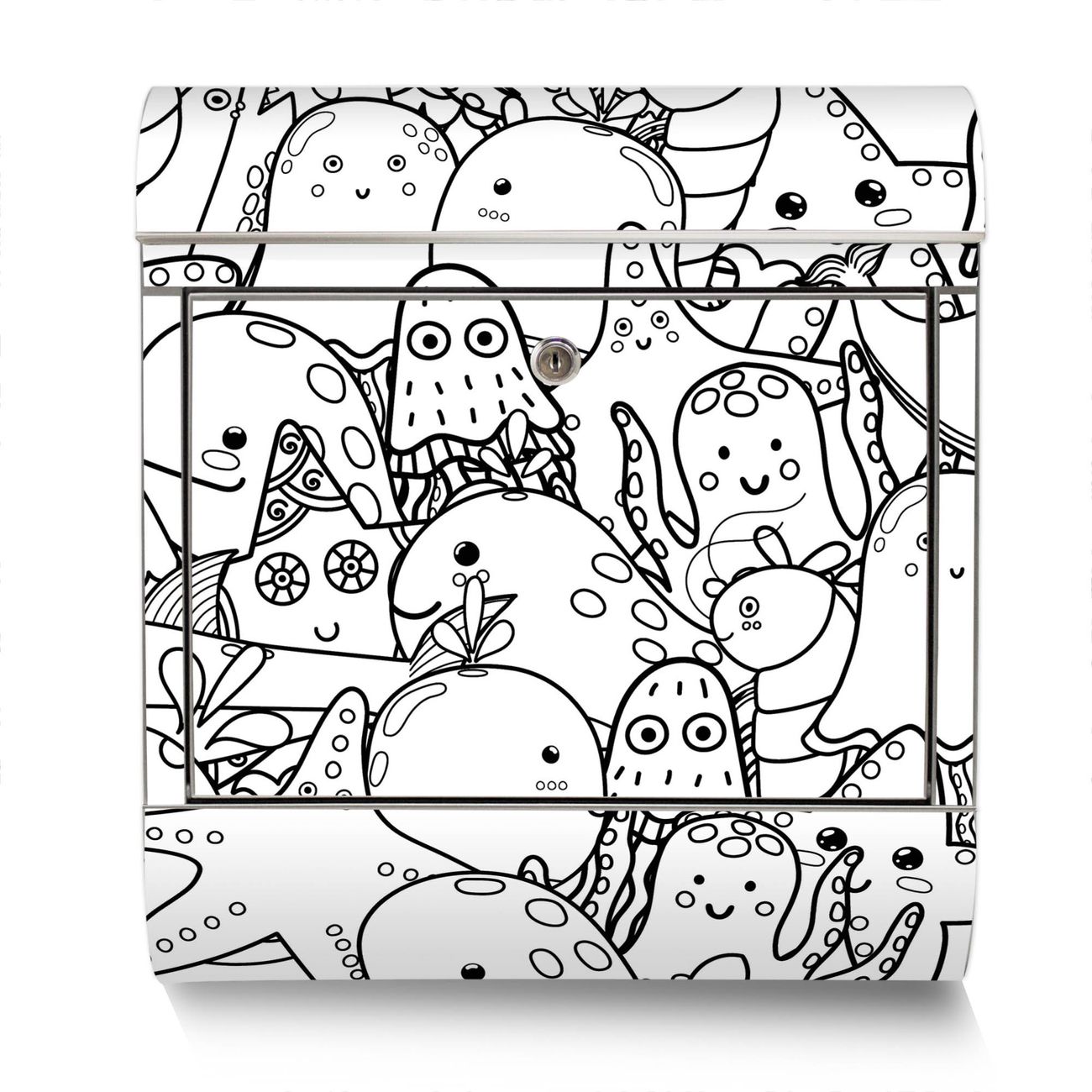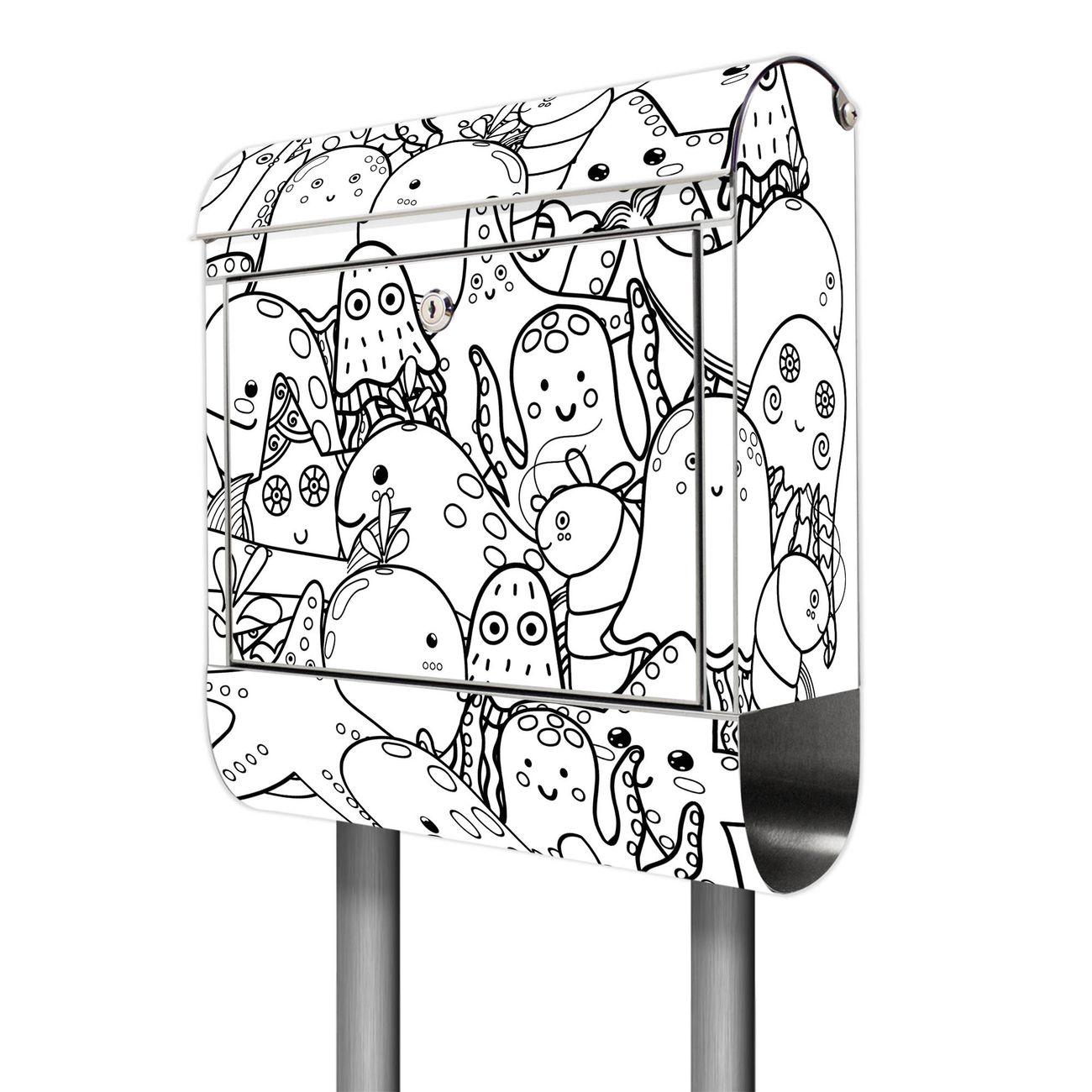 Der Motivstandbriefkasten hat ein sehr ansprechendes und ausgefallenes Design, damit entlocken Sie Ihren Nachbarn und dem Postboten ein Lächeln. Heben Sie Sich ab von der tristen grauen Masse, ohne auf Funktionalität zu verzichten. Der Briefkasten besteht aus hochwertigem 18/0 Edelstahl und die Wetter- und UV-resistenten Folie mit Motiv Wassermonsterchen 2 Motiv ist zusätzlich mit einem Schutzlaminat überzogen. Der Standbriefkasten wird mit Montagematerial und zwei Schlüsseln geliefert.