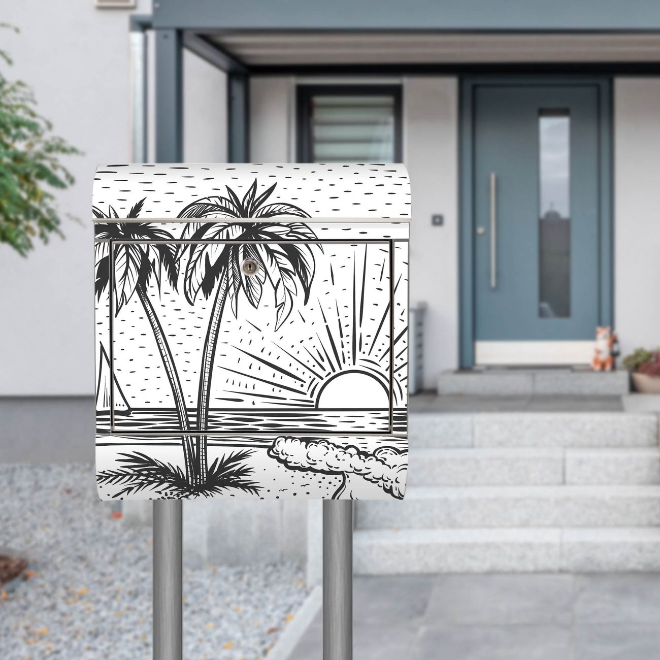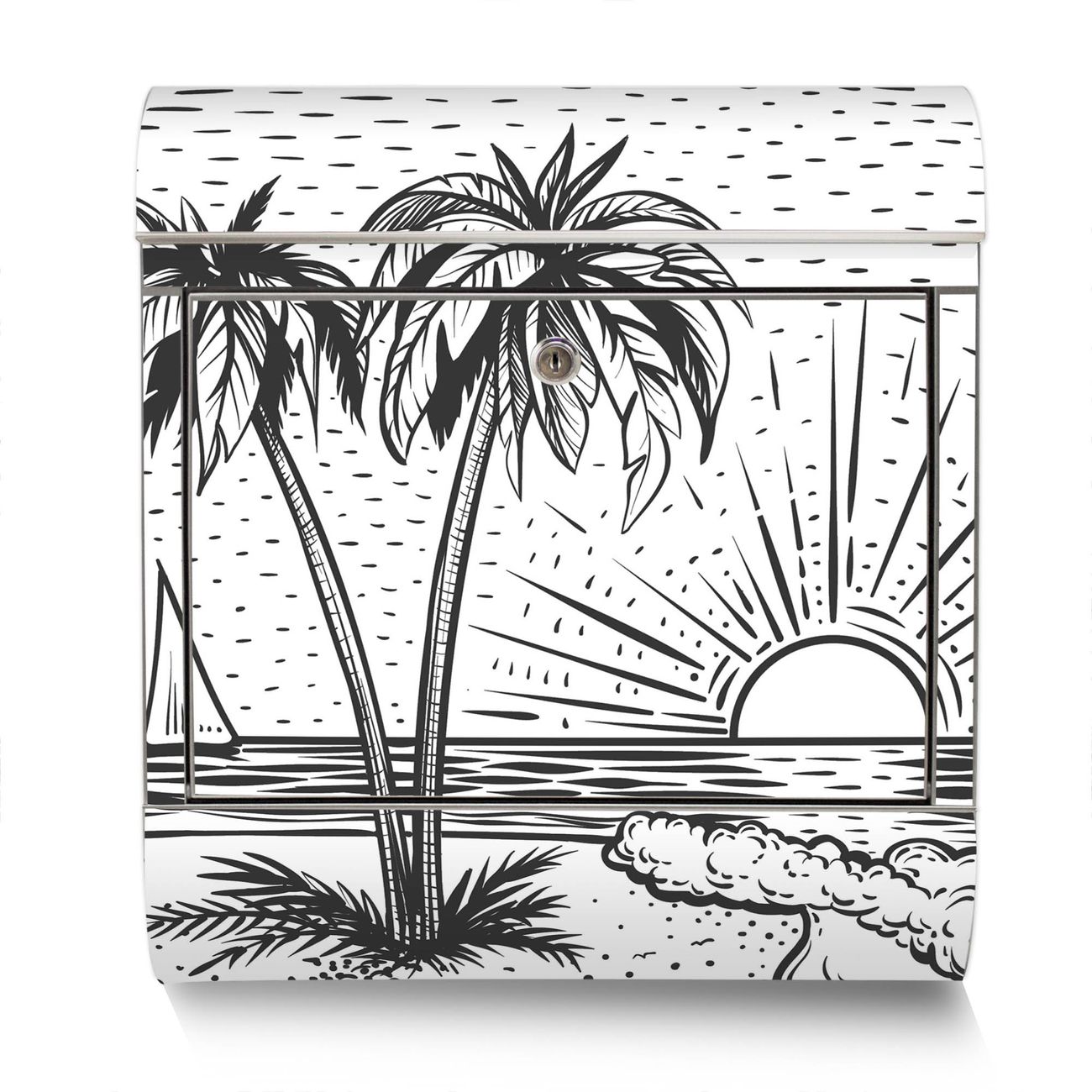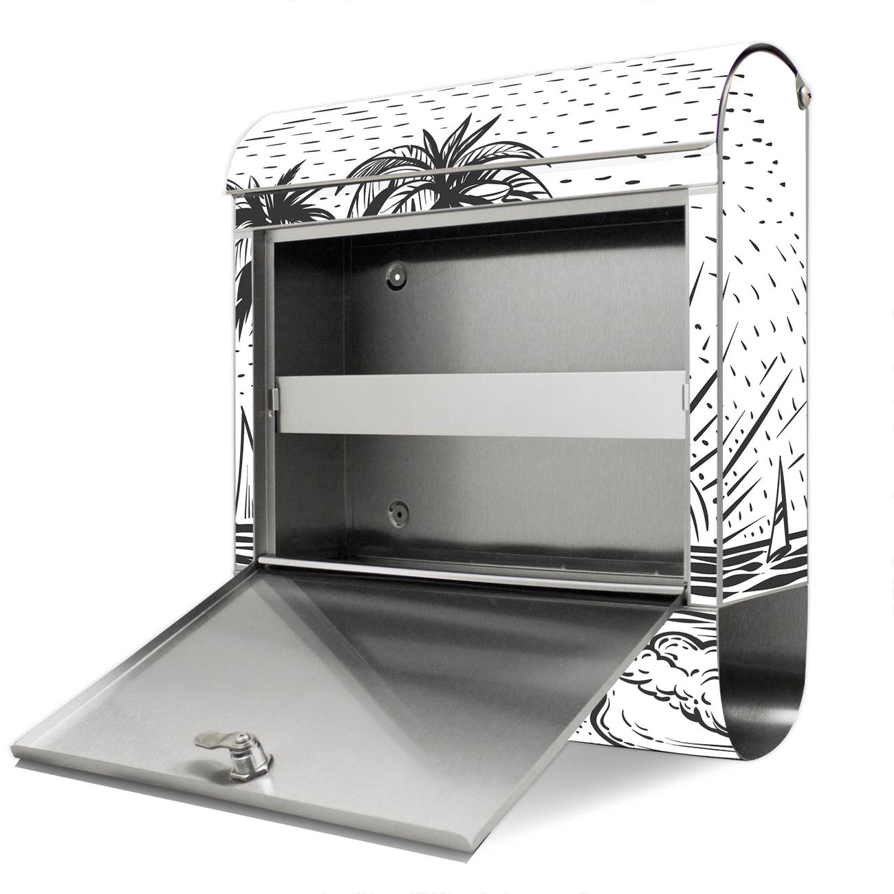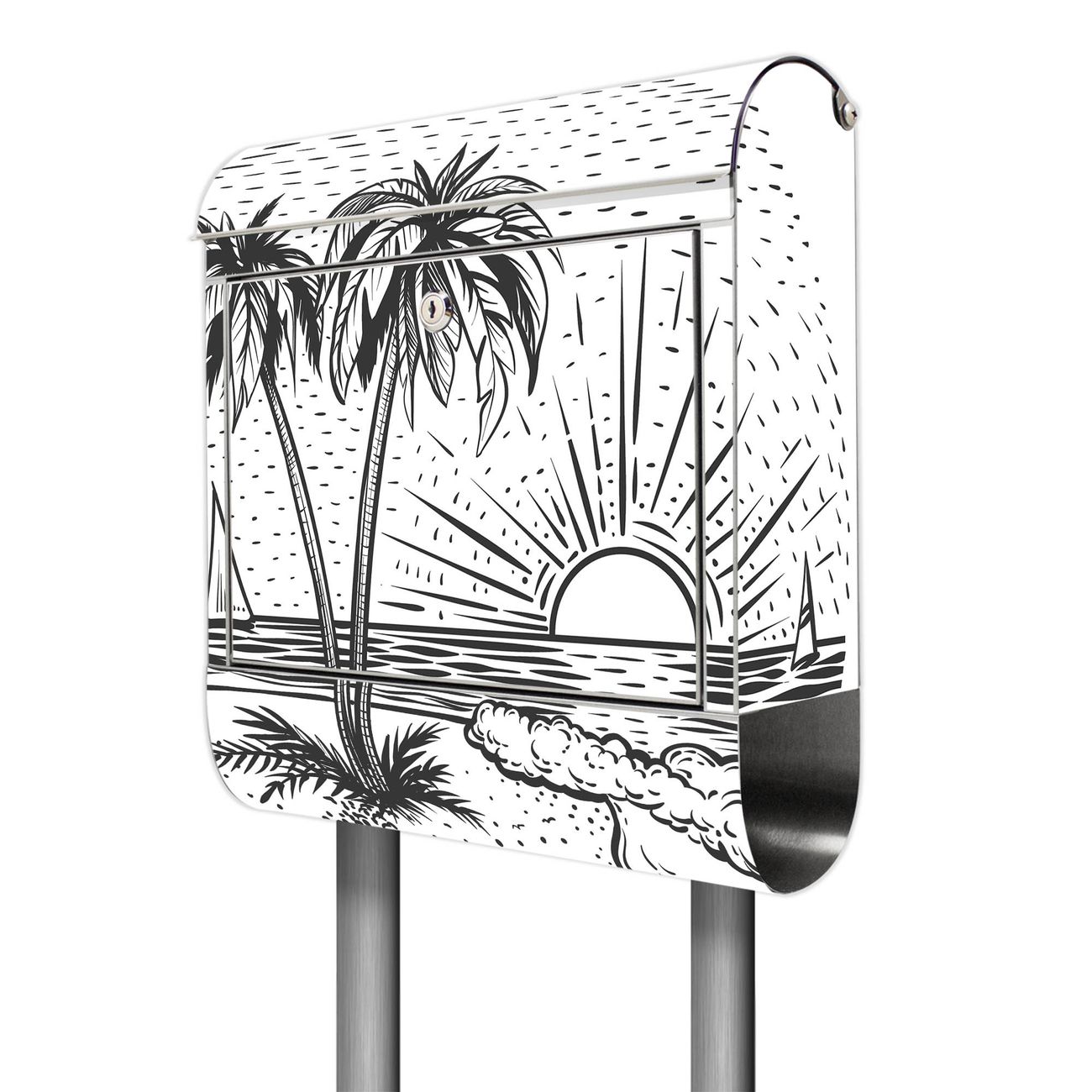 Der Motivstandbriefkasten hat ein sehr ansprechendes und ausgefallenes Design, damit entlocken Sie Ihren Nachbarn und dem Postboten ein Lächeln. Heben Sie Sich ab von der tristen grauen Masse, ohne auf Funktionalität zu verzichten. Der Briefkasten besteht aus hochwertigem 18/0 Edelstahl und die Wetter- und UV-resistenten Folie mit Motiv Palmenstrand 2 Motiv ist zusätzlich mit einem Schutzlaminat überzogen. Der Standbriefkasten wird mit Montagematerial und zwei Schlüsseln geliefert.