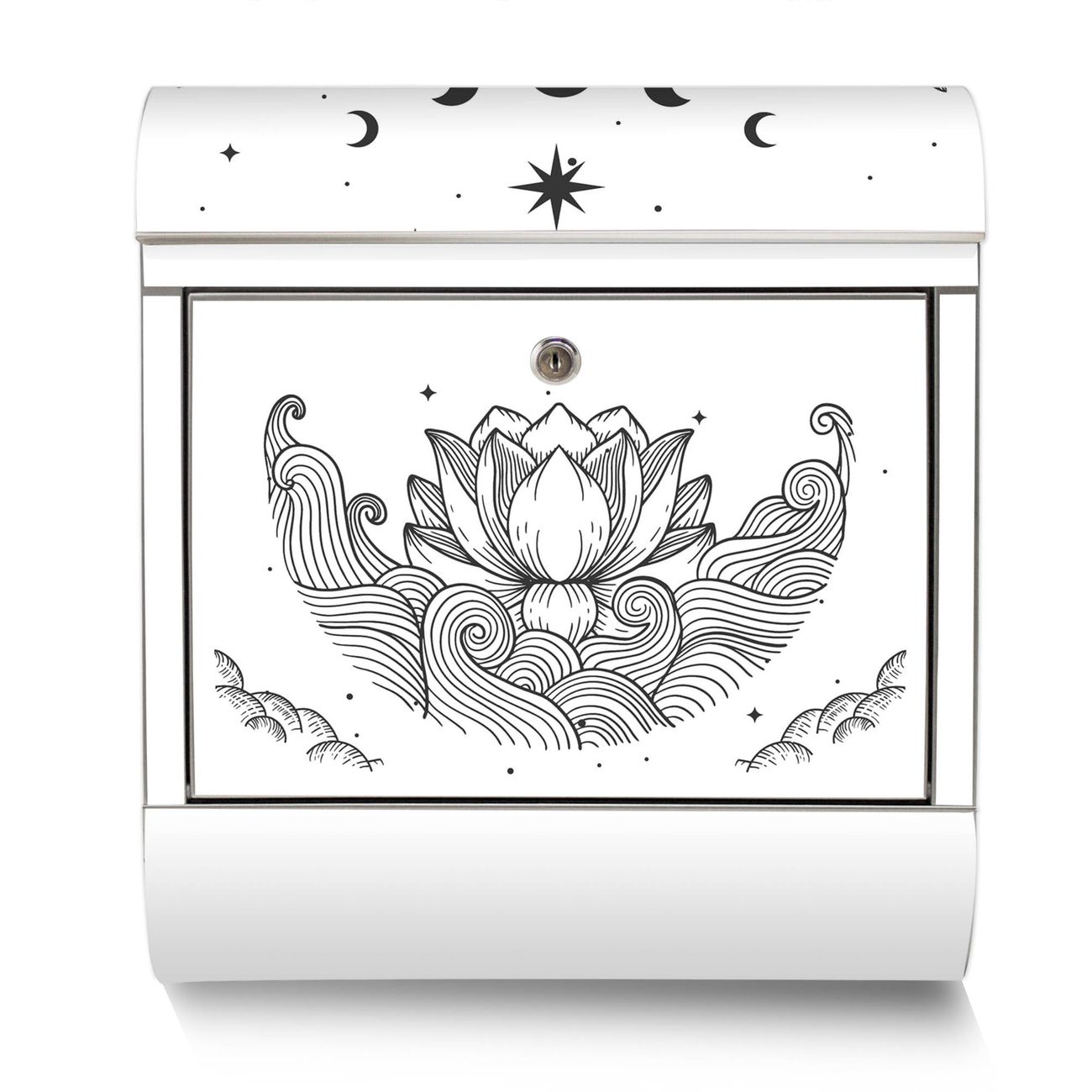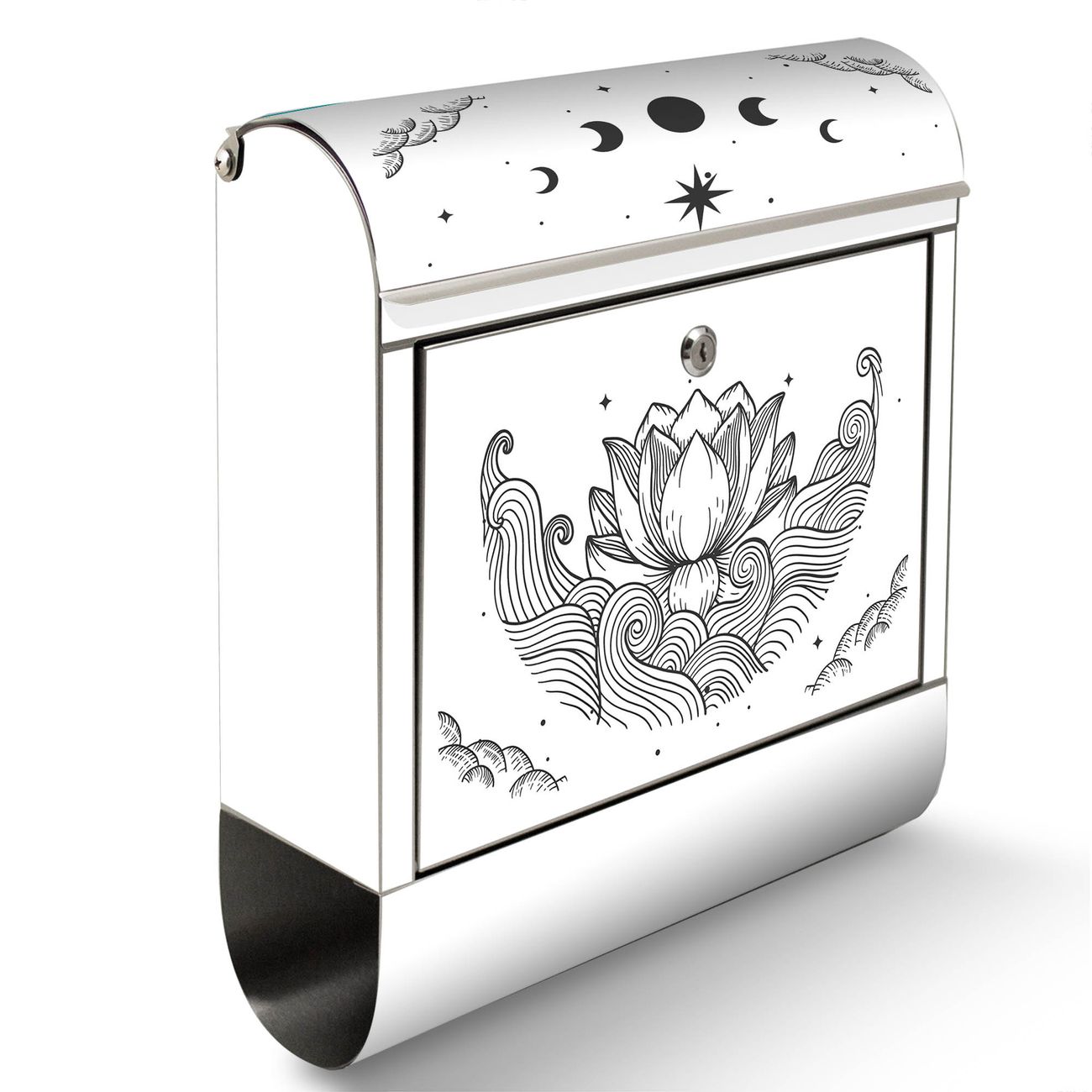 Der Motivstandbriefkasten hat ein sehr ansprechendes und ausgefallenes Design, damit entlocken Sie Ihren Nachbarn und dem Postboten ein Lächeln. Heben Sie Sich ab von der tristen grauen Masse, ohne auf Funktionalität zu verzichten. Der Briefkasten besteht aus hochwertigem 18/0 Edelstahl und die Wetter- und UV-resistenten Folie mit Motiv Lotus und Mondphasen 2 Motiv ist zusätzlich mit einem Schutzlaminat überzogen. Der Standbriefkasten wird mit Montagematerial und zwei Schlüsseln geliefert.