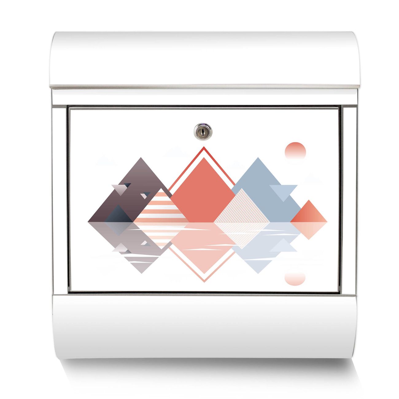 Der Motivstandbriefkasten hat ein sehr ansprechendes und ausgefallenes Design, damit entlocken Sie Ihren Nachbarn und dem Postboten ein Lächeln. Heben Sie Sich ab von der tristen grauen Masse, ohne auf Funktionalität zu verzichten. Der Briefkasten besteht aus hochwertigem 18/0 Edelstahl und die Wetter- und UV-resistenten Folie mit Motiv Spiegelnde Geometrie Motiv ist zusätzlich mit einem Schutzlaminat überzogen. Der Standbriefkasten wird mit Montagematerial und zwei Schlüsseln geliefert.