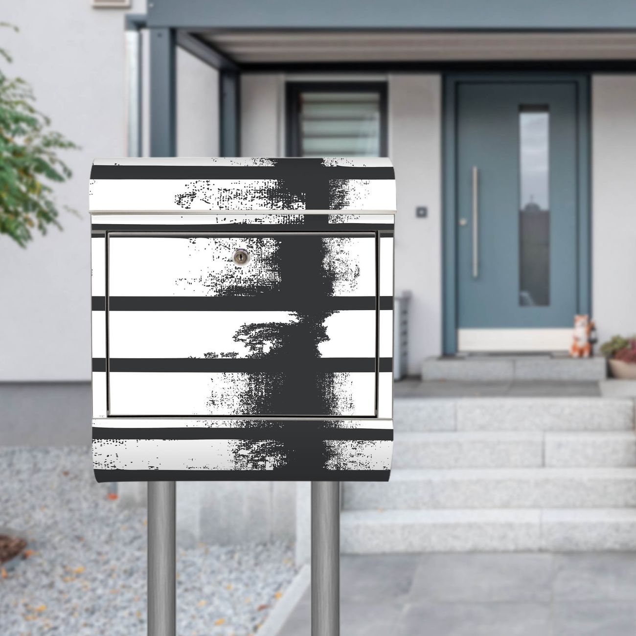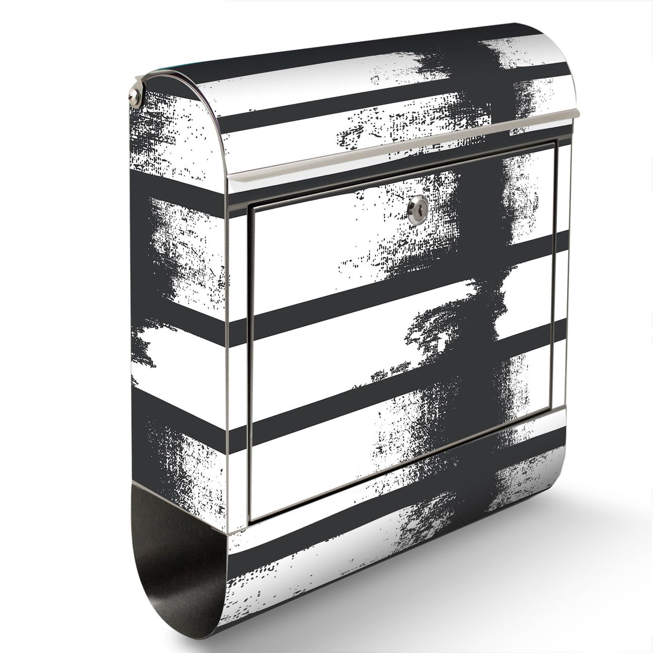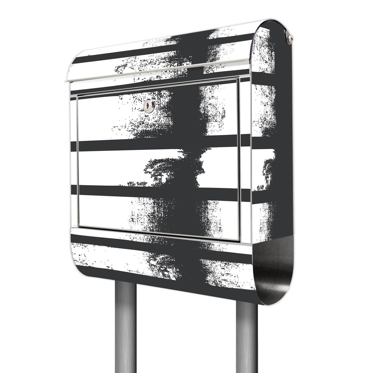Der Motivstandbriefkasten hat ein sehr ansprechendes und ausgefallenes Design, damit entlocken Sie Ihren Nachbarn und dem Postboten ein Lächeln. Heben Sie Sich ab von der tristen grauen Masse, ohne auf Funktionalität zu verzichten. Der Briefkasten besteht aus hochwertigem 18/0 Edelstahl und die Wetter- und UV-resistenten Folie mit Motiv Grunge Streifen Motiv ist zusätzlich mit einem Schutzlaminat überzogen. Der Standbriefkasten wird mit Montagematerial und zwei Schlüsseln geliefert.