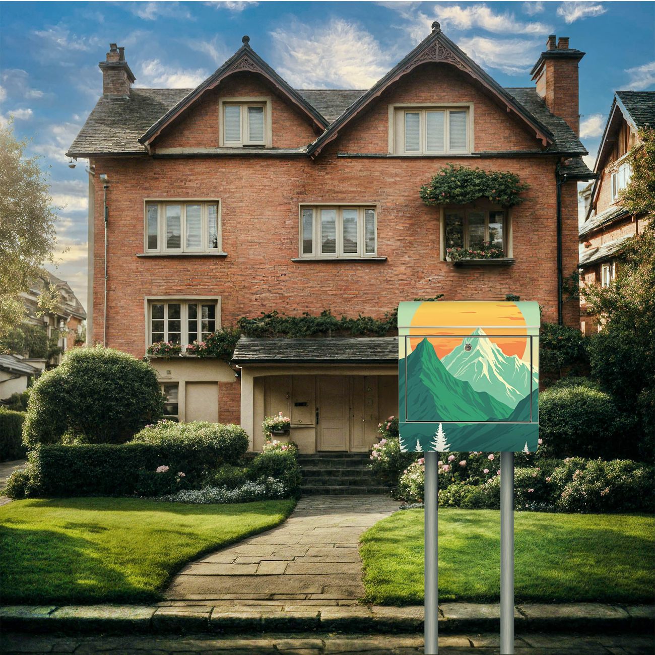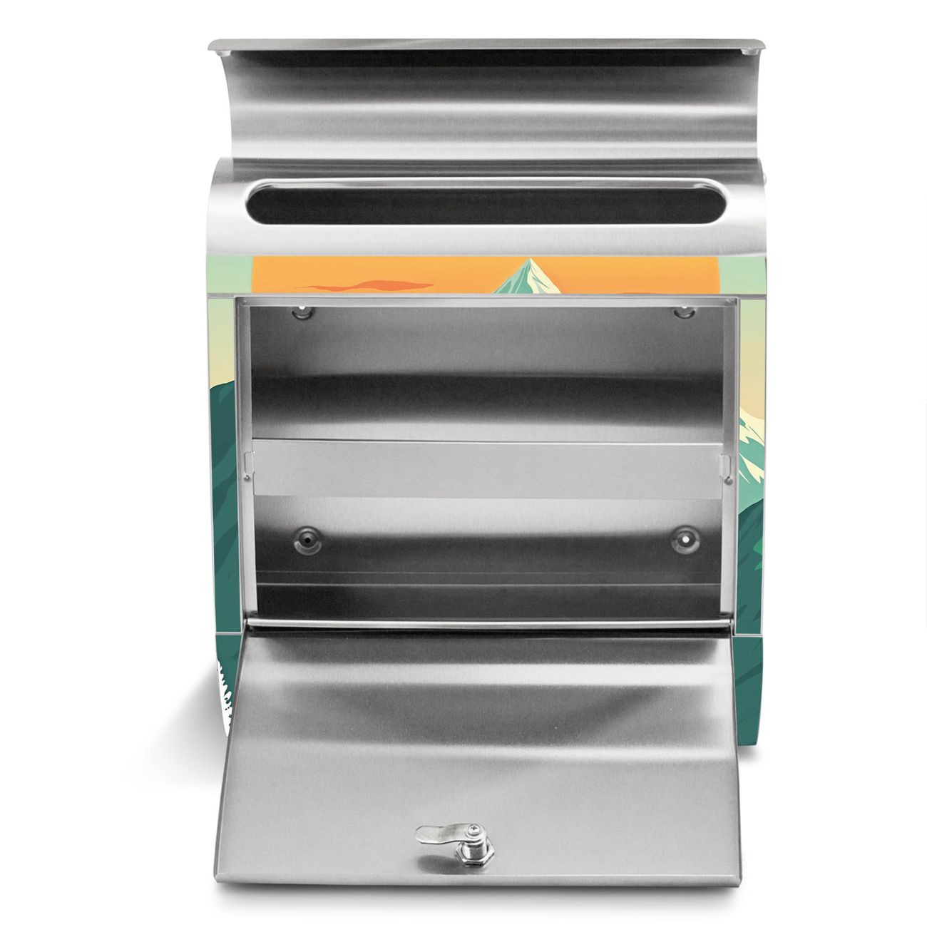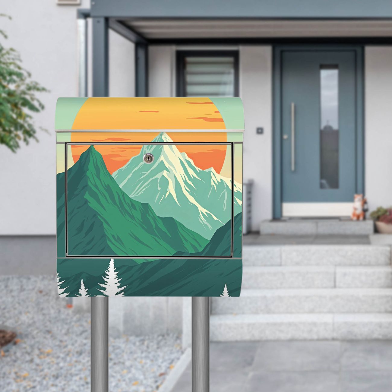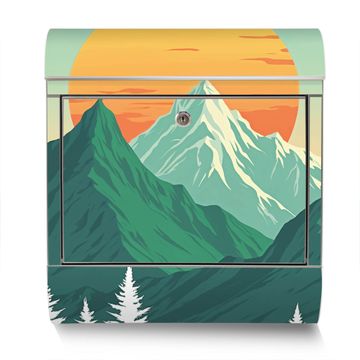 Der Motivstandbriefkasten hat ein sehr ansprechendes und ausgefallenes Design, damit entlocken Sie Ihren Nachbarn und dem Postboten ein Lächeln. Heben Sie Sich ab von der tristen grauen Masse, ohne auf Funktionalität zu verzichten. Der Briefkasten besteht aus hochwertigem 18/0 Edelstahl und die Wetter- und UV-resistenten Folie mit Motiv Sonnenaufgang über den Bergen Motiv ist zusätzlich mit einem Schutzlaminat überzogen. Der Standbriefkasten wird mit Montagematerial und zwei Schlüsseln geliefert.