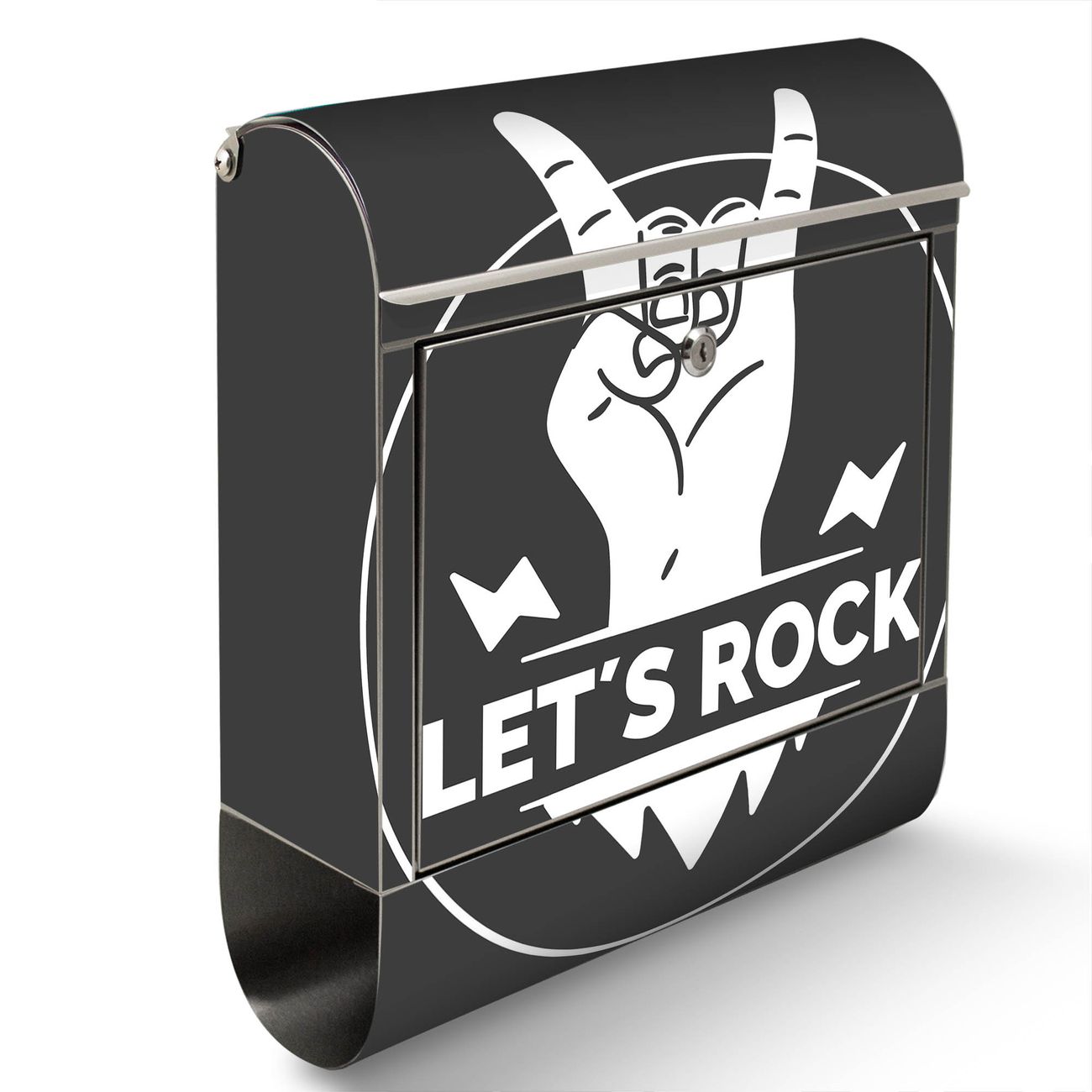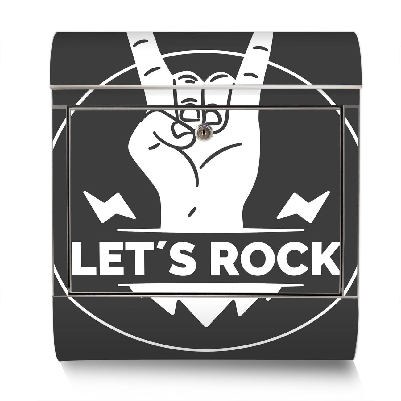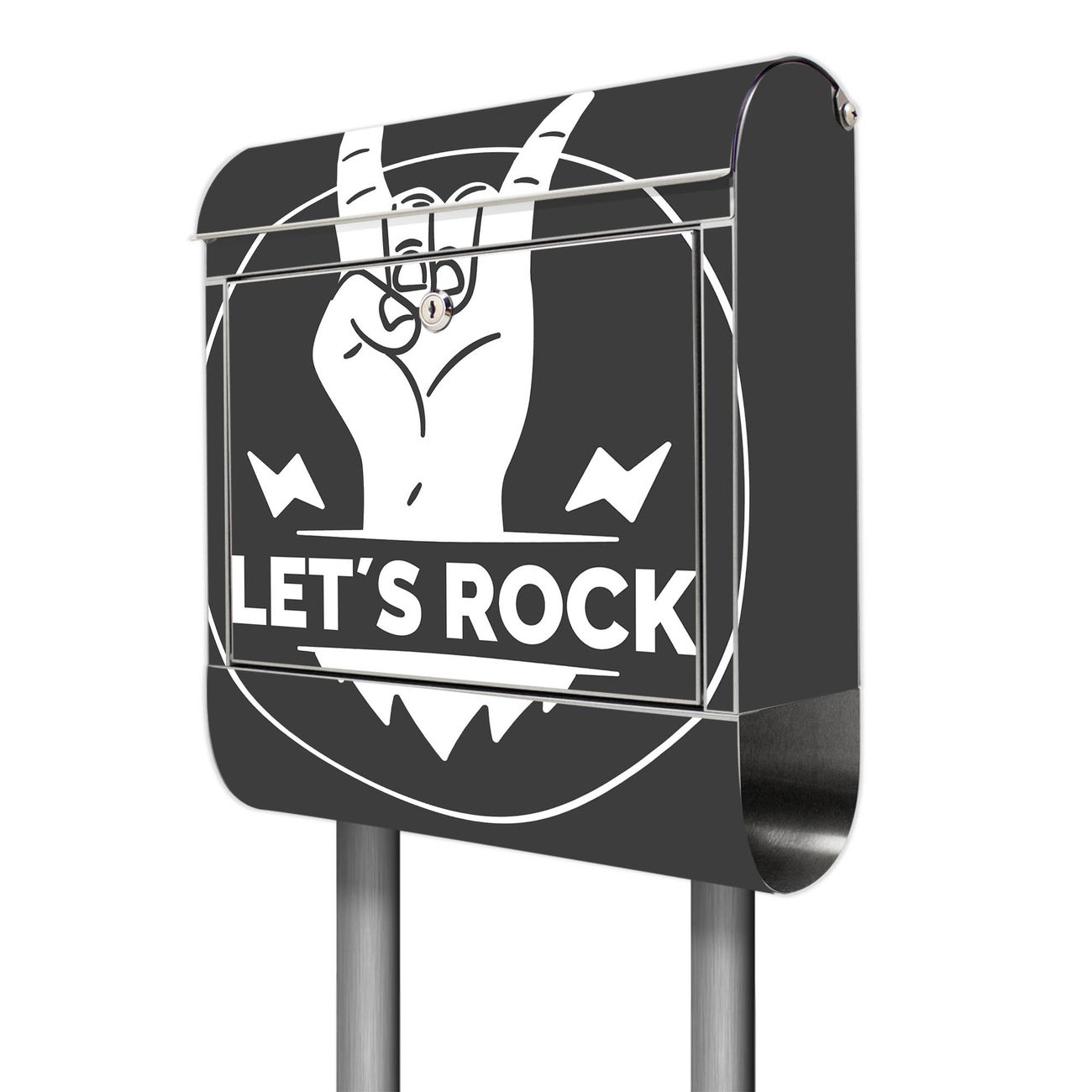 Der Motivstandbriefkasten hat ein sehr ansprechendes und ausgefallenes Design, damit entlocken Sie Ihren Nachbarn und dem Postboten ein Lächeln. Heben Sie Sich ab von der tristen grauen Masse, ohne auf Funktionalität zu verzichten. Der Briefkasten besteht aus hochwertigem 18/0 Edelstahl und die Wetter- und UV-resistenten Folie mit Motiv Let's Rock Motiv ist zusätzlich mit einem Schutzlaminat überzogen. Der Standbriefkasten wird mit Montagematerial und zwei Schlüsseln geliefert.