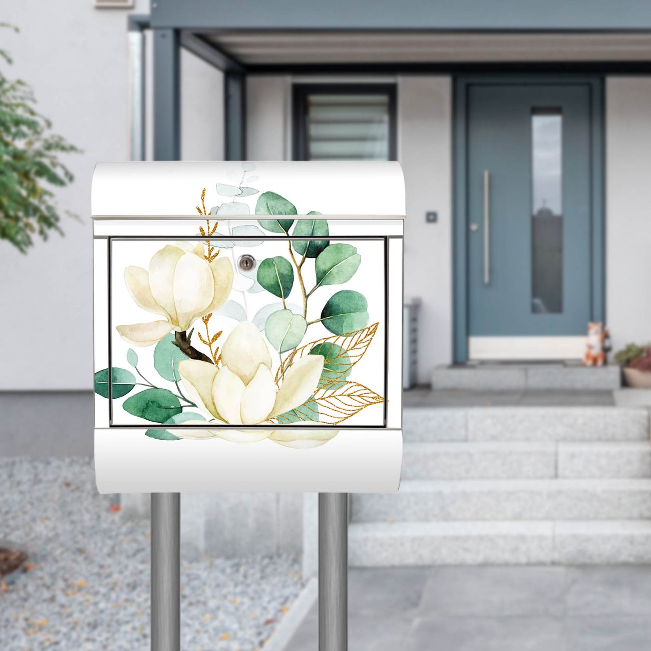 Der Motivstandbriefkasten hat ein sehr ansprechendes und ausgefallenes Design, damit entlocken Sie Ihren Nachbarn und dem Postboten ein Lächeln. Heben Sie Sich ab von der tristen grauen Masse, ohne auf Funktionalität zu verzichten. Der Briefkasten besteht aus hochwertigem 18/0 Edelstahl und die Wetter- und UV-resistenten Folie mit Motiv Magnolienkomposition Motiv ist zusätzlich mit einem Schutzlaminat überzogen. Der Standbriefkasten wird mit Montagematerial und zwei Schlüsseln geliefert.