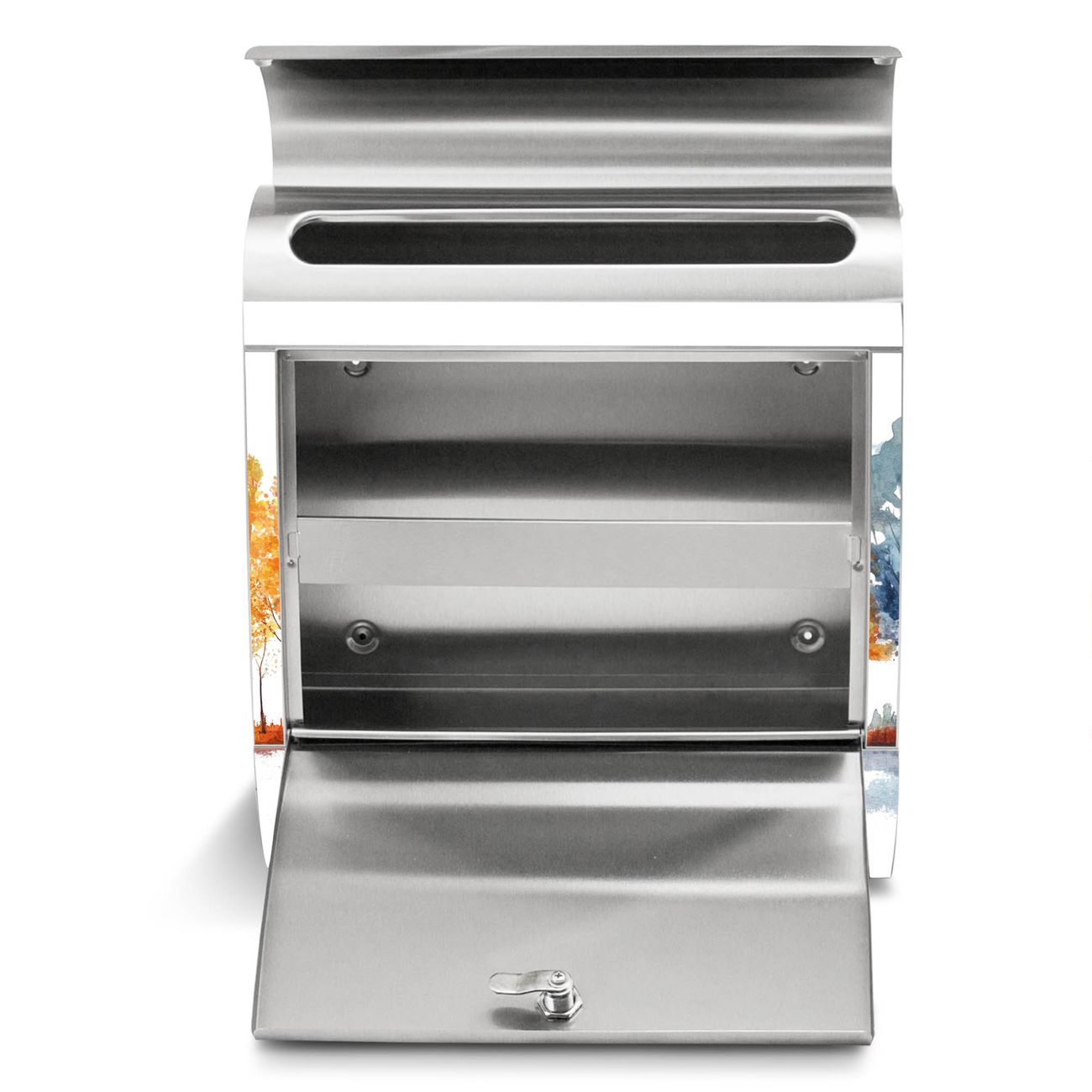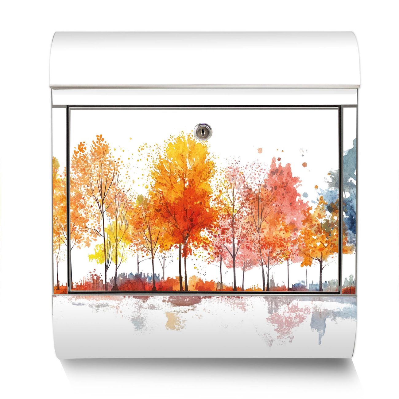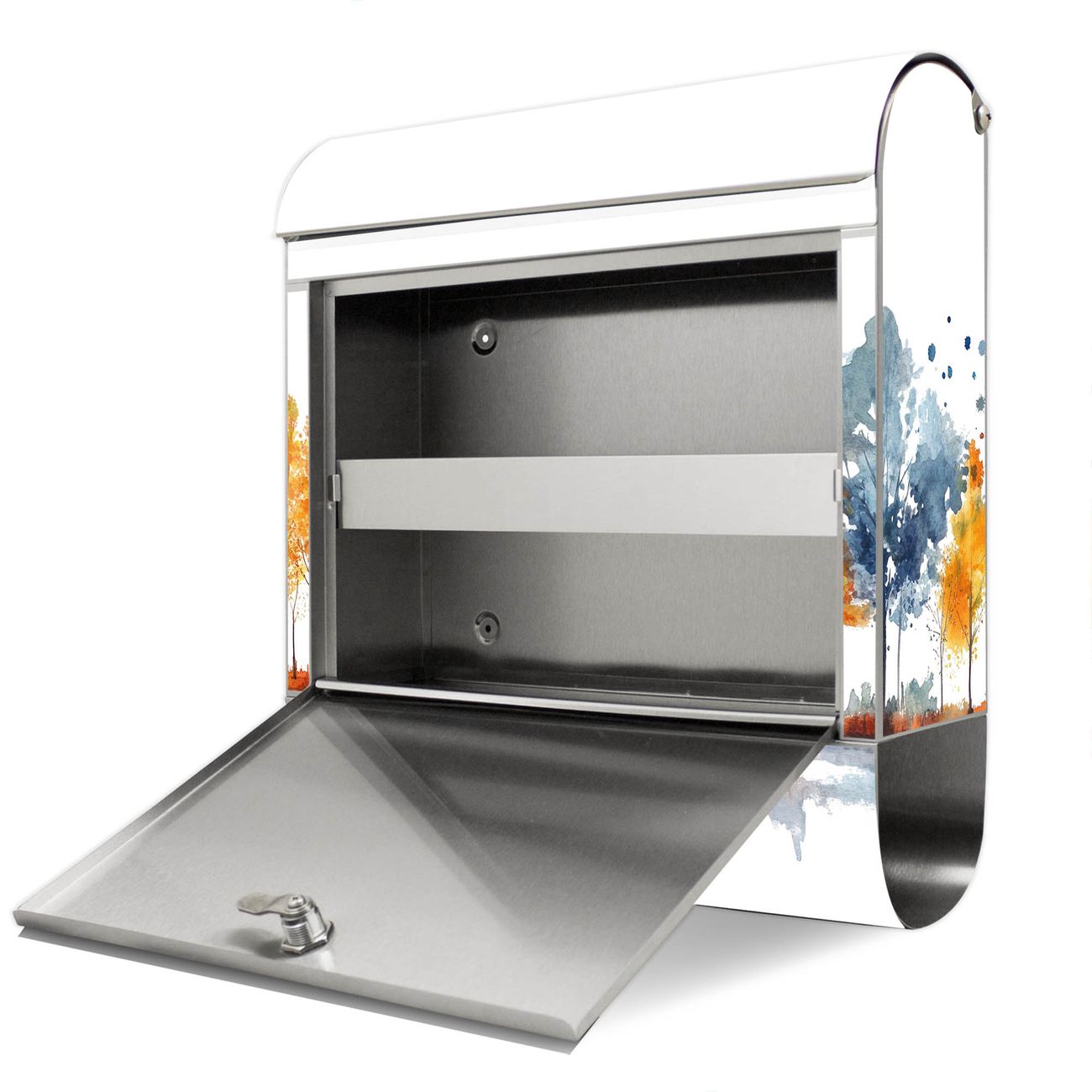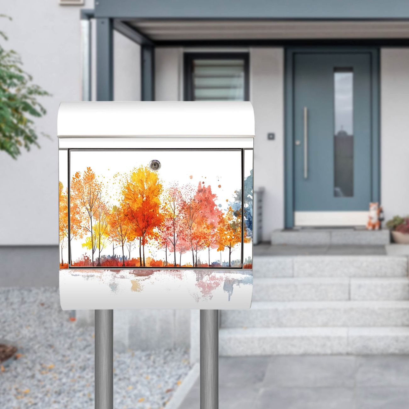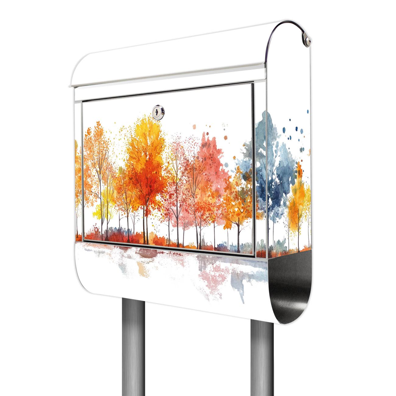 Der Motivstandbriefkasten hat ein sehr ansprechendes und ausgefallenes Design, damit entlocken Sie Ihren Nachbarn und dem Postboten ein Lächeln. Heben Sie Sich ab von der tristen grauen Masse, ohne auf Funktionalität zu verzichten. Der Briefkasten besteht aus hochwertigem 18/0 Edelstahl und die Wetter- und UV-resistenten Folie mit Motiv Herbstlicher Baumzauber Motiv ist zusätzlich mit einem Schutzlaminat überzogen. Der Standbriefkasten wird mit Montagematerial und zwei Schlüsseln geliefert.