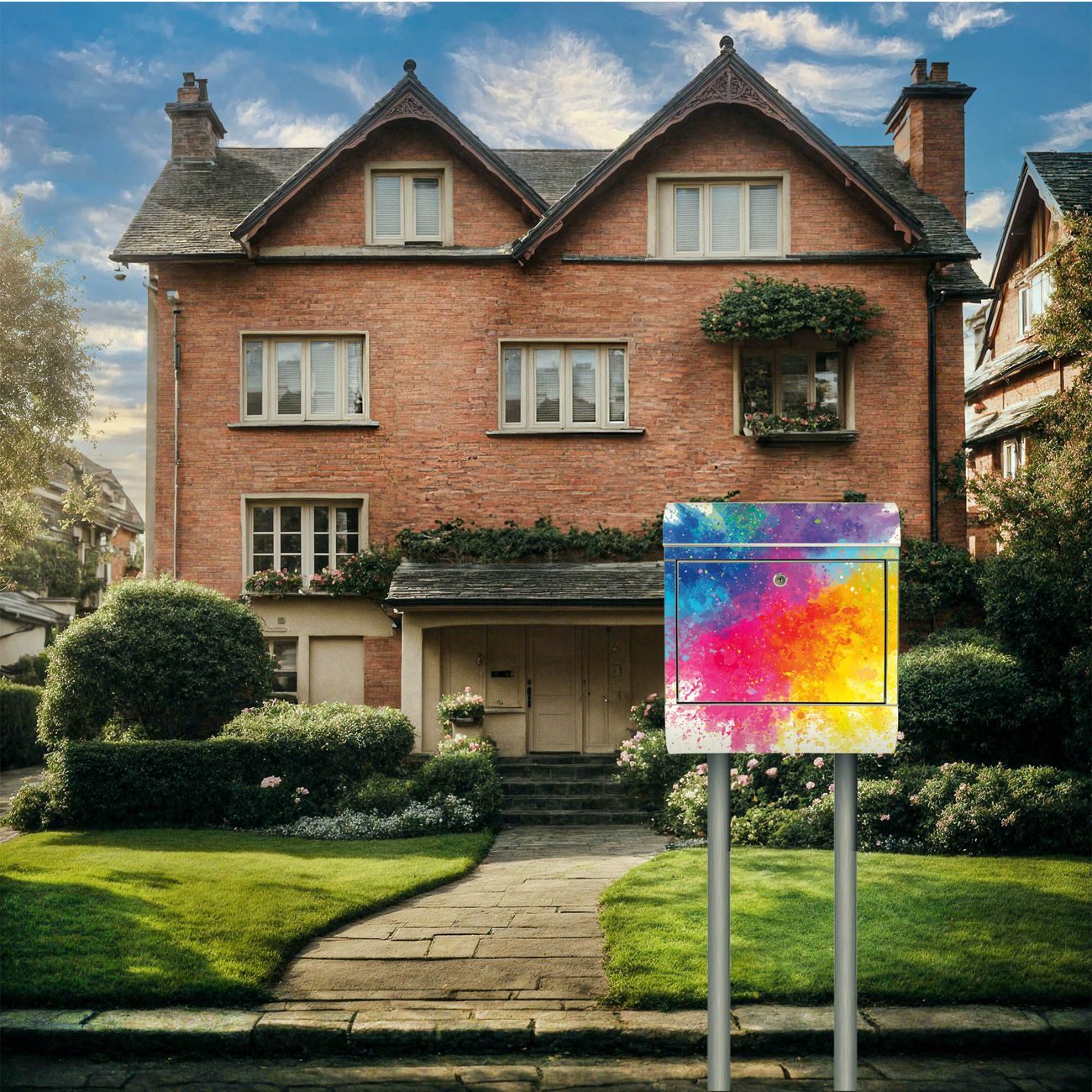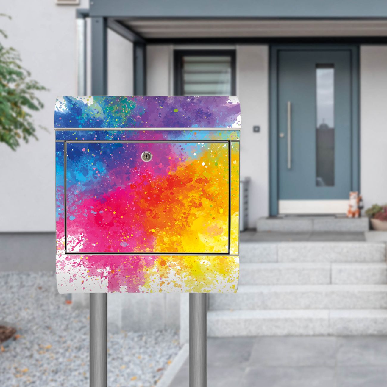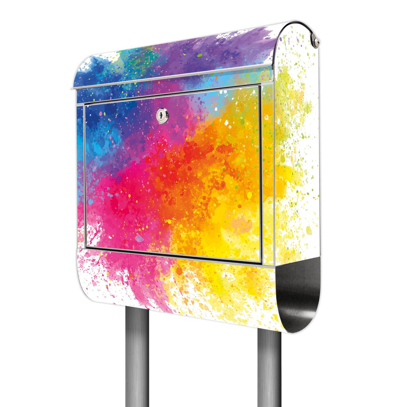 Der Motivstandbriefkasten hat ein sehr ansprechendes und ausgefallenes Design, damit entlocken Sie Ihren Nachbarn und dem Postboten ein Lächeln. Heben Sie Sich ab von der tristen grauen Masse, ohne auf Funktionalität zu verzichten. Der Briefkasten besteht aus hochwertigem 18/0 Edelstahl und die Wetter- und UV-resistenten Folie mit Motiv Farbexplosion 2 Motiv ist zusätzlich mit einem Schutzlaminat überzogen. Der Standbriefkasten wird mit Montagematerial und zwei Schlüsseln geliefert.