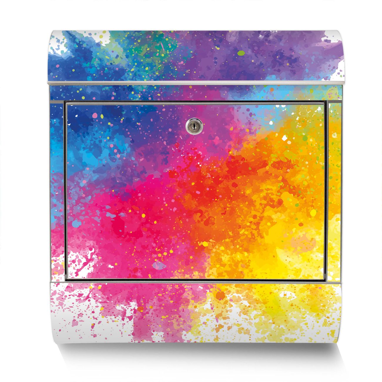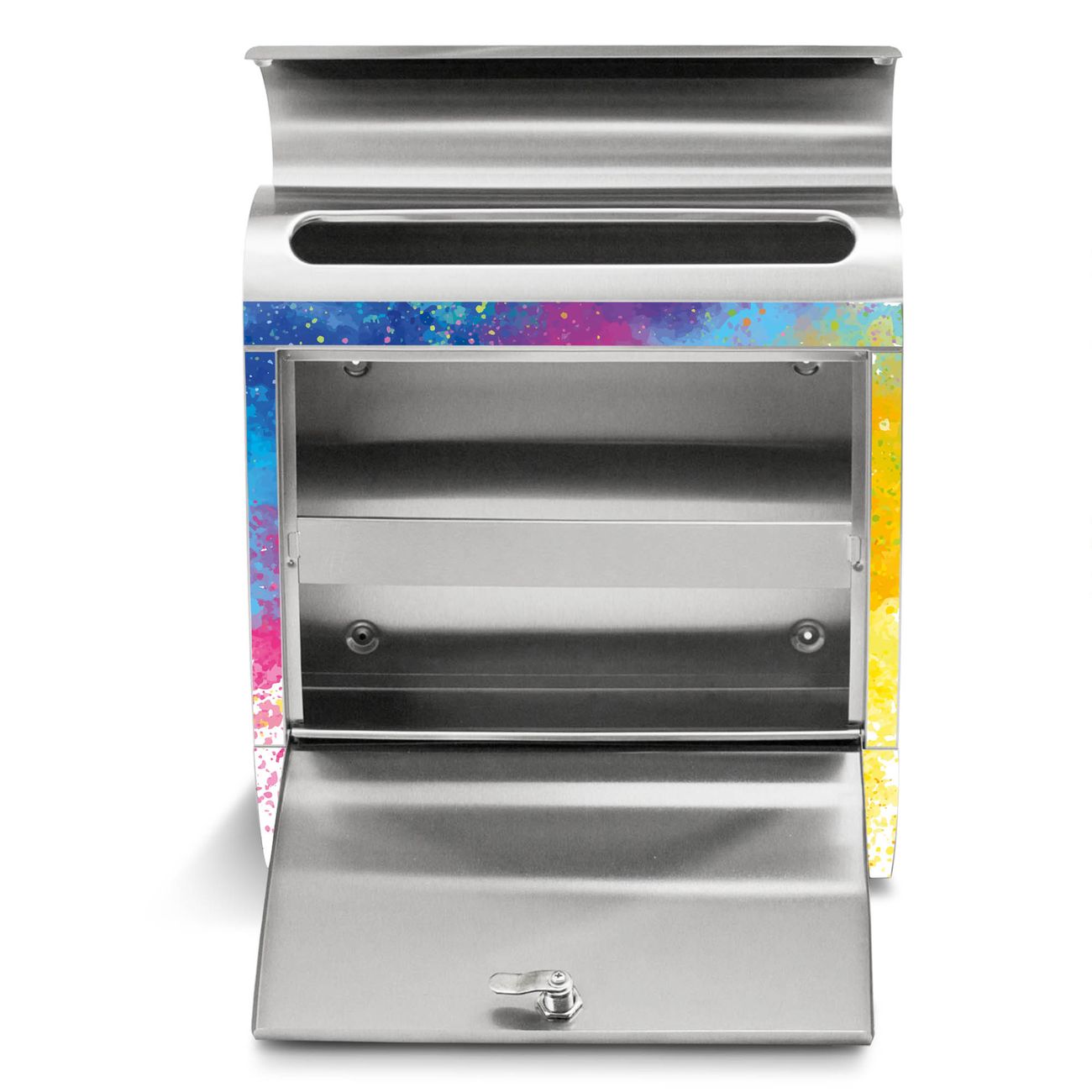 Der banjado Edelstahl Standbriefkasten mit Motiv Motiv Farbexplosion 2 bietet Ihnen mit seinem Fassungsvermögen genügend Platz auch für große A4 Sendungen. Das integrierte Zeitungsfach eignet sich hervorragend, um unkompliziert die Tageszeitung zu fassen.