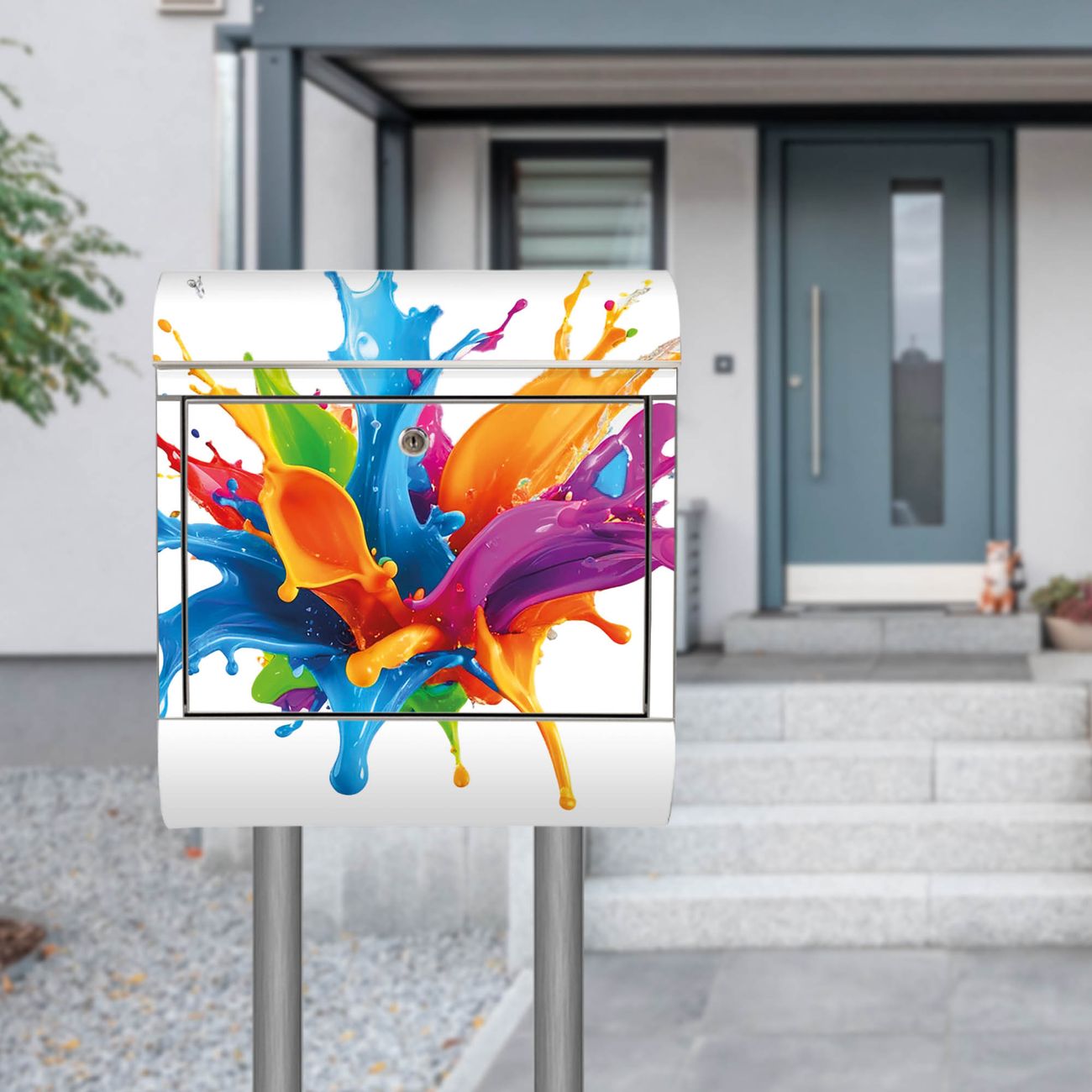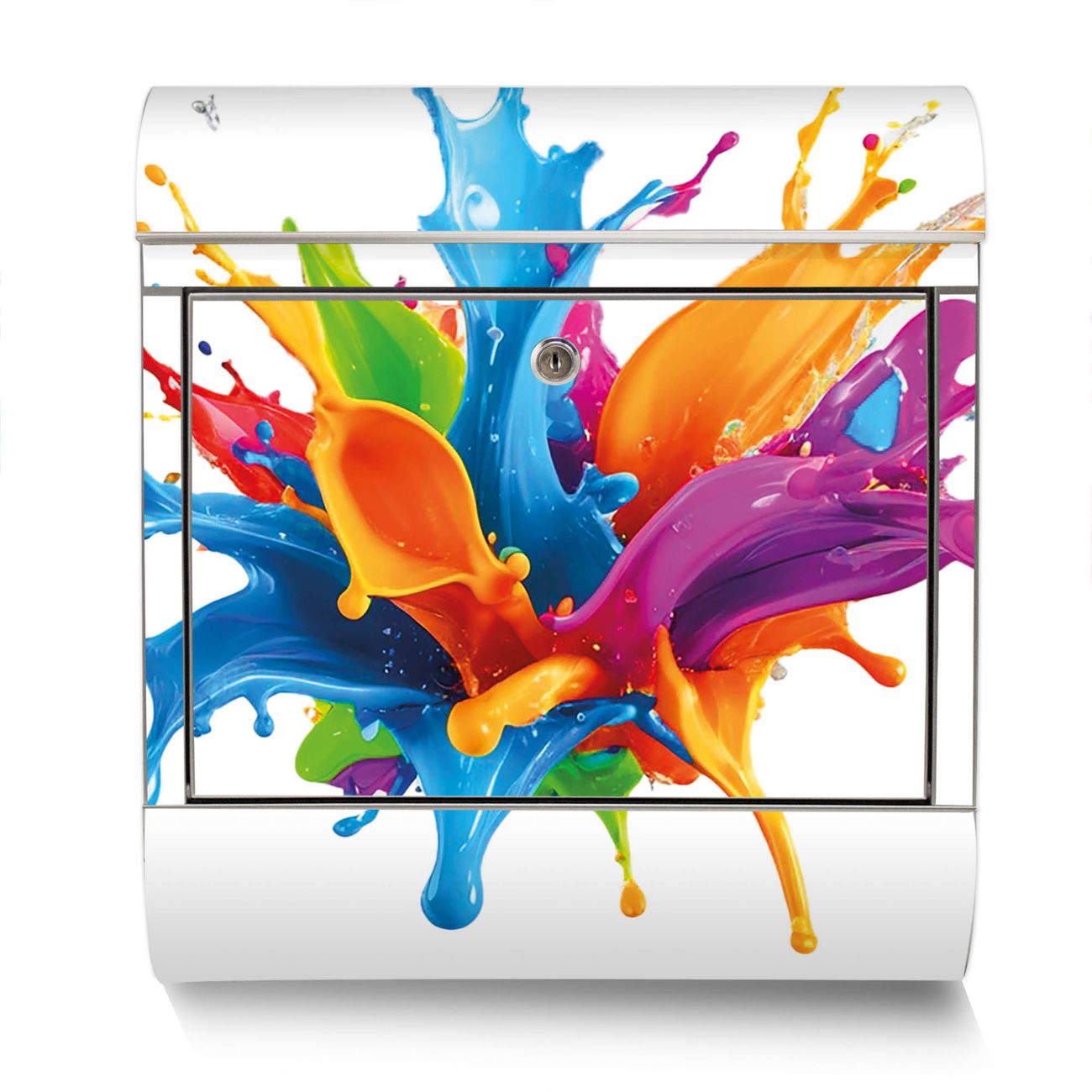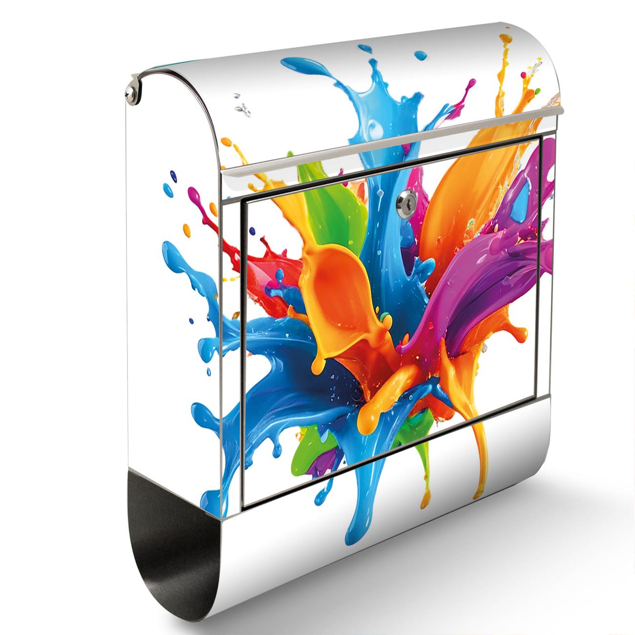 Der Motivstandbriefkasten hat ein sehr ansprechendes und ausgefallenes Design, damit entlocken Sie Ihren Nachbarn und dem Postboten ein Lächeln. Heben Sie Sich ab von der tristen grauen Masse, ohne auf Funktionalität zu verzichten. Der Briefkasten besteht aus hochwertigem 18/0 Edelstahl und die Wetter- und UV-resistenten Folie mit Motiv Farbspritzer-Explosion Motiv ist zusätzlich mit einem Schutzlaminat überzogen. Der Standbriefkasten wird mit Montagematerial und zwei Schlüsseln geliefert.