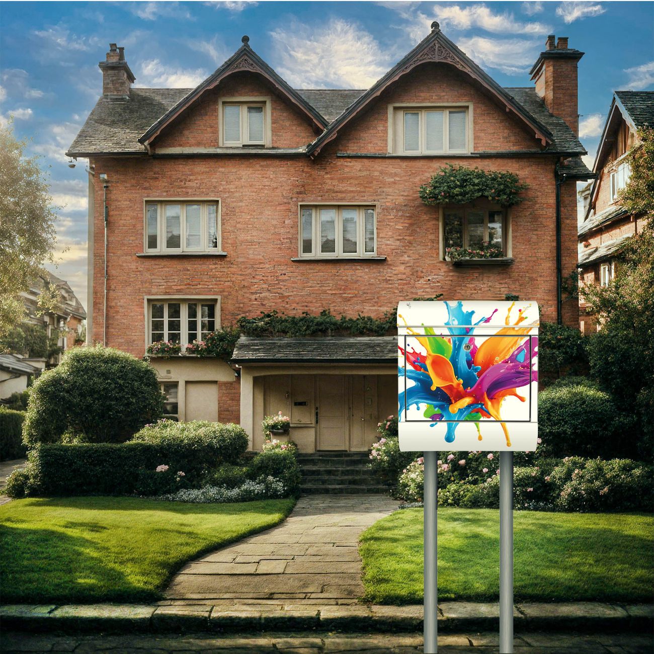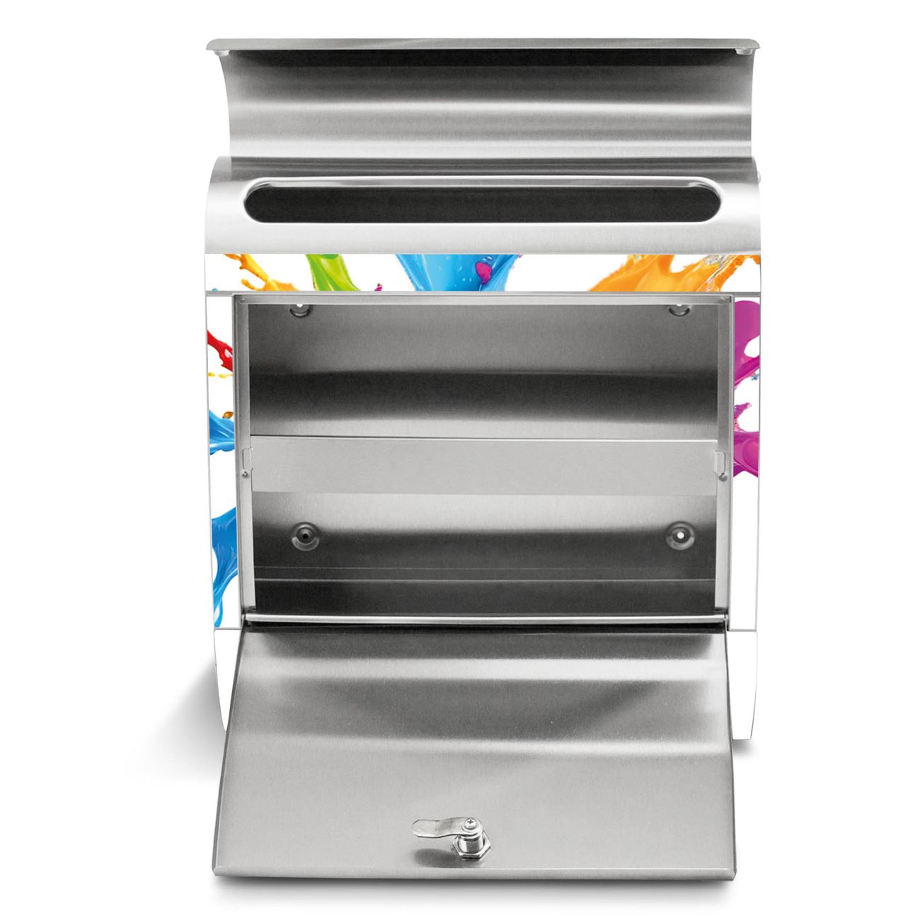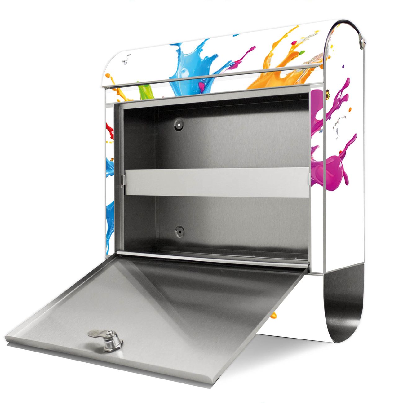 Der Motivstandbriefkasten hat ein sehr ansprechendes und ausgefallenes Design, damit entlocken Sie Ihren Nachbarn und dem Postboten ein Lächeln. Heben Sie Sich ab von der tristen grauen Masse, ohne auf Funktionalität zu verzichten. Der Briefkasten besteht aus hochwertigem 18/0 Edelstahl und die Wetter- und UV-resistenten Folie mit Motiv Farbspritzer-Explosion Motiv ist zusätzlich mit einem Schutzlaminat überzogen. Der Standbriefkasten wird mit Montagematerial und zwei Schlüsseln geliefert.