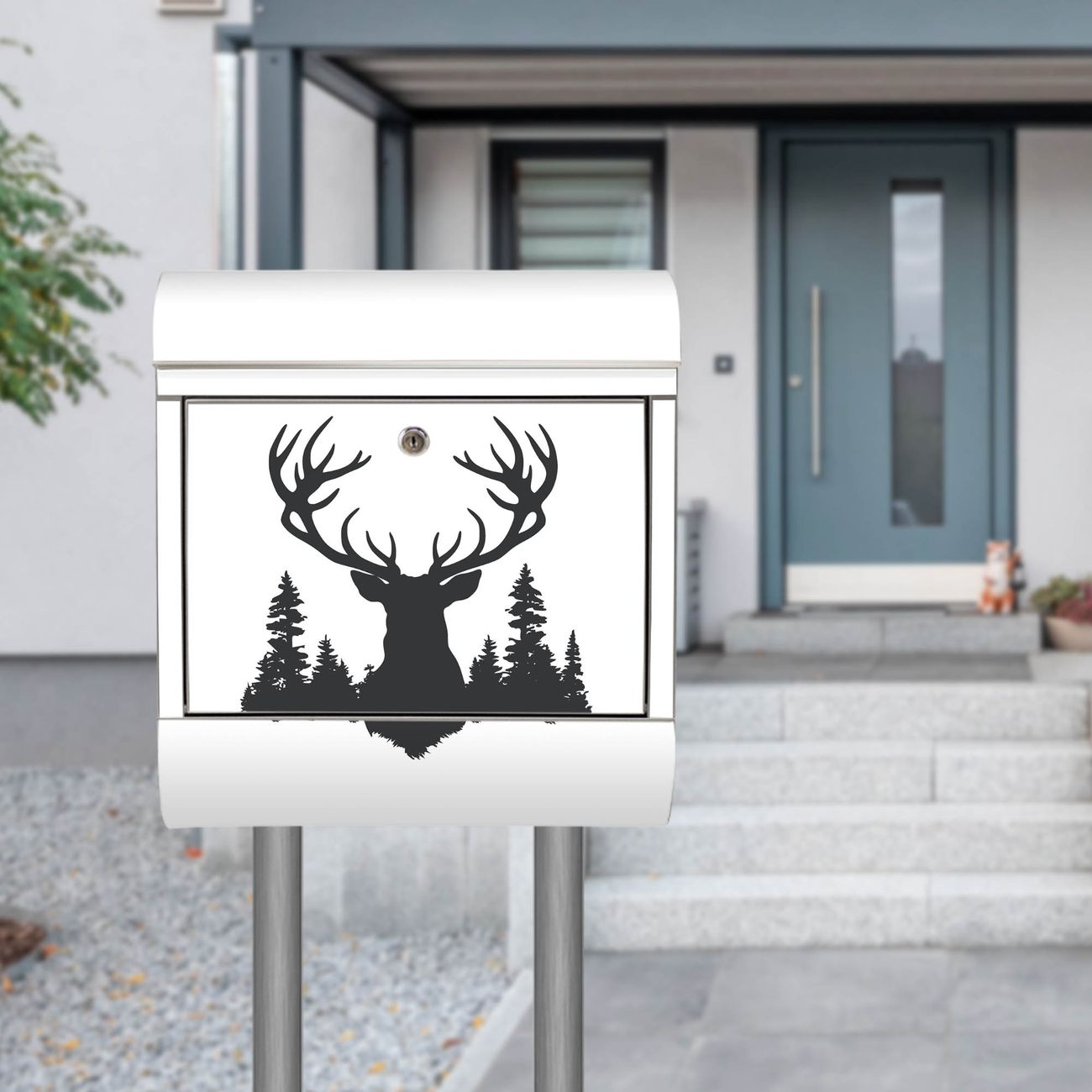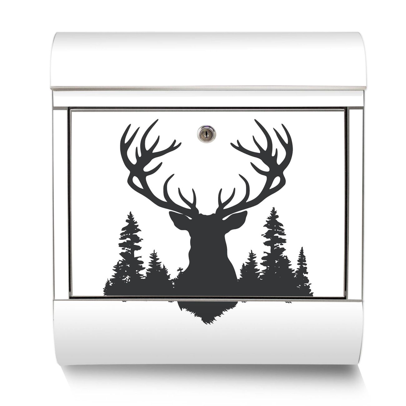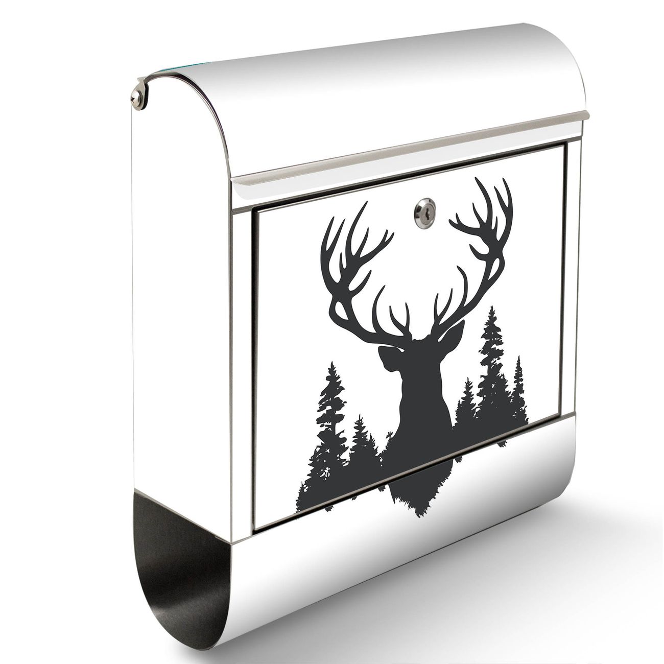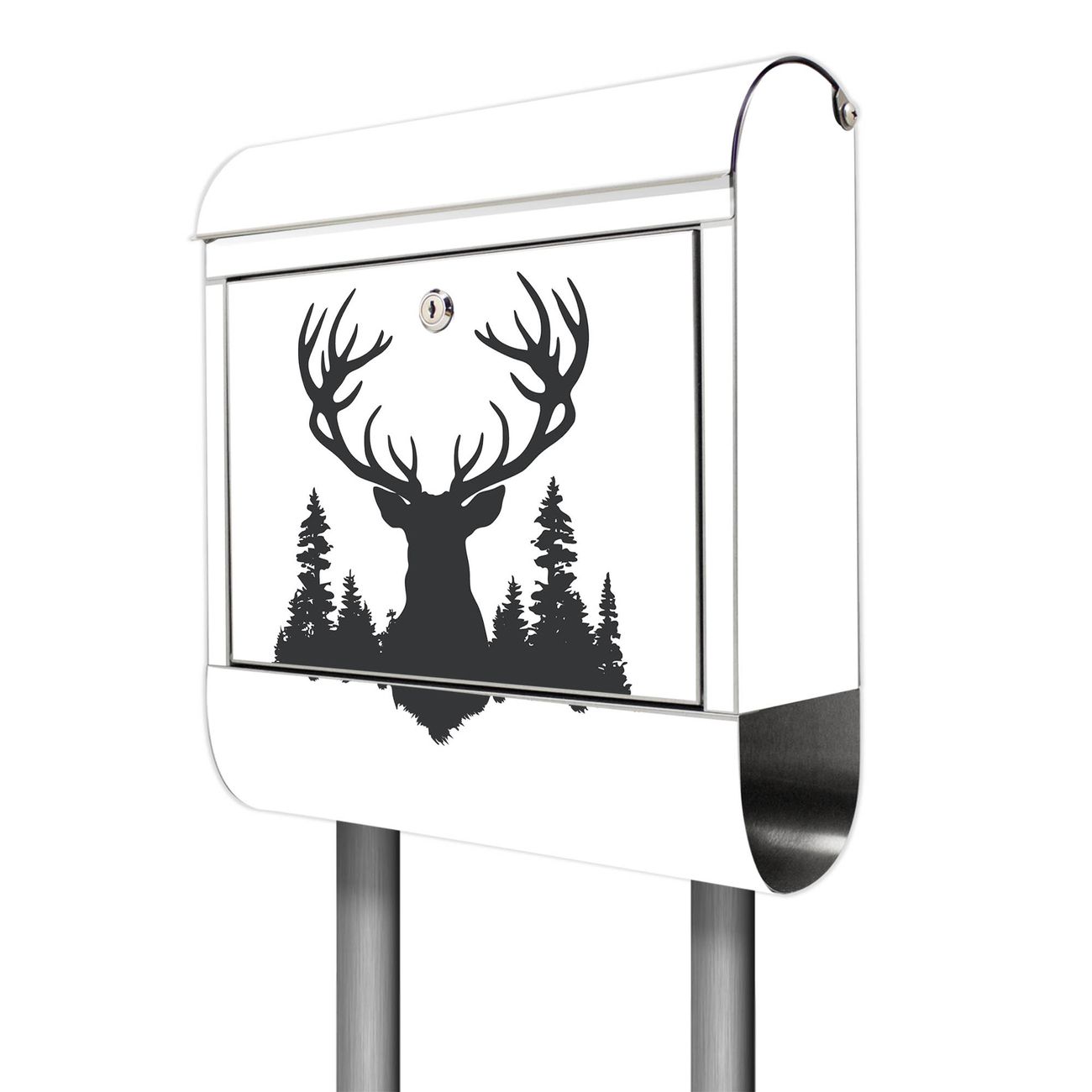 Der Motivstandbriefkasten hat ein sehr ansprechendes und ausgefallenes Design, damit entlocken Sie Ihren Nachbarn und dem Postboten ein Lächeln. Heben Sie Sich ab von der tristen grauen Masse, ohne auf Funktionalität zu verzichten. Der Briefkasten besteht aus hochwertigem 18/0 Edelstahl und die Wetter- und UV-resistenten Folie mit Motiv Hirsch im Wald Silhouette Motiv ist zusätzlich mit einem Schutzlaminat überzogen. Der Standbriefkasten wird mit Montagematerial und zwei Schlüsseln geliefert.
