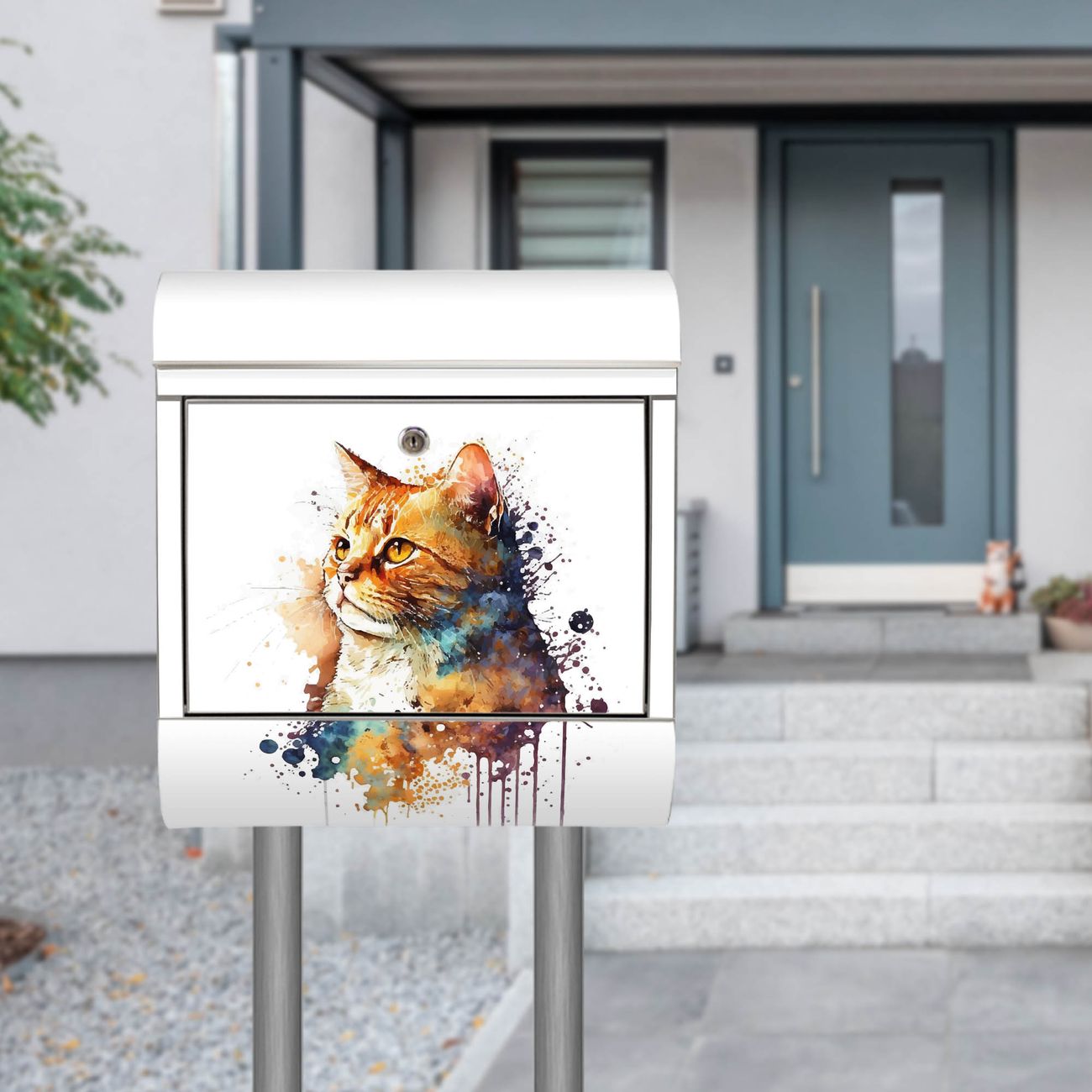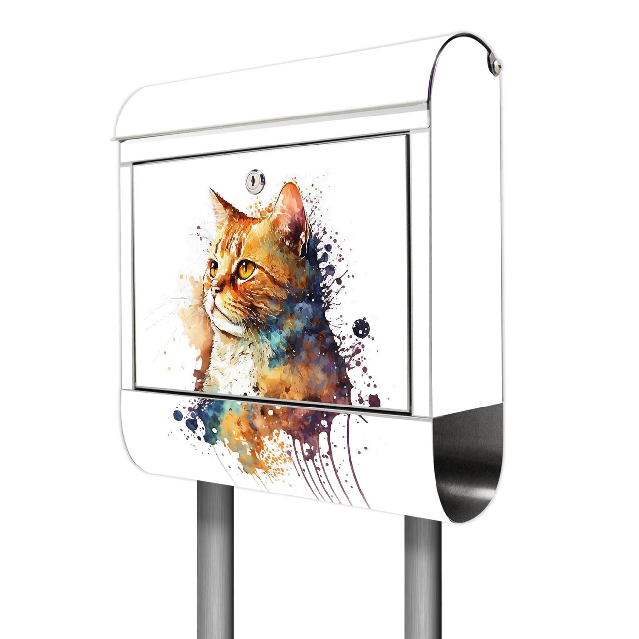 Der Motivstandbriefkasten hat ein sehr ansprechendes und ausgefallenes Design, damit entlocken Sie Ihren Nachbarn und dem Postboten ein Lächeln. Heben Sie Sich ab von der tristen grauen Masse, ohne auf Funktionalität zu verzichten. Der Briefkasten besteht aus hochwertigem 18/0 Edelstahl und die Wetter- und UV-resistenten Folie mit Motiv Katzenportrait in Aquarell 1 Motiv ist zusätzlich mit einem Schutzlaminat überzogen. Der Standbriefkasten wird mit Montagematerial und zwei Schlüsseln geliefert.