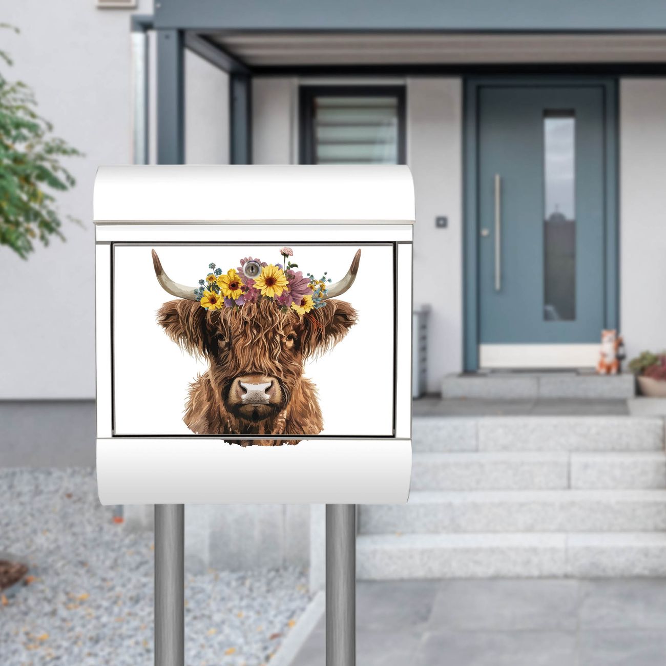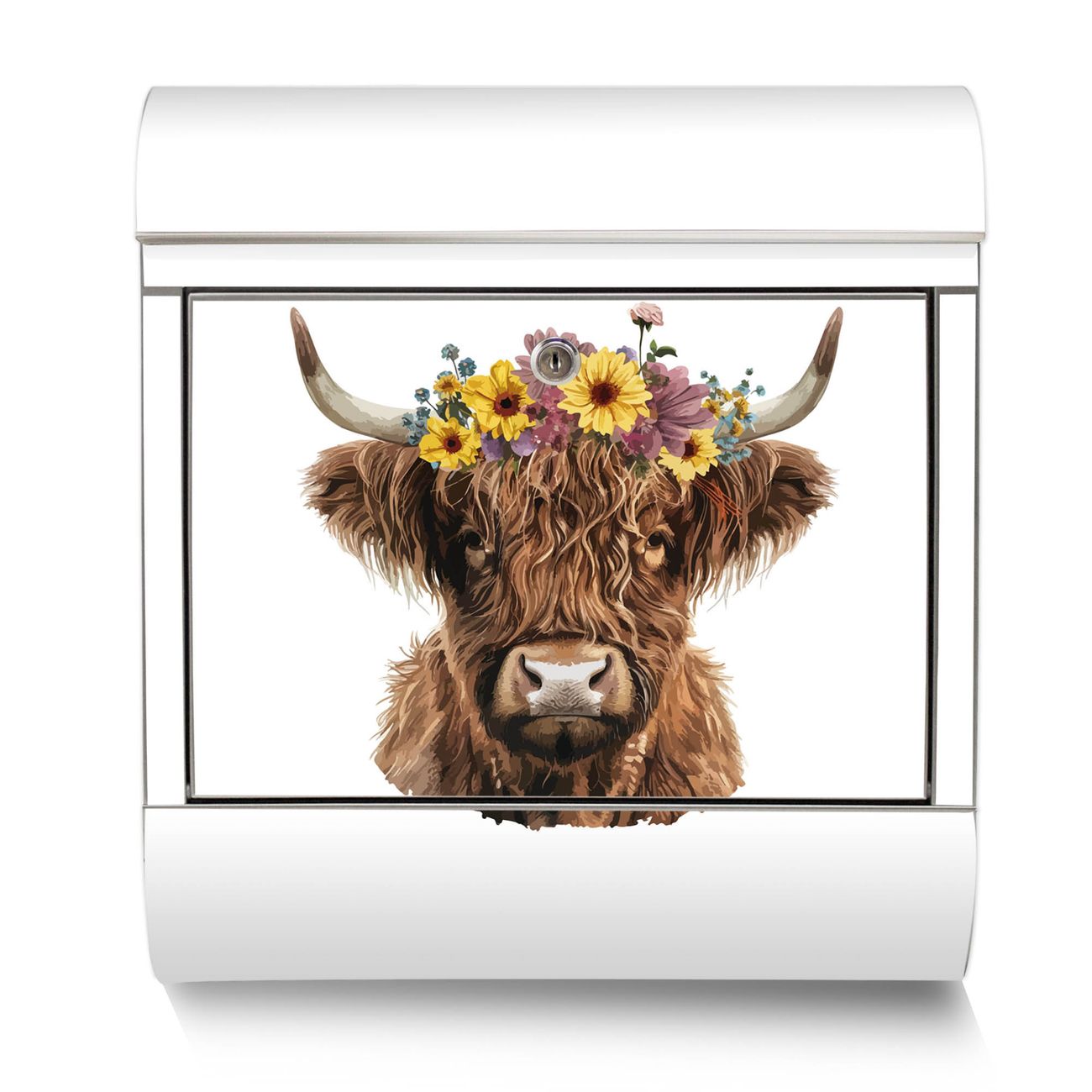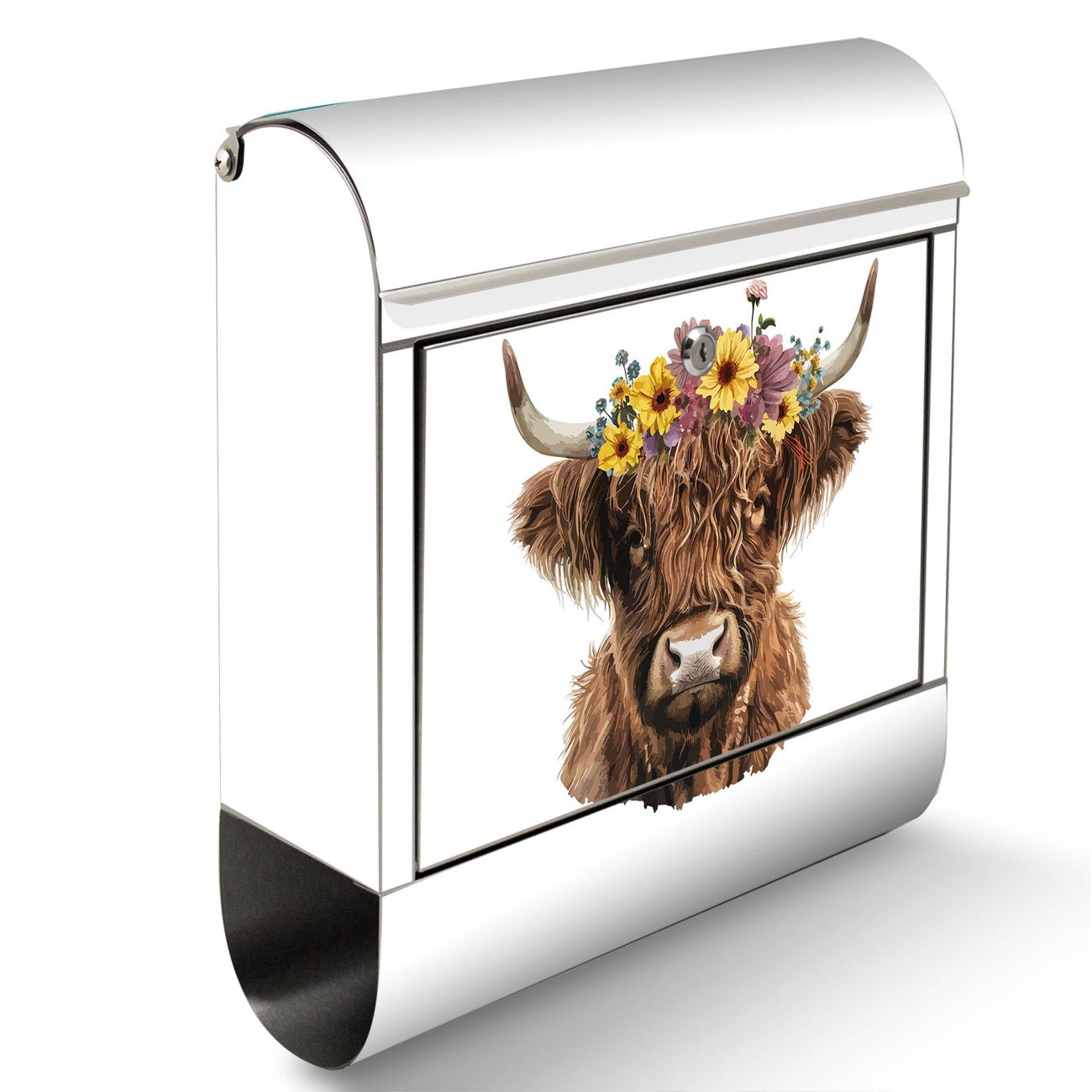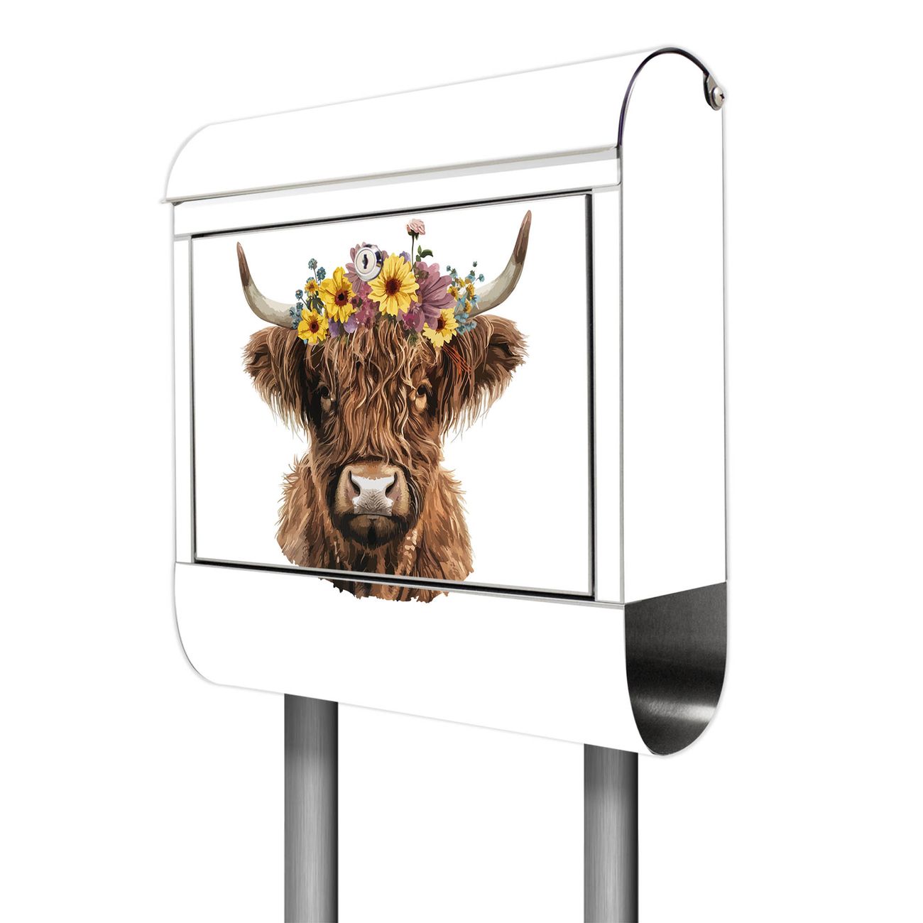Der Motivstandbriefkasten hat ein sehr ansprechendes und ausgefallenes Design, damit entlocken Sie Ihren Nachbarn und dem Postboten ein Lächeln. Heben Sie Sich ab von der tristen grauen Masse, ohne auf Funktionalität zu verzichten. Der Briefkasten besteht aus hochwertigem 18/0 Edelstahl und die Wetter- und UV-resistenten Folie mit Motiv Hochlandkuh mit Blumenkrone Motiv ist zusätzlich mit einem Schutzlaminat überzogen. Der Standbriefkasten wird mit Montagematerial und zwei Schlüsseln geliefert.