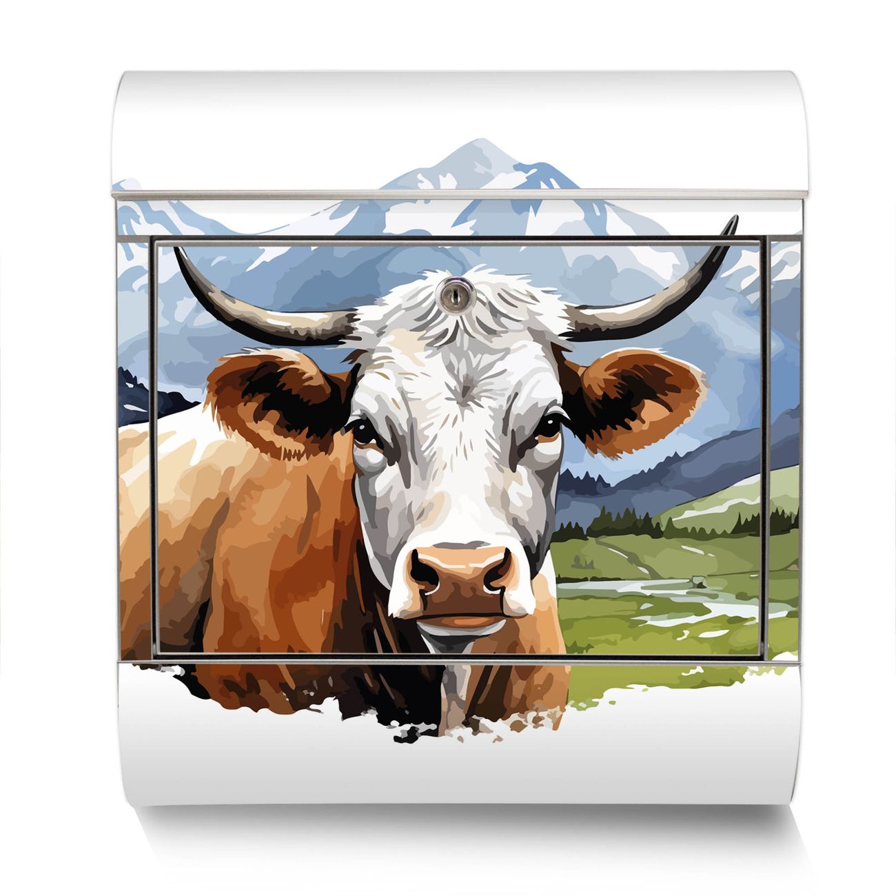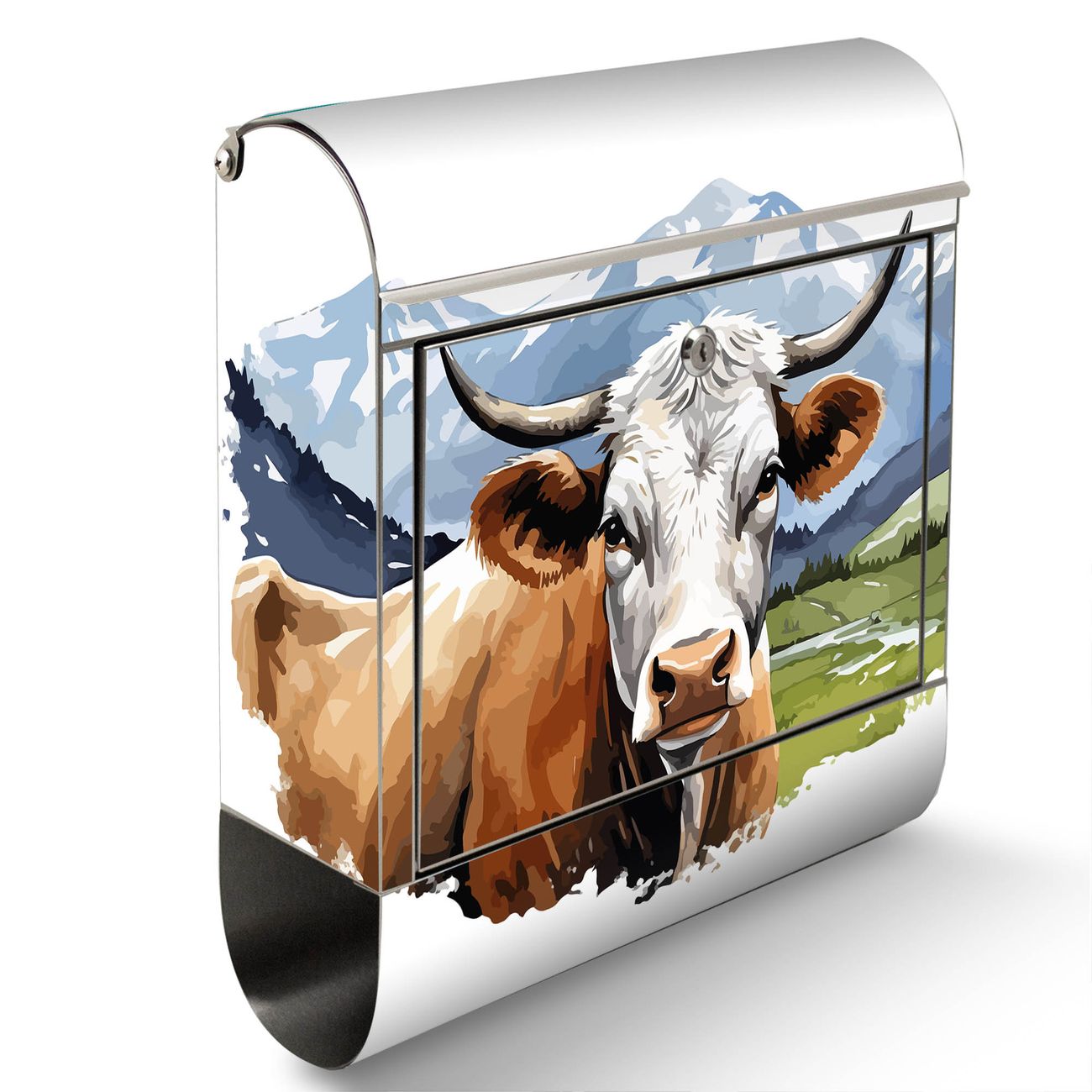 Der Motivstandbriefkasten hat ein sehr ansprechendes und ausgefallenes Design, damit entlocken Sie Ihren Nachbarn und dem Postboten ein Lächeln. Heben Sie Sich ab von der tristen grauen Masse, ohne auf Funktionalität zu verzichten. Der Briefkasten besteht aus hochwertigem 18/0 Edelstahl und die Wetter- und UV-resistenten Folie mit Motiv Bergkuh in der Landschaft Motiv ist zusätzlich mit einem Schutzlaminat überzogen. Der Standbriefkasten wird mit Montagematerial und zwei Schlüsseln geliefert.