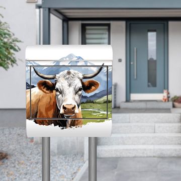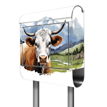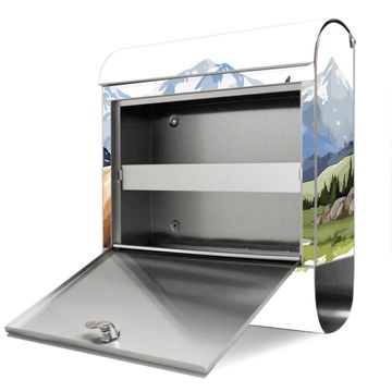Der banjado Edelstahl Standbriefkasten mit Motiv Motiv Bergkuh in der Landschaft bietet Ihnen mit seinem Fassungsvermögen genügend Platz auch für große A4 Sendungen. Das integrierte Zeitungsfach eignet sich hervorragend, um unkompliziert die Tageszeitung zu fassen.
