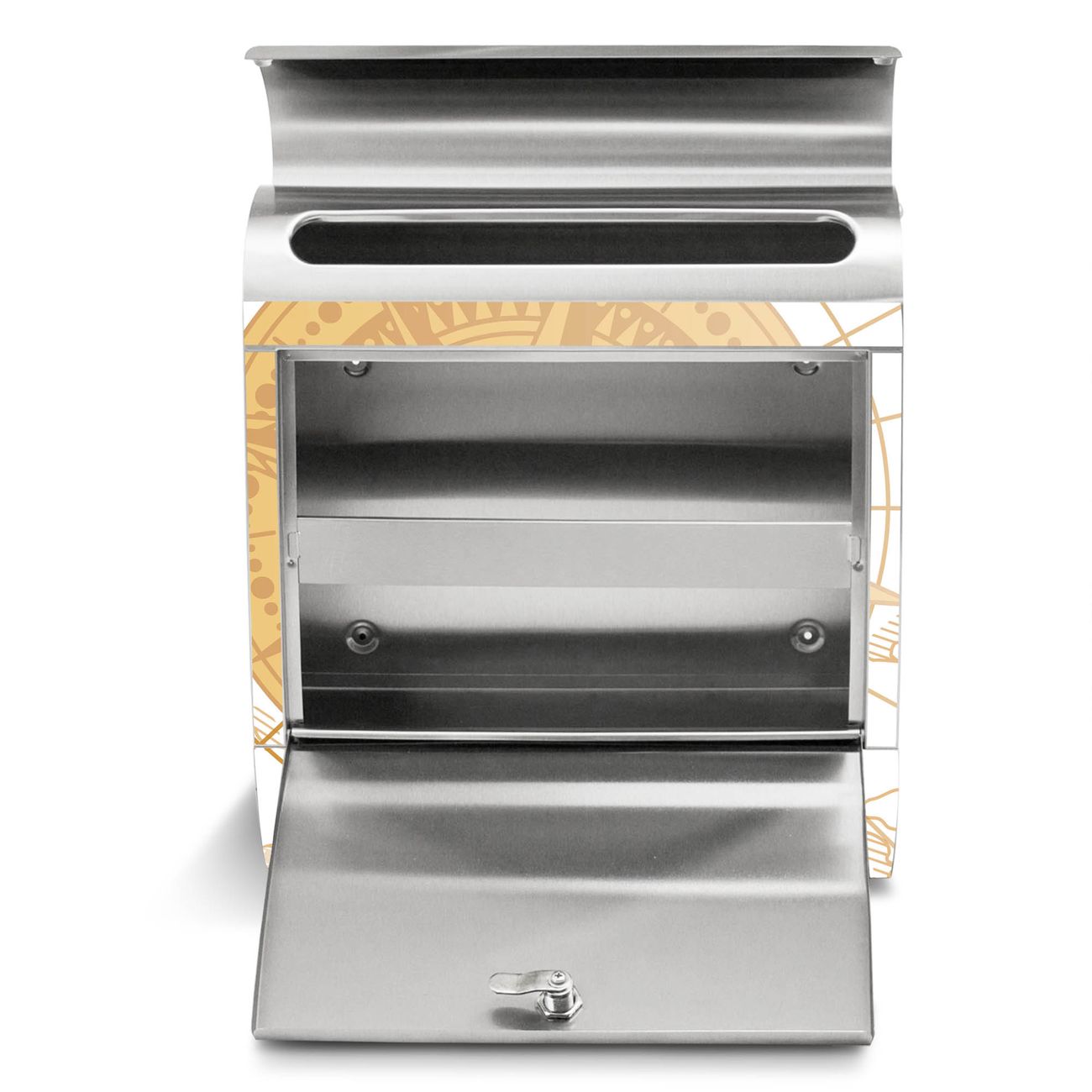 Der banjado Edelstahl Standbriefkasten mit Motiv Motiv Antike Kompassrose bietet Ihnen mit seinem Fassungsvermögen genügend Platz auch für große A4 Sendungen. Das integrierte Zeitungsfach eignet sich hervorragend, um unkompliziert die Tageszeitung zu fassen.