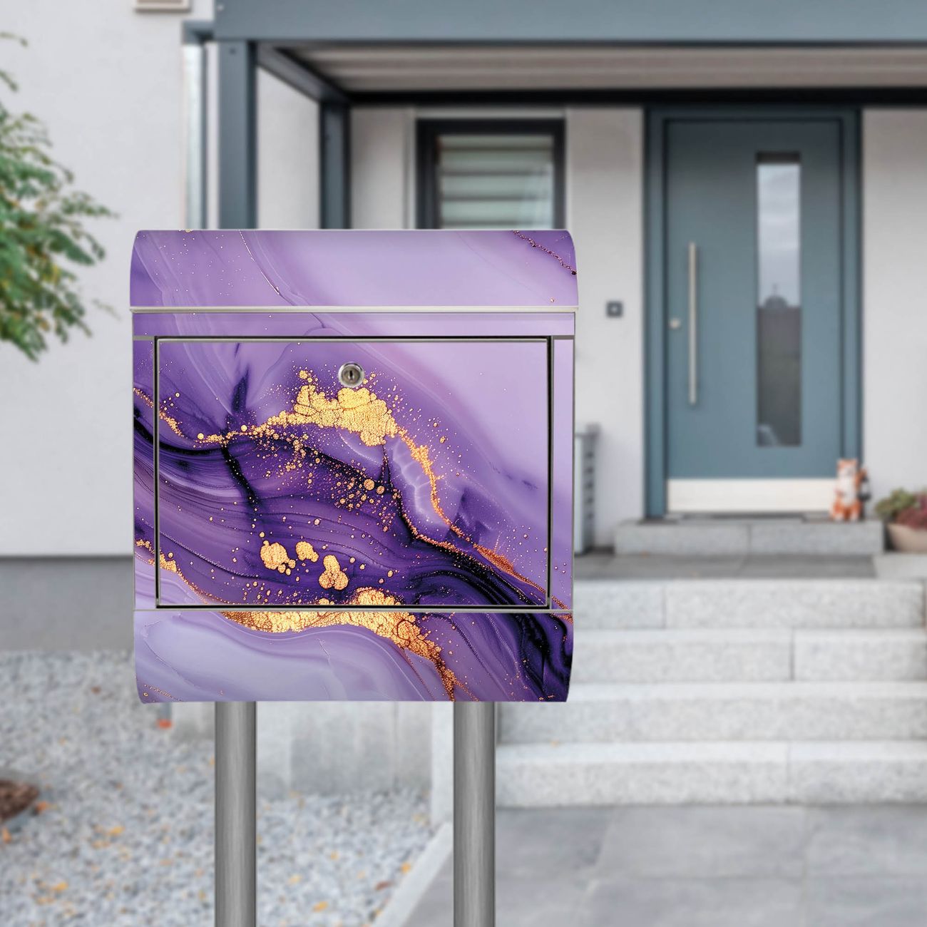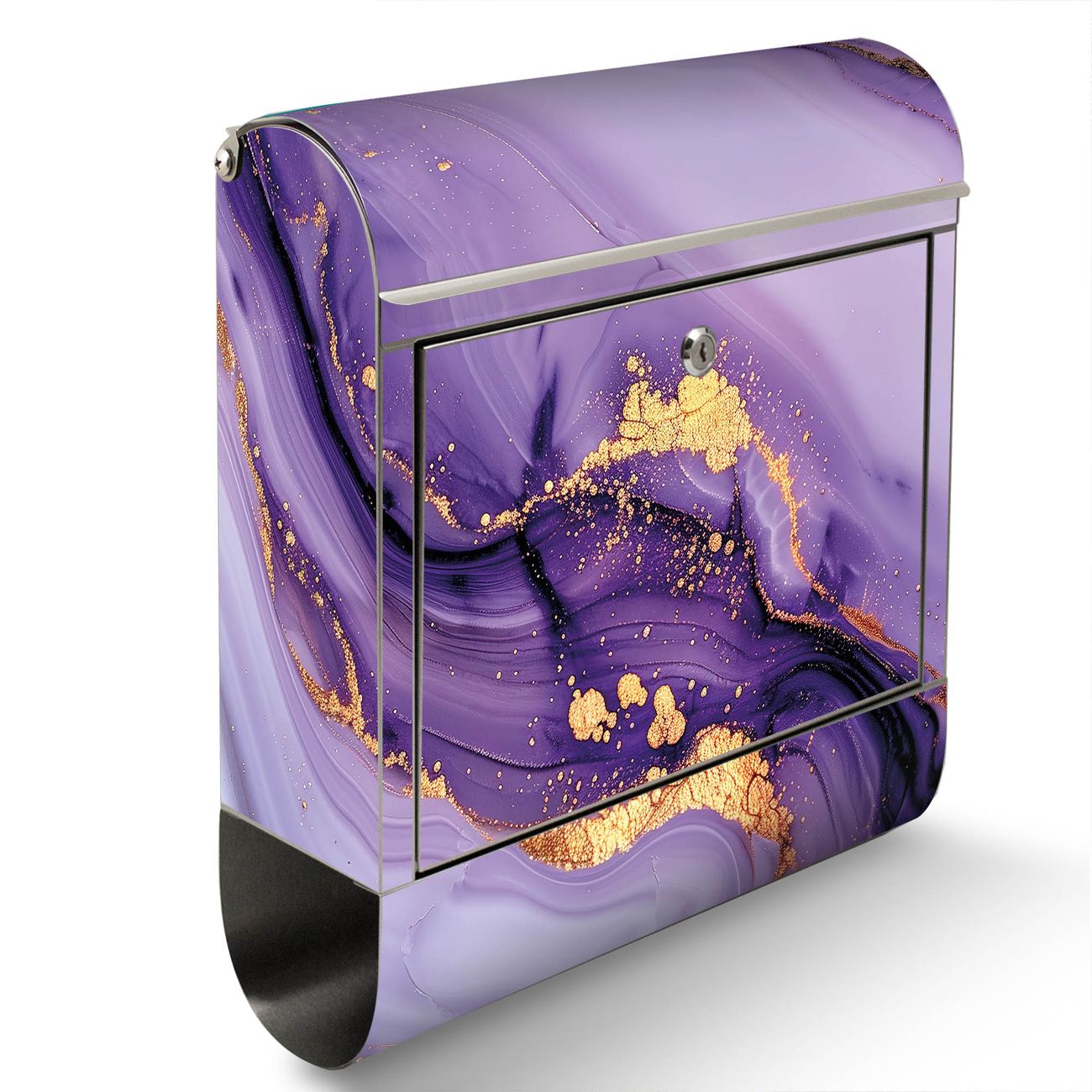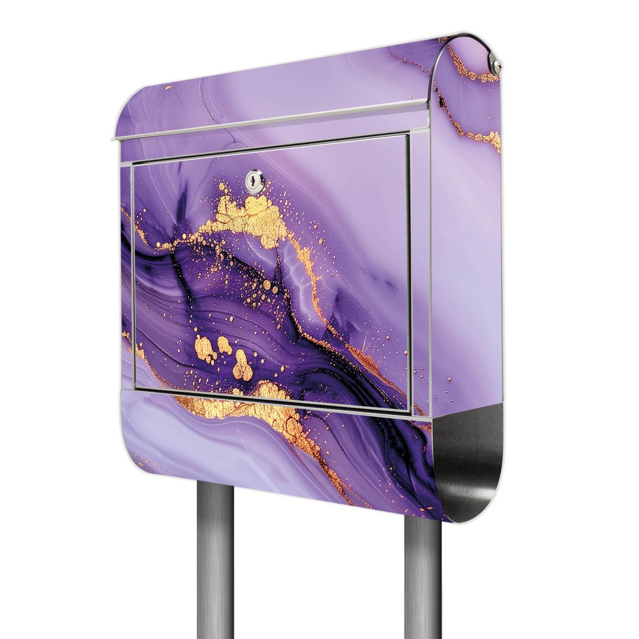 Der Motivstandbriefkasten hat ein sehr ansprechendes und ausgefallenes Design, damit entlocken Sie Ihren Nachbarn und dem Postboten ein Lächeln. Heben Sie Sich ab von der tristen grauen Masse, ohne auf Funktionalität zu verzichten. Der Briefkasten besteht aus hochwertigem 18/0 Edelstahl und die Wetter- und UV-resistenten Folie mit Motiv Lila Marmor mit Gold 3 Motiv ist zusätzlich mit einem Schutzlaminat überzogen. Der Standbriefkasten wird mit Montagematerial und zwei Schlüsseln geliefert.