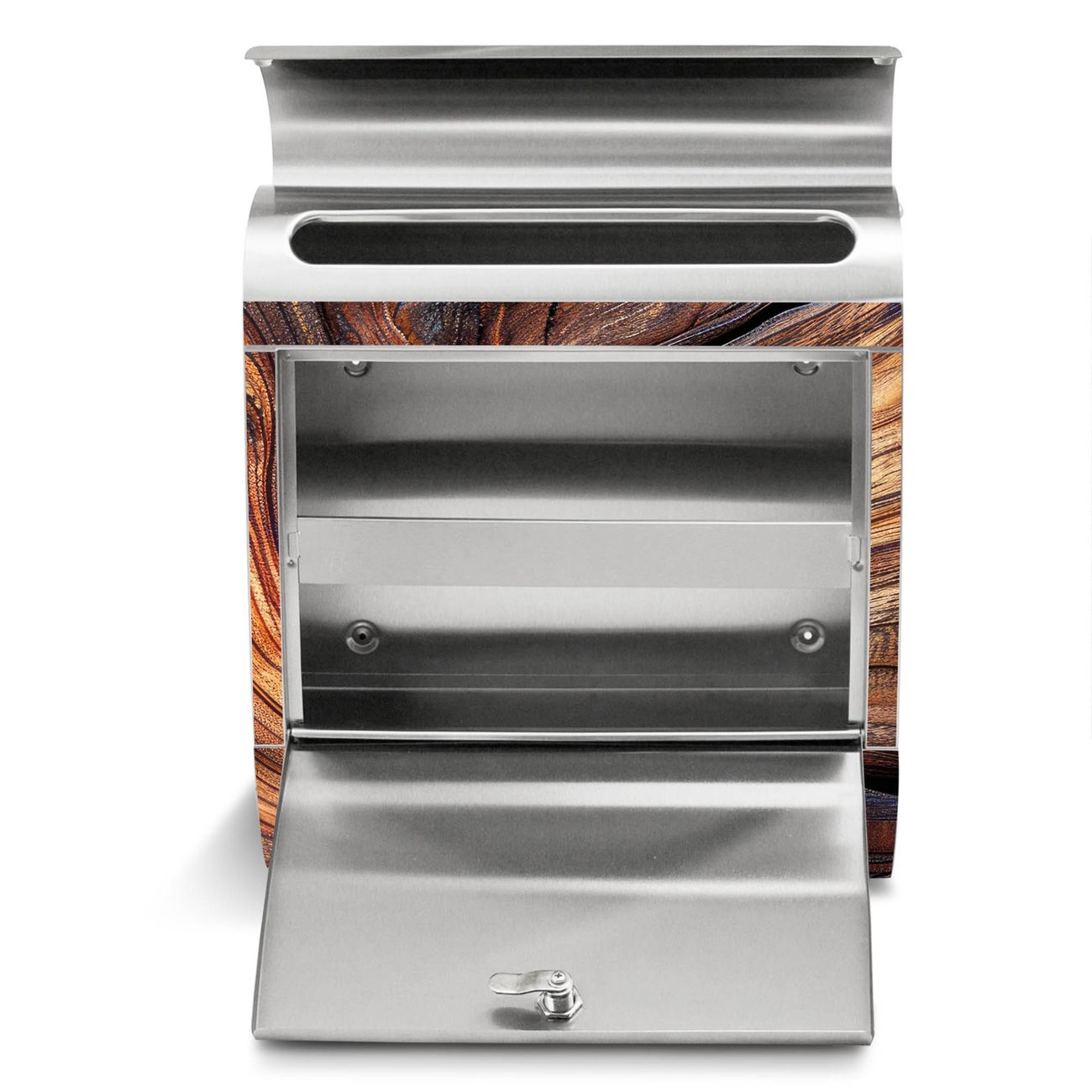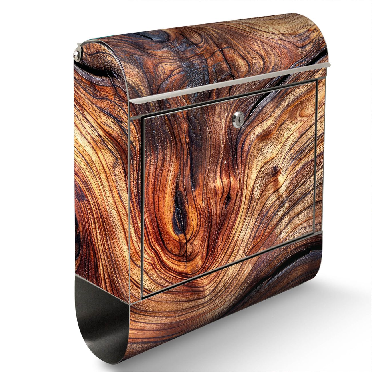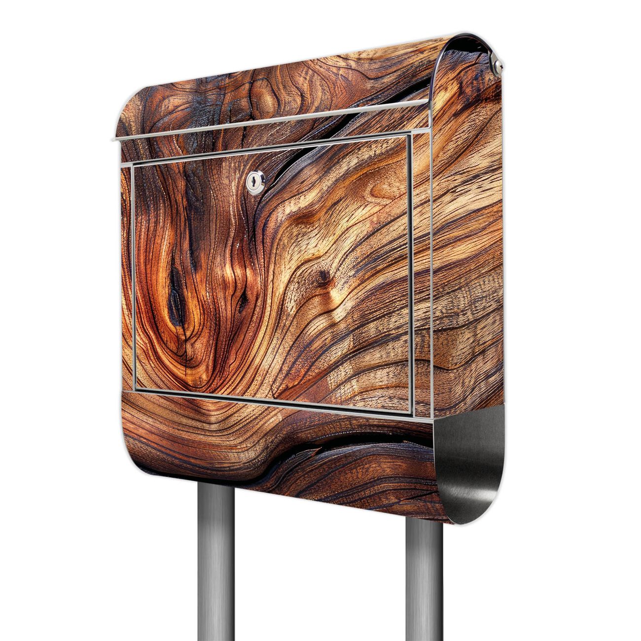Der Motivstandbriefkasten hat ein sehr ansprechendes und ausgefallenes Design, damit entlocken Sie Ihren Nachbarn und dem Postboten ein Lächeln. Heben Sie Sich ab von der tristen grauen Masse, ohne auf Funktionalität zu verzichten. Der Briefkasten besteht aus hochwertigem 18/0 Edelstahl und die Wetter- und UV-resistenten Folie mit Motiv Holz Gemasert Kurve Motiv ist zusätzlich mit einem Schutzlaminat überzogen. Der Standbriefkasten wird mit Montagematerial und zwei Schlüsseln geliefert.