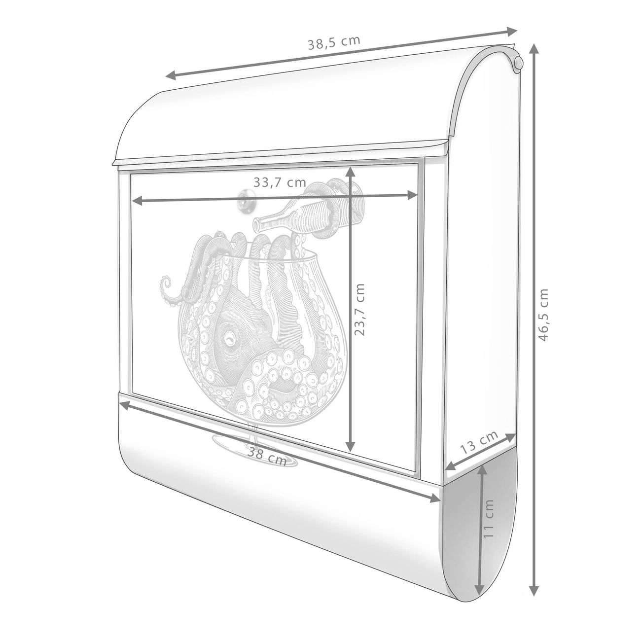 Der banjado Standbriefkasten mit Motiv Motiv Oktopus im Glas 2 kombiniert großzügigen Stauraum mit modernem Design. Durch das geräumige Fach finden auch große A4-Sendungen problemlos Platz. Die integrierte Zeitungsrolle sorgt dafür, dass Tageszeitungen und Magazine separat und griffbereit untergebracht sind. Der pulverbeschichtete Standfuß ist farblich passend zum Briefkasten gestaltet und sorgt für ein stimmiges Gesamtbild. Mit dem individuellen Motiv setzen Sie einen optischen Akzent, der sowohl praktisch als auch dekorativ ist.