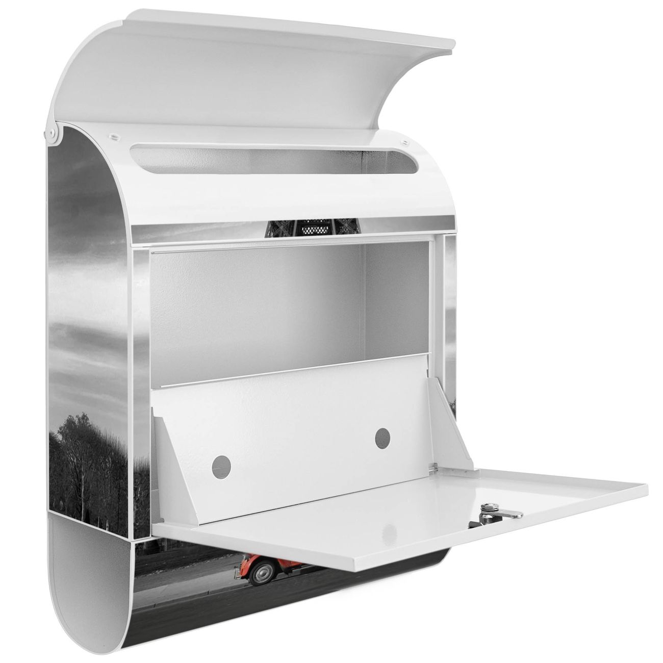 Der banjado Standbriefkasten mit Motiv Motiv Paris kombiniert großzügigen Stauraum mit modernem Design. Durch das geräumige Fach finden auch große A4-Sendungen problemlos Platz. Die integrierte Zeitungsrolle sorgt dafür, dass Tageszeitungen und Magazine separat und griffbereit untergebracht sind. Der pulverbeschichtete Standfuß ist farblich passend zum Briefkasten gestaltet und sorgt für ein stimmiges Gesamtbild. Mit dem individuellen Motiv setzen Sie einen optischen Akzent, der sowohl praktisch als auch dekorativ ist.