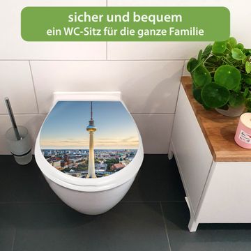 FUNKTION:Mit dem banjado Familien WC Sitz mit Absenkautomatik und dem Motiv Motiv Alexanderplatz verbinden Sie Design mit Funktionalität. Sie erhalten den Toilettendeckel in bewährt guter Qualität mit Montagematerial passend auf alle Euro-WC-Becken. Die Gesamtgröße beträgt 37,1cm x 44,9cm x 5cm, die Grundfarbe ist weiß.</p> DESIGN:Der Klodeckel in weiß mit Motiv Motiv Alexanderplatz hat eine ansprechende Optik, eine besondere Form und ist sehr stabil. Das Motiv besteht aus einer farbbrillianten Motivfolie, die durch ein Schutzlaminat zusätzlich vor Kratzern schützt. Der integrierte Kindersitz fügt sich harmonisch ein. DETAILS:Der Toilettensitz mit Soft Close besteht aus hochwertigem Polypropylen, ist geruchlos, ungiftig und kann mit handelsüblicher Seife gereinigt werden. Die Montage kann von von oben oder von unten erfolgen und ist kinderleicht. NUTZEN:Mit Hilfe der detaillierten Aufbauanleitung ermöglichen wir eine schnelle und unkomplizierte Montage. Die banjado Klobrille ist universell geeignet für alle Euro-WC-Schüsseln. Der Kindersitz kann unkompliziert entfernt werden. BANJADO:Ihr WC-Deckel wird in Sachsen in einer kleinen Manufaktur von Hand veredelt. Die Motivfolie ist lösungsmittelfrei und schutzlaminiert für einen langen Halt. Wir wünschen viel Freude bei der Auswahl eines schönen Motivs.