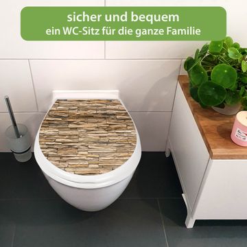 FUNKTION:Mit dem banjado Familien WC Sitz mit Absenkautomatik und dem Motiv Motiv Alte Mauer verbinden Sie Design mit Funktionalität. Sie erhalten den Toilettendeckel in bewährt guter Qualität mit Montagematerial passend auf alle Euro-WC-Becken. Die Gesamtgröße beträgt 37,1cm x 44,9cm x 5cm, die Grundfarbe ist weiß.</p> DESIGN:Der Klodeckel in weiß mit Motiv Motiv Alte Mauer hat eine ansprechende Optik, eine besondere Form und ist sehr stabil. Das Motiv besteht aus einer farbbrillianten Motivfolie, die durch ein Schutzlaminat zusätzlich vor Kratzern schützt. Der integrierte Kindersitz fügt sich harmonisch ein. DETAILS:Der Toilettensitz mit Soft Close besteht aus hochwertigem Polypropylen, ist geruchlos, ungiftig und kann mit handelsüblicher Seife gereinigt werden. Die Montage kann von von oben oder von unten erfolgen und ist kinderleicht. NUTZEN:Mit Hilfe der detaillierten Aufbauanleitung ermöglichen wir eine schnelle und unkomplizierte Montage. Die banjado Klobrille ist universell geeignet für alle Euro-WC-Schüsseln. Der Kindersitz kann unkompliziert entfernt werden. BANJADO:Ihr WC-Deckel wird in Sachsen in einer kleinen Manufaktur von Hand veredelt. Die Motivfolie ist lösungsmittelfrei und schutzlaminiert für einen langen Halt. Wir wünschen viel Freude bei der Auswahl eines schönen Motivs.