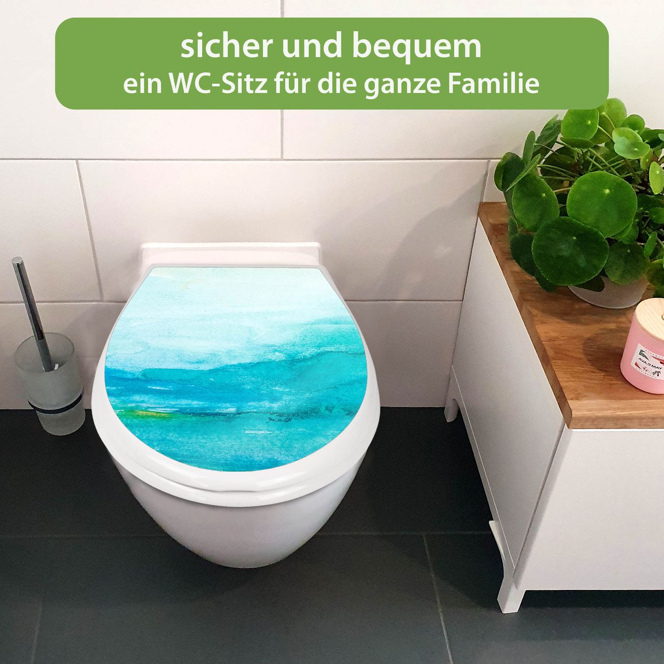 FUNKTION:Mit dem banjado Familien WC Sitz mit Absenkautomatik und dem Motiv Motiv Aquarell Blau verbinden Sie Design mit Funktionalität. Sie erhalten den Toilettendeckel in bewährt guter Qualität mit Montagematerial passend auf alle Euro-WC-Becken. Die Gesamtgröße beträgt 37,1cm x 44,9cm x 5cm, die Grundfarbe ist weiß.</p> DESIGN:Der Klodeckel in weiß mit Motiv Motiv Aquarell Blau hat eine ansprechende Optik, eine besondere Form und ist sehr stabil. Das Motiv besteht aus einer farbbrillianten Motivfolie, die durch ein Schutzlaminat zusätzlich vor Kratzern schützt. Der integrierte Kindersitz fügt sich harmonisch ein. DETAILS:Der Toilettensitz mit Soft Close besteht aus hochwertigem Polypropylen, ist geruchlos, ungiftig und kann mit handelsüblicher Seife gereinigt werden. Die Montage kann von von oben oder von unten erfolgen und ist kinderleicht. NUTZEN:Mit Hilfe der detaillierten Aufbauanleitung ermöglichen wir eine schnelle und unkomplizierte Montage. Die banjado Klobrille ist universell geeignet für alle Euro-WC-Schüsseln. Der Kindersitz kann unkompliziert entfernt werden. BANJADO:Ihr WC-Deckel wird in Sachsen in einer kleinen Manufaktur von Hand veredelt. Die Motivfolie ist lösungsmittelfrei und schutzlaminiert für einen langen Halt. Wir wünschen viel Freude bei der Auswahl eines schönen Motivs.