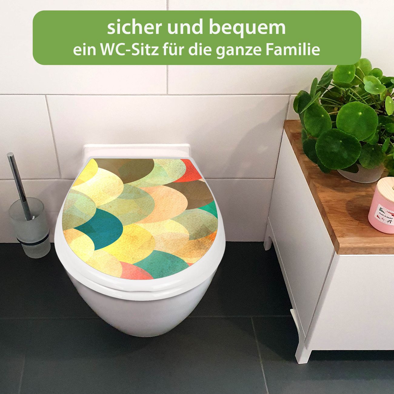 FUNKTION:Mit dem banjado Familien WC Sitz mit Absenkautomatik und dem Motiv Motiv Aquarell Schuppen verbinden Sie Design mit Funktionalität. Sie erhalten den Toilettendeckel in bewährt guter Qualität mit Montagematerial passend auf alle Euro-WC-Becken. Die Gesamtgröße beträgt 37,1cm x 44,9cm x 5cm, die Grundfarbe ist weiß.</p> DESIGN:Der Klodeckel in weiß mit Motiv Motiv Aquarell Schuppen hat eine ansprechende Optik, eine besondere Form und ist sehr stabil. Das Motiv besteht aus einer farbbrillianten Motivfolie, die durch ein Schutzlaminat zusätzlich vor Kratzern schützt. Der integrierte Kindersitz fügt sich harmonisch ein. DETAILS:Der Toilettensitz mit Soft Close besteht aus hochwertigem Polypropylen, ist geruchlos, ungiftig und kann mit handelsüblicher Seife gereinigt werden. Die Montage kann von von oben oder von unten erfolgen und ist kinderleicht. NUTZEN:Mit Hilfe der detaillierten Aufbauanleitung ermöglichen wir eine schnelle und unkomplizierte Montage. Die banjado Klobrille ist universell geeignet für alle Euro-WC-Schüsseln. Der Kindersitz kann unkompliziert entfernt werden. BANJADO:Ihr WC-Deckel wird in Sachsen in einer kleinen Manufaktur von Hand veredelt. Die Motivfolie ist lösungsmittelfrei und schutzlaminiert für einen langen Halt. Wir wünschen viel Freude bei der Auswahl eines schönen Motivs.