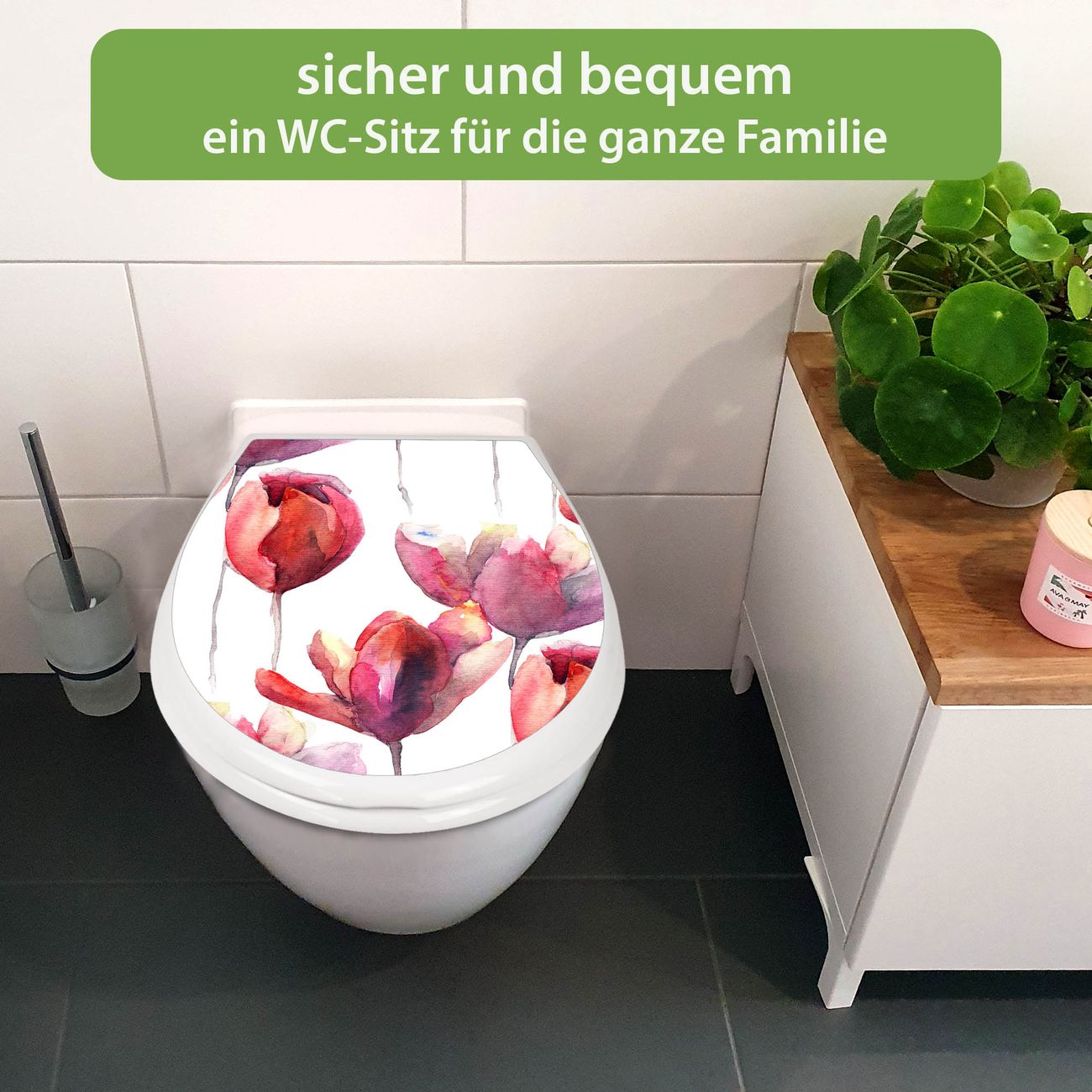 FUNKTION:Mit dem banjado Familien WC Sitz mit Absenkautomatik und dem Motiv Motiv Aquarell Tulpen verbinden Sie Design mit Funktionalität. Sie erhalten den Toilettendeckel in bewährt guter Qualität mit Montagematerial passend auf alle Euro-WC-Becken. Die Gesamtgröße beträgt 37,1cm x 44,9cm x 5cm, die Grundfarbe ist weiß.</p> DESIGN:Der Klodeckel in weiß mit Motiv Motiv Aquarell Tulpen hat eine ansprechende Optik, eine besondere Form und ist sehr stabil. Das Motiv besteht aus einer farbbrillianten Motivfolie, die durch ein Schutzlaminat zusätzlich vor Kratzern schützt. Der integrierte Kindersitz fügt sich harmonisch ein. DETAILS:Der Toilettensitz mit Soft Close besteht aus hochwertigem Polypropylen, ist geruchlos, ungiftig und kann mit handelsüblicher Seife gereinigt werden. Die Montage kann von von oben oder von unten erfolgen und ist kinderleicht. NUTZEN:Mit Hilfe der detaillierten Aufbauanleitung ermöglichen wir eine schnelle und unkomplizierte Montage. Die banjado Klobrille ist universell geeignet für alle Euro-WC-Schüsseln. Der Kindersitz kann unkompliziert entfernt werden. BANJADO:Ihr WC-Deckel wird in Sachsen in einer kleinen Manufaktur von Hand veredelt. Die Motivfolie ist lösungsmittelfrei und schutzlaminiert für einen langen Halt. Wir wünschen viel Freude bei der Auswahl eines schönen Motivs.