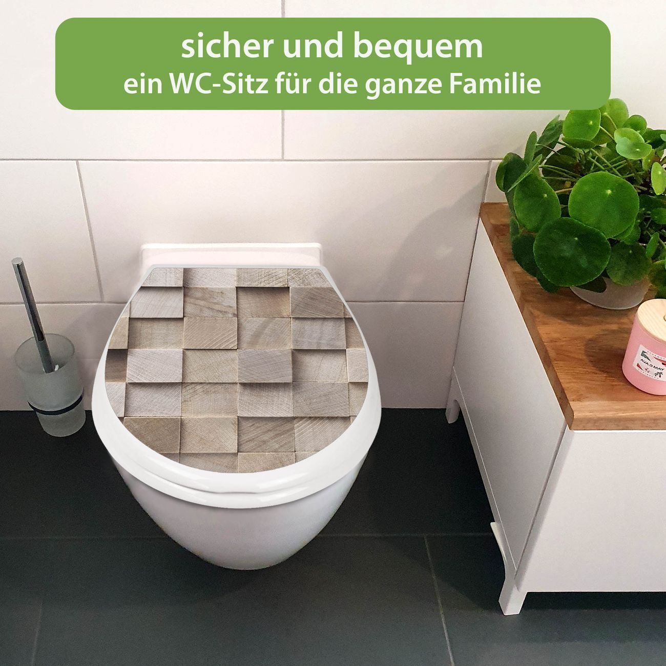 FUNKTION:Mit dem banjado Familien WC Sitz mit Absenkautomatik und dem Motiv Motiv Bauklötze Relief verbinden Sie Design mit Funktionalität. Sie erhalten den Toilettendeckel in bewährt guter Qualität mit Montagematerial passend auf alle Euro-WC-Becken. Die Gesamtgröße beträgt 37,1cm x 44,9cm x 5cm, die Grundfarbe ist weiß.</p> DESIGN:Der Klodeckel in weiß mit Motiv Motiv Bauklötze Relief hat eine ansprechende Optik, eine besondere Form und ist sehr stabil. Das Motiv besteht aus einer farbbrillianten Motivfolie, die durch ein Schutzlaminat zusätzlich vor Kratzern schützt. Der integrierte Kindersitz fügt sich harmonisch ein. DETAILS:Der Toilettensitz mit Soft Close besteht aus hochwertigem Polypropylen, ist geruchlos, ungiftig und kann mit handelsüblicher Seife gereinigt werden. Die Montage kann von von oben oder von unten erfolgen und ist kinderleicht. NUTZEN:Mit Hilfe der detaillierten Aufbauanleitung ermöglichen wir eine schnelle und unkomplizierte Montage. Die banjado Klobrille ist universell geeignet für alle Euro-WC-Schüsseln. Der Kindersitz kann unkompliziert entfernt werden. BANJADO:Ihr WC-Deckel wird in Sachsen in einer kleinen Manufaktur von Hand veredelt. Die Motivfolie ist lösungsmittelfrei und schutzlaminiert für einen langen Halt. Wir wünschen viel Freude bei der Auswahl eines schönen Motivs.