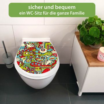 FUNKTION:Mit dem banjado Familien WC Sitz mit Absenkautomatik und dem Motiv Motiv Birds Worms Freaks verbinden Sie Design mit Funktionalität. Sie erhalten den Toilettendeckel in bewährt guter Qualität mit Montagematerial passend auf alle Euro-WC-Becken. Die Gesamtgröße beträgt 37,1cm x 44,9cm x 5cm, die Grundfarbe ist weiß.</p> DESIGN:Der Klodeckel in weiß mit Motiv Motiv Birds Worms Freaks hat eine ansprechende Optik, eine besondere Form und ist sehr stabil. Das Motiv besteht aus einer farbbrillianten Motivfolie, die durch ein Schutzlaminat zusätzlich vor Kratzern schützt. Der integrierte Kindersitz fügt sich harmonisch ein. DETAILS:Der Toilettensitz mit Soft Close besteht aus hochwertigem Polypropylen, ist geruchlos, ungiftig und kann mit handelsüblicher Seife gereinigt werden. Die Montage kann von von oben oder von unten erfolgen und ist kinderleicht. NUTZEN:Mit Hilfe der detaillierten Aufbauanleitung ermöglichen wir eine schnelle und unkomplizierte Montage. Die banjado Klobrille ist universell geeignet für alle Euro-WC-Schüsseln. Der Kindersitz kann unkompliziert entfernt werden. BANJADO:Ihr WC-Deckel wird in Sachsen in einer kleinen Manufaktur von Hand veredelt. Die Motivfolie ist lösungsmittelfrei und schutzlaminiert für einen langen Halt. Wir wünschen viel Freude bei der Auswahl eines schönen Motivs.