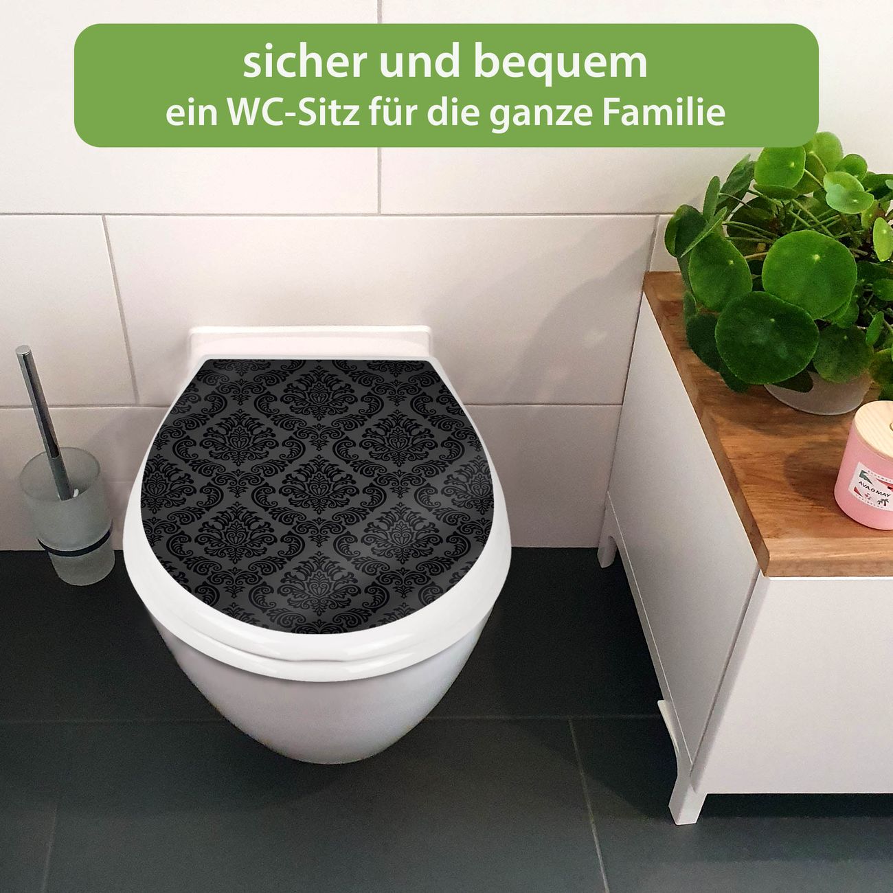 FUNKTION:Mit dem banjado Familien WC Sitz mit Absenkautomatik und dem Motiv Motiv Black Deluxe verbinden Sie Design mit Funktionalität. Sie erhalten den Toilettendeckel in bewährt guter Qualität mit Montagematerial passend auf alle Euro-WC-Becken. Die Gesamtgröße beträgt 37,1cm x 44,9cm x 5cm, die Grundfarbe ist weiß.</p> DESIGN:Der Klodeckel in weiß mit Motiv Motiv Black Deluxe hat eine ansprechende Optik, eine besondere Form und ist sehr stabil. Das Motiv besteht aus einer farbbrillianten Motivfolie, die durch ein Schutzlaminat zusätzlich vor Kratzern schützt. Der integrierte Kindersitz fügt sich harmonisch ein. DETAILS:Der Toilettensitz mit Soft Close besteht aus hochwertigem Polypropylen, ist geruchlos, ungiftig und kann mit handelsüblicher Seife gereinigt werden. Die Montage kann von von oben oder von unten erfolgen und ist kinderleicht. NUTZEN:Mit Hilfe der detaillierten Aufbauanleitung ermöglichen wir eine schnelle und unkomplizierte Montage. Die banjado Klobrille ist universell geeignet für alle Euro-WC-Schüsseln. Der Kindersitz kann unkompliziert entfernt werden. BANJADO:Ihr WC-Deckel wird in Sachsen in einer kleinen Manufaktur von Hand veredelt. Die Motivfolie ist lösungsmittelfrei und schutzlaminiert für einen langen Halt. Wir wünschen viel Freude bei der Auswahl eines schönen Motivs.