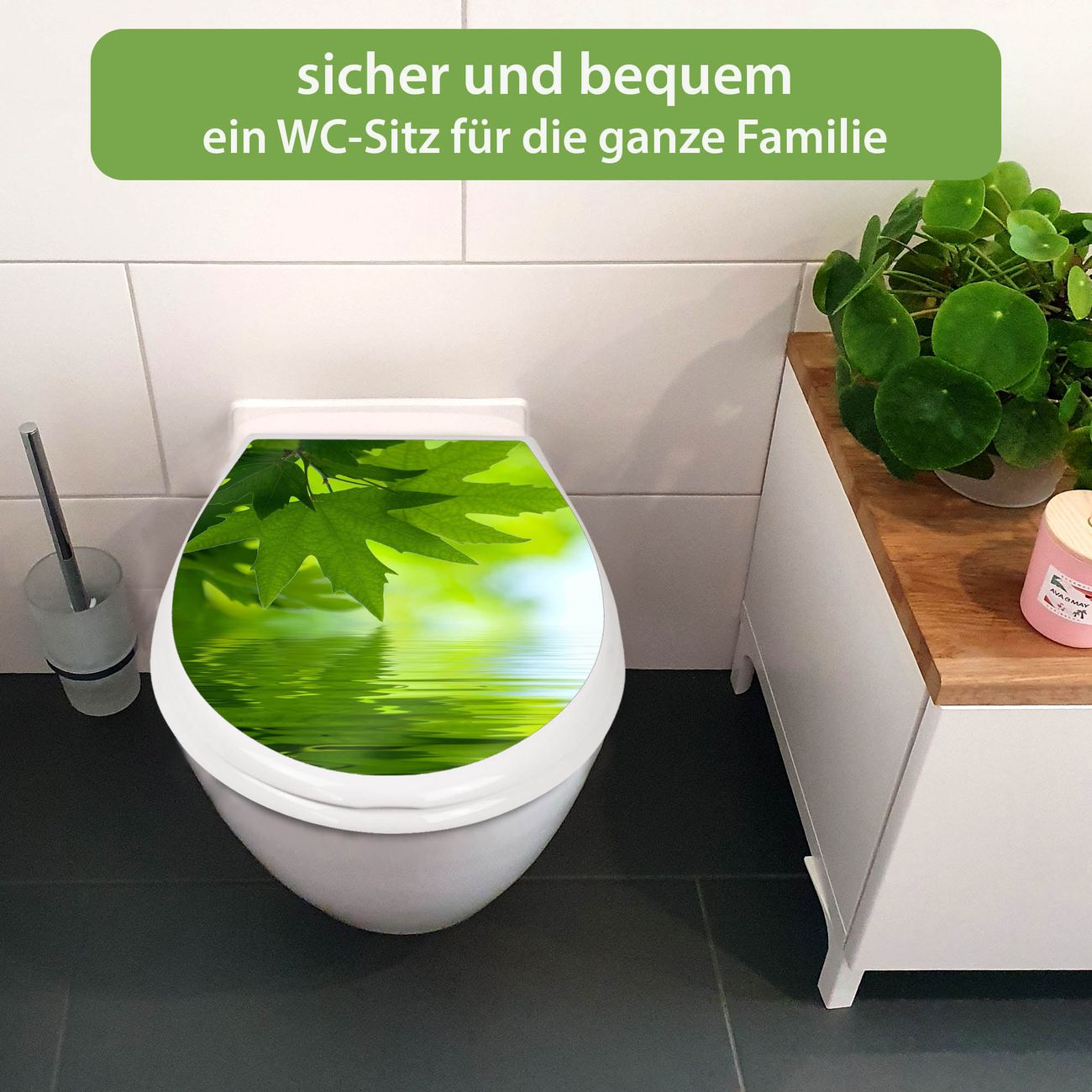 FUNKTION:Mit dem banjado Familien WC Sitz mit Absenkautomatik und dem Motiv Motiv Blättertraum verbinden Sie Design mit Funktionalität. Sie erhalten den Toilettendeckel in bewährt guter Qualität mit Montagematerial passend auf alle Euro-WC-Becken. Die Gesamtgröße beträgt 37,1cm x 44,9cm x 5cm, die Grundfarbe ist weiß.</p> DESIGN:Der Klodeckel in weiß mit Motiv Motiv Blättertraum hat eine ansprechende Optik, eine besondere Form und ist sehr stabil. Das Motiv besteht aus einer farbbrillianten Motivfolie, die durch ein Schutzlaminat zusätzlich vor Kratzern schützt. Der integrierte Kindersitz fügt sich harmonisch ein. DETAILS:Der Toilettensitz mit Soft Close besteht aus hochwertigem Polypropylen, ist geruchlos, ungiftig und kann mit handelsüblicher Seife gereinigt werden. Die Montage kann von von oben oder von unten erfolgen und ist kinderleicht. NUTZEN:Mit Hilfe der detaillierten Aufbauanleitung ermöglichen wir eine schnelle und unkomplizierte Montage. Die banjado Klobrille ist universell geeignet für alle Euro-WC-Schüsseln. Der Kindersitz kann unkompliziert entfernt werden. BANJADO:Ihr WC-Deckel wird in Sachsen in einer kleinen Manufaktur von Hand veredelt. Die Motivfolie ist lösungsmittelfrei und schutzlaminiert für einen langen Halt. Wir wünschen viel Freude bei der Auswahl eines schönen Motivs.