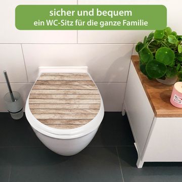 FUNKTION:Mit dem banjado Familien WC Sitz mit Absenkautomatik und dem Motiv Motiv Blasse Holzlatten verbinden Sie Design mit Funktionalität. Sie erhalten den Toilettendeckel in bewährt guter Qualität mit Montagematerial passend auf alle Euro-WC-Becken. Die Gesamtgröße beträgt 37,1cm x 44,9cm x 5cm, die Grundfarbe ist weiß.</p> DESIGN:Der Klodeckel in weiß mit Motiv Motiv Blasse Holzlatten hat eine ansprechende Optik, eine besondere Form und ist sehr stabil. Das Motiv besteht aus einer farbbrillianten Motivfolie, die durch ein Schutzlaminat zusätzlich vor Kratzern schützt. Der integrierte Kindersitz fügt sich harmonisch ein. DETAILS:Der Toilettensitz mit Soft Close besteht aus hochwertigem Polypropylen, ist geruchlos, ungiftig und kann mit handelsüblicher Seife gereinigt werden. Die Montage kann von von oben oder von unten erfolgen und ist kinderleicht. NUTZEN:Mit Hilfe der detaillierten Aufbauanleitung ermöglichen wir eine schnelle und unkomplizierte Montage. Die banjado Klobrille ist universell geeignet für alle Euro-WC-Schüsseln. Der Kindersitz kann unkompliziert entfernt werden. BANJADO:Ihr WC-Deckel wird in Sachsen in einer kleinen Manufaktur von Hand veredelt. Die Motivfolie ist lösungsmittelfrei und schutzlaminiert für einen langen Halt. Wir wünschen viel Freude bei der Auswahl eines schönen Motivs.