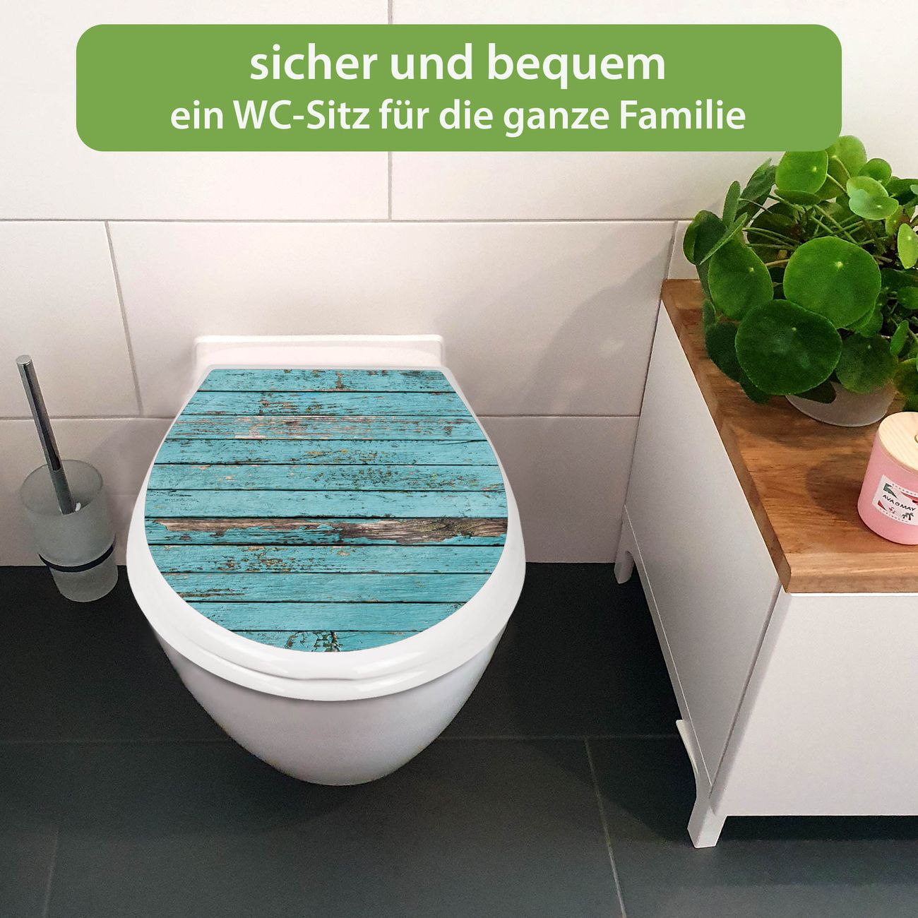 FUNKTION:Mit dem banjado Familien WC Sitz mit Absenkautomatik und dem Motiv Motiv Blaue Holzlatten verbinden Sie Design mit Funktionalität. Sie erhalten den Toilettendeckel in bewährt guter Qualität mit Montagematerial passend auf alle Euro-WC-Becken. Die Gesamtgröße beträgt 37,1cm x 44,9cm x 5cm, die Grundfarbe ist weiß.</p> DESIGN:Der Klodeckel in weiß mit Motiv Motiv Blaue Holzlatten hat eine ansprechende Optik, eine besondere Form und ist sehr stabil. Das Motiv besteht aus einer farbbrillianten Motivfolie, die durch ein Schutzlaminat zusätzlich vor Kratzern schützt. Der integrierte Kindersitz fügt sich harmonisch ein. DETAILS:Der Toilettensitz mit Soft Close besteht aus hochwertigem Polypropylen, ist geruchlos, ungiftig und kann mit handelsüblicher Seife gereinigt werden. Die Montage kann von von oben oder von unten erfolgen und ist kinderleicht. NUTZEN:Mit Hilfe der detaillierten Aufbauanleitung ermöglichen wir eine schnelle und unkomplizierte Montage. Die banjado Klobrille ist universell geeignet für alle Euro-WC-Schüsseln. Der Kindersitz kann unkompliziert entfernt werden. BANJADO:Ihr WC-Deckel wird in Sachsen in einer kleinen Manufaktur von Hand veredelt. Die Motivfolie ist lösungsmittelfrei und schutzlaminiert für einen langen Halt. Wir wünschen viel Freude bei der Auswahl eines schönen Motivs.