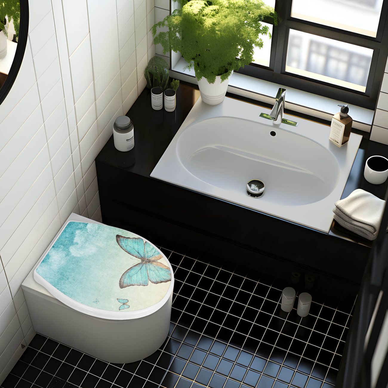 FUNKTION:Mit dem banjado Familien WC Sitz mit Absenkautomatik und dem Motiv Blaue Schmetterlinge verbinden Sie Design mit Funktionalität. Sie erhalten den Toilettendeckel in bewährt guter Qualität mit Montagematerial passend auf alle Euro-WC-Becken. Die Gesamtgröße beträgt 37cm x 44,5cm x 5cm, die Grundfarbe ist weiß.</p> DESIGN:Der Klodeckel in weiß mit Motiv Blaue Schmetterlinge hat eine ansprechende Optik, eine besondere Form und ist sehr stabil. Das Motiv besteht aus einer farbbrillianten Motivfolie, die durch ein Schutzlaminat zusätzlich vor Kratzern schützt. Der integrierte Kindersitz fügt sich harmonisch ein. DETAILS:Der Toilettensitz mit Soft Close besteht aus hochwertigem Polypropylen, ist geruchlos, ungiftig und kann mit handelsüblicher Seife gereinigt werden. Die Montage kann von von oben oder von unten erfolgen und ist kinderleicht. NUTZEN:Mit Hilfe der detaillierten Aufbauanleitung ermöglichen wir eine schnelle und unkomplizierte Montage. Die banjado Klobrille ist universell geeignet für alle Euro-WC-Schüsseln. Der Kindersitz kann unkompliziert entfernt werden. BANJADO:Ihr WC-Deckel wird in Sachsen in einer kleinen Manufaktur von Hand veredelt. Die Motivfolie ist lösungsmittelfrei und schutzlaminiert für einen langen Halt. Wir wünschen viel Freude bei der Auswahl eines schönen Motivs.