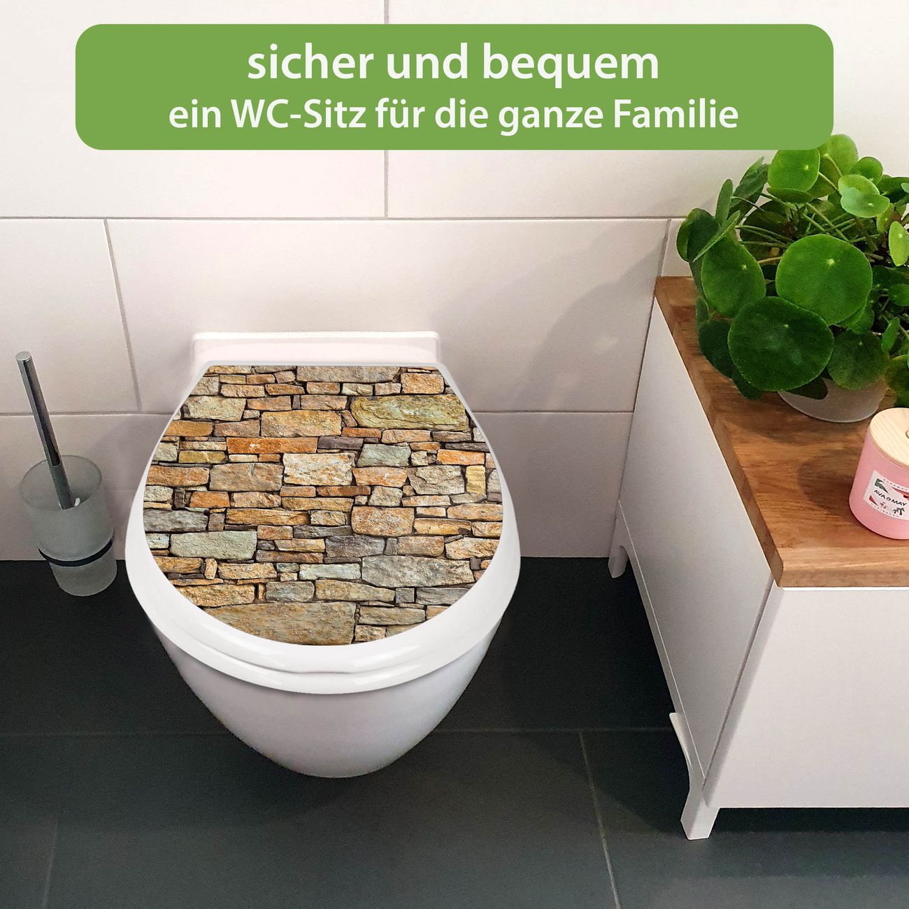 FUNKTION:Mit dem banjado Familien WC Sitz mit Absenkautomatik und dem Motiv Motiv Bruchsteinmauer verbinden Sie Design mit Funktionalität. Sie erhalten den Toilettendeckel in bewährt guter Qualität mit Montagematerial passend auf alle Euro-WC-Becken. Die Gesamtgröße beträgt 37,1cm x 44,9cm x 5cm, die Grundfarbe ist weiß.</p> DESIGN:Der Klodeckel in weiß mit Motiv Motiv Bruchsteinmauer hat eine ansprechende Optik, eine besondere Form und ist sehr stabil. Das Motiv besteht aus einer farbbrillianten Motivfolie, die durch ein Schutzlaminat zusätzlich vor Kratzern schützt. Der integrierte Kindersitz fügt sich harmonisch ein. DETAILS:Der Toilettensitz mit Soft Close besteht aus hochwertigem Polypropylen, ist geruchlos, ungiftig und kann mit handelsüblicher Seife gereinigt werden. Die Montage kann von von oben oder von unten erfolgen und ist kinderleicht. NUTZEN:Mit Hilfe der detaillierten Aufbauanleitung ermöglichen wir eine schnelle und unkomplizierte Montage. Die banjado Klobrille ist universell geeignet für alle Euro-WC-Schüsseln. Der Kindersitz kann unkompliziert entfernt werden. BANJADO:Ihr WC-Deckel wird in Sachsen in einer kleinen Manufaktur von Hand veredelt. Die Motivfolie ist lösungsmittelfrei und schutzlaminiert für einen langen Halt. Wir wünschen viel Freude bei der Auswahl eines schönen Motivs.