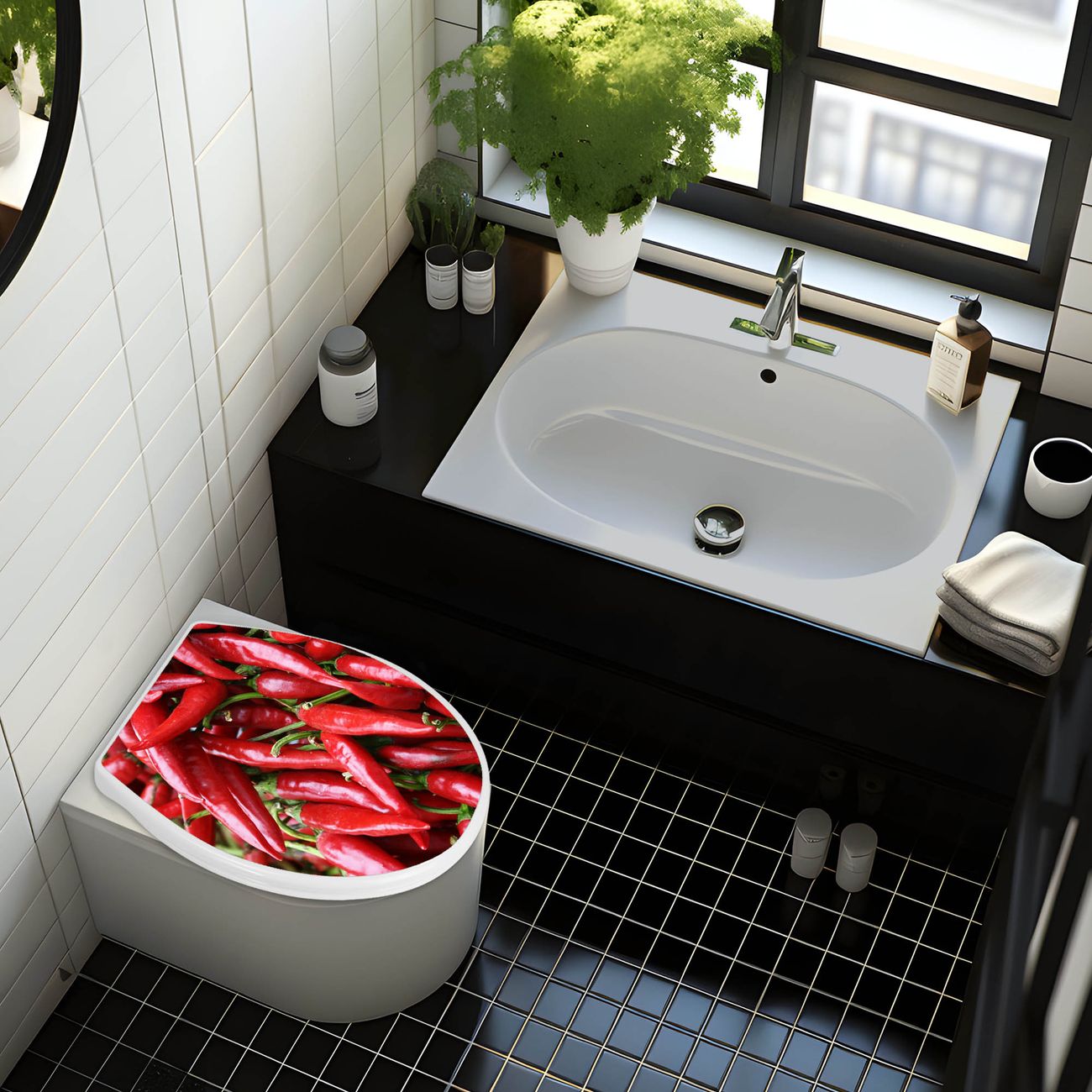 FUNKTION:Mit dem banjado Familien WC Sitz mit Absenkautomatik und dem Motiv Chilli verbinden Sie Design mit Funktionalität. Sie erhalten den Toilettendeckel in bewährt guter Qualität mit Montagematerial passend auf alle Euro-WC-Becken. Die Gesamtgröße beträgt 37cm x 44,5cm x 5cm, die Grundfarbe ist weiß.</p> DESIGN:Der Klodeckel in weiß mit Motiv Chilli hat eine ansprechende Optik, eine besondere Form und ist sehr stabil. Das Motiv besteht aus einer farbbrillianten Motivfolie, die durch ein Schutzlaminat zusätzlich vor Kratzern schützt. Der integrierte Kindersitz fügt sich harmonisch ein. DETAILS:Der Toilettensitz mit Soft Close besteht aus hochwertigem Polypropylen, ist geruchlos, ungiftig und kann mit handelsüblicher Seife gereinigt werden. Die Montage kann von von oben oder von unten erfolgen und ist kinderleicht. NUTZEN:Mit Hilfe der detaillierten Aufbauanleitung ermöglichen wir eine schnelle und unkomplizierte Montage. Die banjado Klobrille ist universell geeignet für alle Euro-WC-Schüsseln. Der Kindersitz kann unkompliziert entfernt werden. BANJADO:Ihr WC-Deckel wird in Sachsen in einer kleinen Manufaktur von Hand veredelt. Die Motivfolie ist lösungsmittelfrei und schutzlaminiert für einen langen Halt. Wir wünschen viel Freude bei der Auswahl eines schönen Motivs.