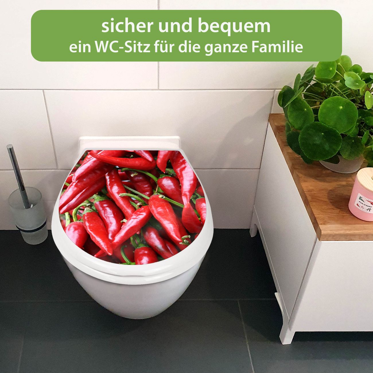 FUNKTION:Mit dem banjado Familien WC Sitz mit Absenkautomatik und dem Motiv Motiv Chilli verbinden Sie Design mit Funktionalität. Sie erhalten den Toilettendeckel in bewährt guter Qualität mit Montagematerial passend auf alle Euro-WC-Becken. Die Gesamtgröße beträgt 37,1cm x 44,9cm x 5cm, die Grundfarbe ist weiß.</p> DESIGN:Der Klodeckel in weiß mit Motiv Motiv Chilli hat eine ansprechende Optik, eine besondere Form und ist sehr stabil. Das Motiv besteht aus einer farbbrillianten Motivfolie, die durch ein Schutzlaminat zusätzlich vor Kratzern schützt. Der integrierte Kindersitz fügt sich harmonisch ein. DETAILS:Der Toilettensitz mit Soft Close besteht aus hochwertigem Polypropylen, ist geruchlos, ungiftig und kann mit handelsüblicher Seife gereinigt werden. Die Montage kann von von oben oder von unten erfolgen und ist kinderleicht. NUTZEN:Mit Hilfe der detaillierten Aufbauanleitung ermöglichen wir eine schnelle und unkomplizierte Montage. Die banjado Klobrille ist universell geeignet für alle Euro-WC-Schüsseln. Der Kindersitz kann unkompliziert entfernt werden. BANJADO:Ihr WC-Deckel wird in Sachsen in einer kleinen Manufaktur von Hand veredelt. Die Motivfolie ist lösungsmittelfrei und schutzlaminiert für einen langen Halt. Wir wünschen viel Freude bei der Auswahl eines schönen Motivs.