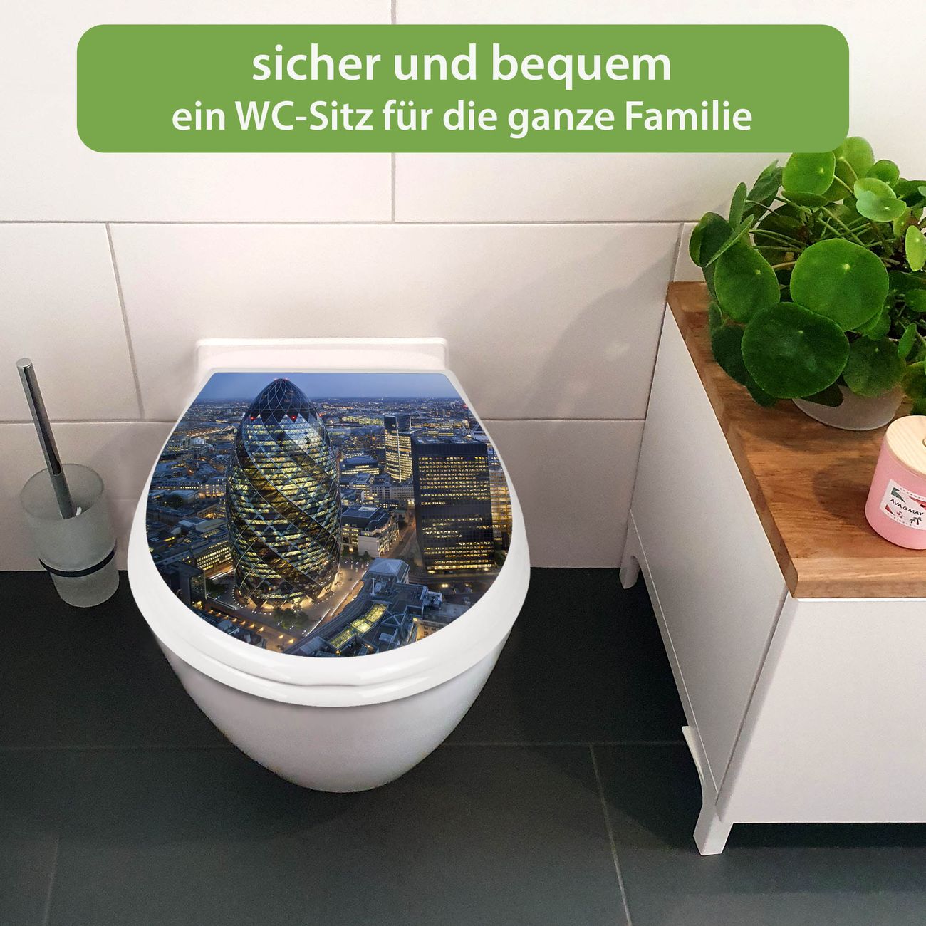FUNKTION:Mit dem banjado Familien WC Sitz mit Absenkautomatik und dem Motiv Motiv City Of London verbinden Sie Design mit Funktionalität. Sie erhalten den Toilettendeckel in bewährt guter Qualität mit Montagematerial passend auf alle Euro-WC-Becken. Die Gesamtgröße beträgt 37,1cm x 44,9cm x 5cm, die Grundfarbe ist weiß.</p> DESIGN:Der Klodeckel in weiß mit Motiv Motiv City Of London hat eine ansprechende Optik, eine besondere Form und ist sehr stabil. Das Motiv besteht aus einer farbbrillianten Motivfolie, die durch ein Schutzlaminat zusätzlich vor Kratzern schützt. Der integrierte Kindersitz fügt sich harmonisch ein. DETAILS:Der Toilettensitz mit Soft Close besteht aus hochwertigem Polypropylen, ist geruchlos, ungiftig und kann mit handelsüblicher Seife gereinigt werden. Die Montage kann von von oben oder von unten erfolgen und ist kinderleicht. NUTZEN:Mit Hilfe der detaillierten Aufbauanleitung ermöglichen wir eine schnelle und unkomplizierte Montage. Die banjado Klobrille ist universell geeignet für alle Euro-WC-Schüsseln. Der Kindersitz kann unkompliziert entfernt werden. BANJADO:Ihr WC-Deckel wird in Sachsen in einer kleinen Manufaktur von Hand veredelt. Die Motivfolie ist lösungsmittelfrei und schutzlaminiert für einen langen Halt. Wir wünschen viel Freude bei der Auswahl eines schönen Motivs.