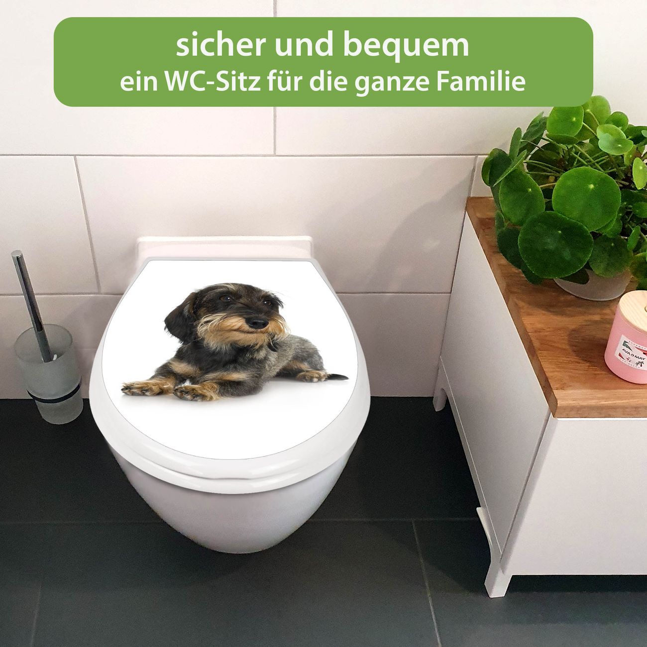 FUNKTION:Mit dem banjado Familien WC Sitz mit Absenkautomatik und dem Motiv Motiv Dackel verbinden Sie Design mit Funktionalität. Sie erhalten den Toilettendeckel in bewährt guter Qualität mit Montagematerial passend auf alle Euro-WC-Becken. Die Gesamtgröße beträgt 37,1cm x 44,9cm x 5cm, die Grundfarbe ist weiß.</p> DESIGN:Der Klodeckel in weiß mit Motiv Motiv Dackel hat eine ansprechende Optik, eine besondere Form und ist sehr stabil. Das Motiv besteht aus einer farbbrillianten Motivfolie, die durch ein Schutzlaminat zusätzlich vor Kratzern schützt. Der integrierte Kindersitz fügt sich harmonisch ein. DETAILS:Der Toilettensitz mit Soft Close besteht aus hochwertigem Polypropylen, ist geruchlos, ungiftig und kann mit handelsüblicher Seife gereinigt werden. Die Montage kann von von oben oder von unten erfolgen und ist kinderleicht. NUTZEN:Mit Hilfe der detaillierten Aufbauanleitung ermöglichen wir eine schnelle und unkomplizierte Montage. Die banjado Klobrille ist universell geeignet für alle Euro-WC-Schüsseln. Der Kindersitz kann unkompliziert entfernt werden. BANJADO:Ihr WC-Deckel wird in Sachsen in einer kleinen Manufaktur von Hand veredelt. Die Motivfolie ist lösungsmittelfrei und schutzlaminiert für einen langen Halt. Wir wünschen viel Freude bei der Auswahl eines schönen Motivs.
