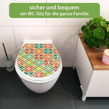FUNKTION:Mit dem banjado Familien WC Sitz mit Absenkautomatik und dem Motiv Motiv Diamant Muster verbinden Sie Design mit Funktionalität. Sie erhalten den Toilettendeckel in bewährt guter Qualität mit Montagematerial passend auf alle Euro-WC-Becken. Die Gesamtgröße beträgt 37,1cm x 44,9cm x 5cm, die Grundfarbe ist weiß.</p> DESIGN:Der Klodeckel in weiß mit Motiv Motiv Diamant Muster hat eine ansprechende Optik, eine besondere Form und ist sehr stabil. Das Motiv besteht aus einer farbbrillianten Motivfolie, die durch ein Schutzlaminat zusätzlich vor Kratzern schützt. Der integrierte Kindersitz fügt sich harmonisch ein. DETAILS:Der Toilettensitz mit Soft Close besteht aus hochwertigem Polypropylen, ist geruchlos, ungiftig und kann mit handelsüblicher Seife gereinigt werden. Die Montage kann von von oben oder von unten erfolgen und ist kinderleicht. NUTZEN:Mit Hilfe der detaillierten Aufbauanleitung ermöglichen wir eine schnelle und unkomplizierte Montage. Die banjado Klobrille ist universell geeignet für alle Euro-WC-Schüsseln. Der Kindersitz kann unkompliziert entfernt werden. BANJADO:Ihr WC-Deckel wird in Sachsen in einer kleinen Manufaktur von Hand veredelt. Die Motivfolie ist lösungsmittelfrei und schutzlaminiert für einen langen Halt. Wir wünschen viel Freude bei der Auswahl eines schönen Motivs.
